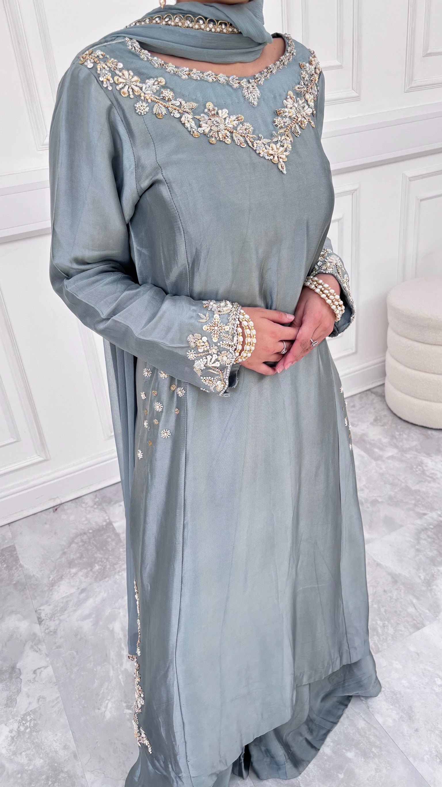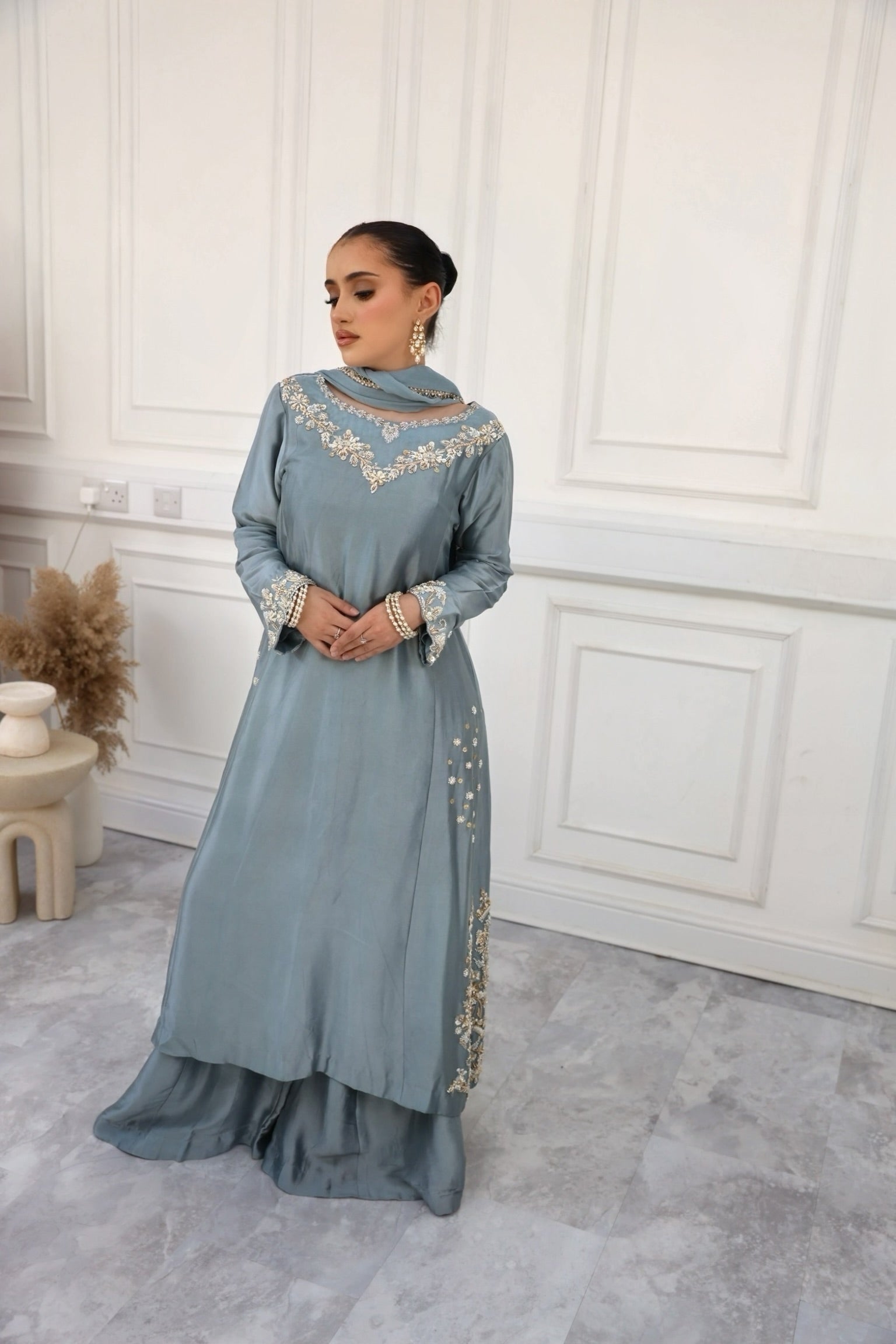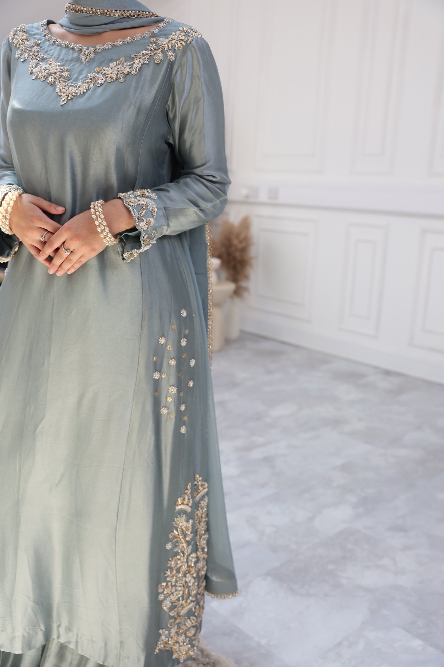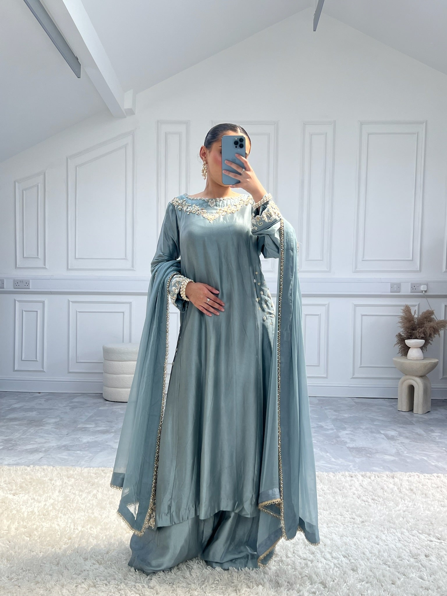Long dusky blue A-line sheesh silk kameez with chiffon dupatta and panelled sheesh silk sharara.