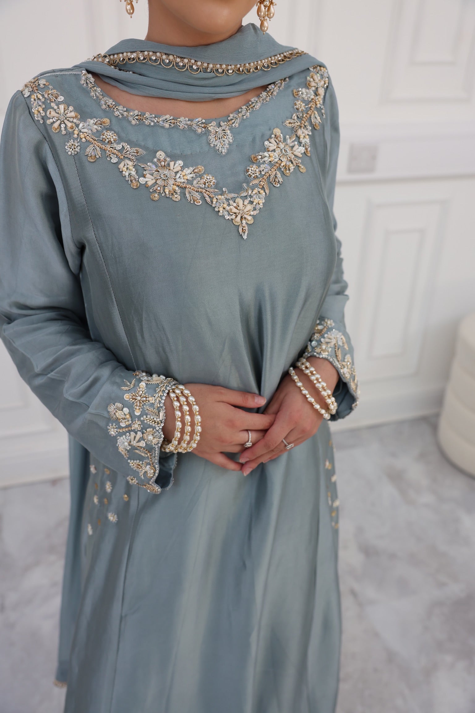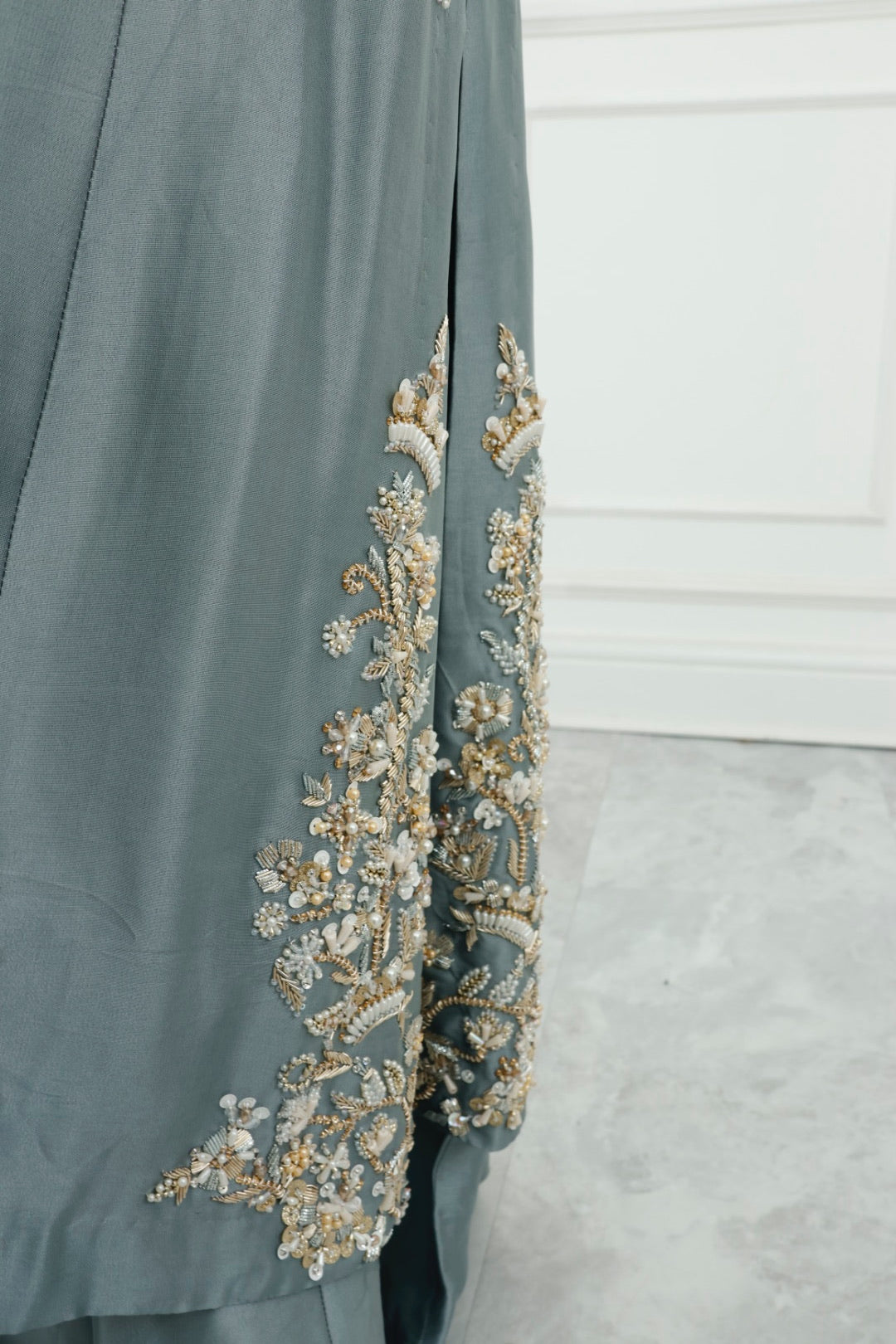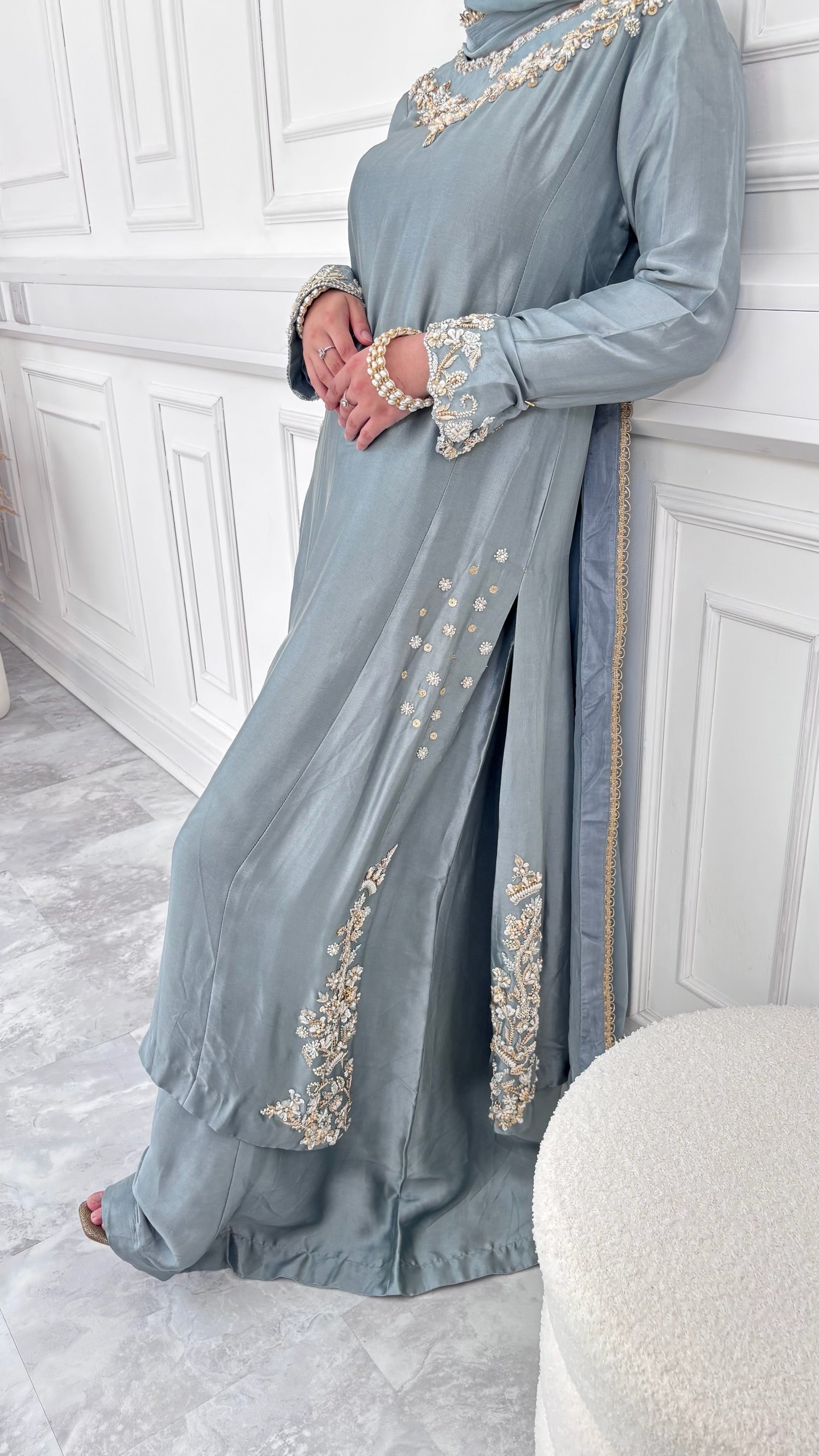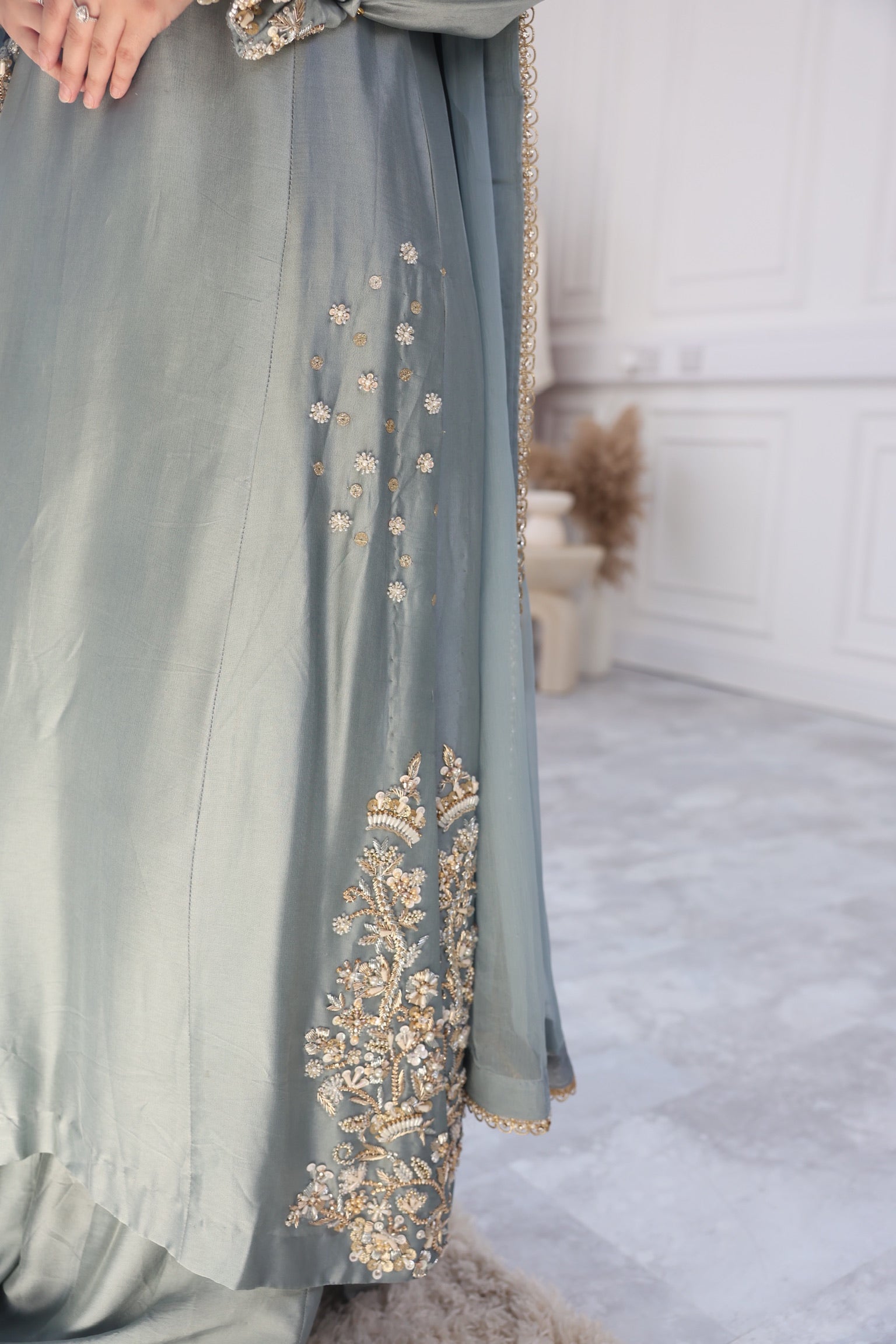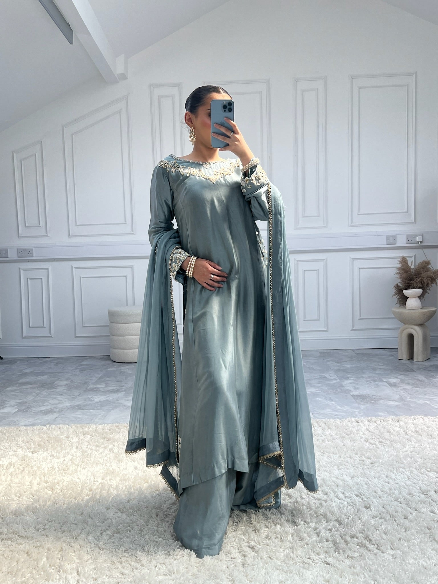 Long dusky blue A-line sheesh silk kameez with chiffon dupatta and panelled sheesh silk sharara.