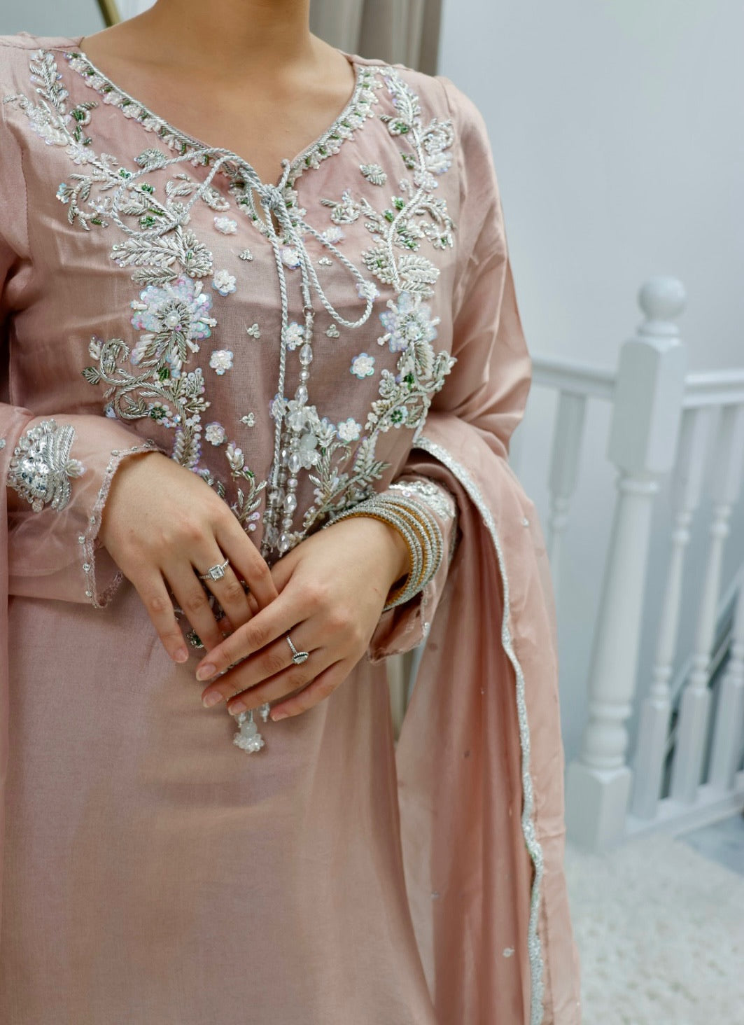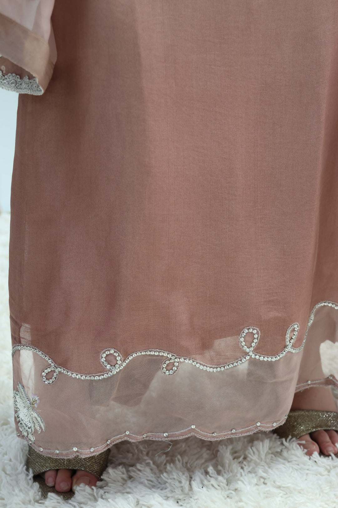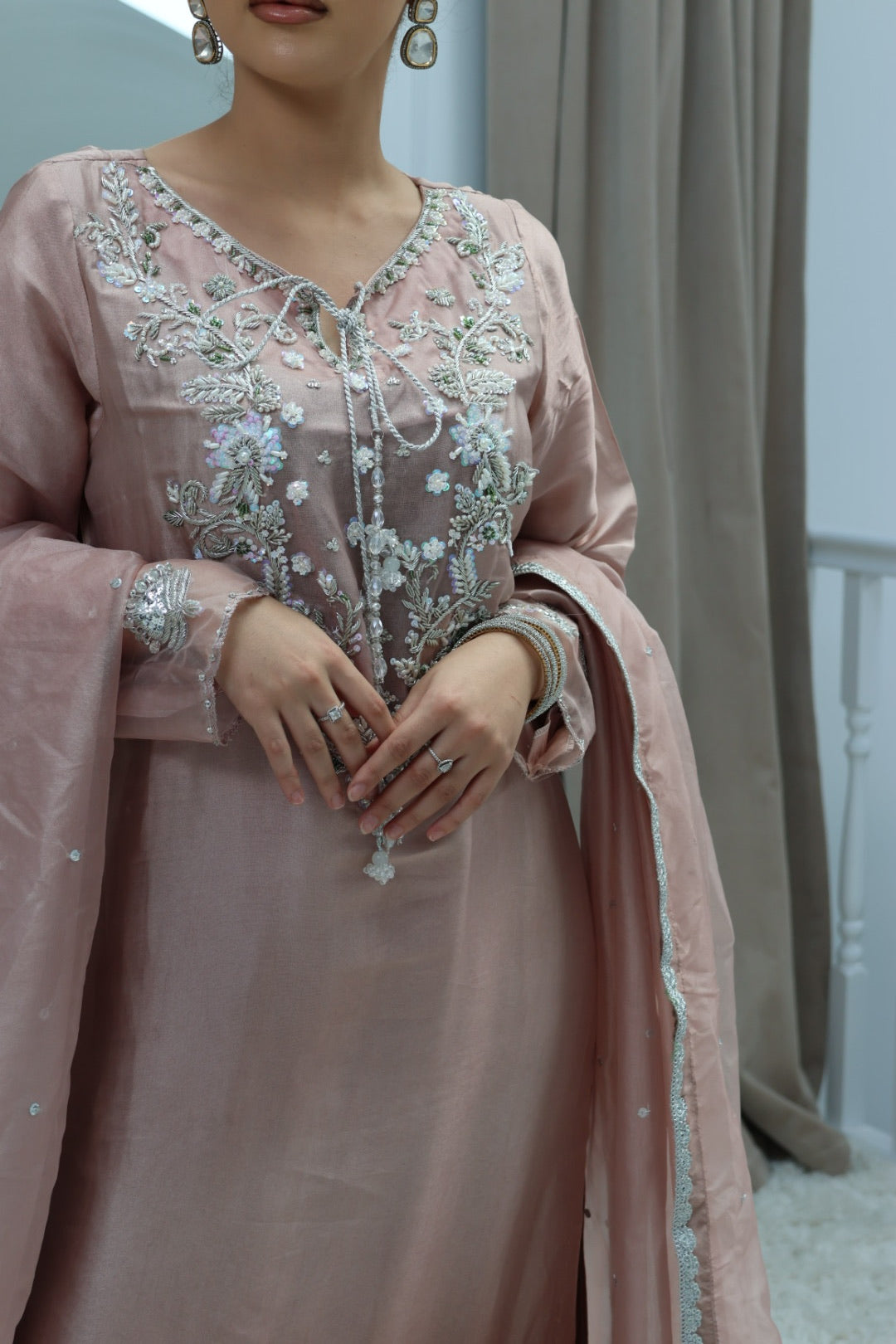 Dusky pink sheesh silk embellished kameez with organza appliqued embellishment on sleeves and Daman paired with straight trouser.
