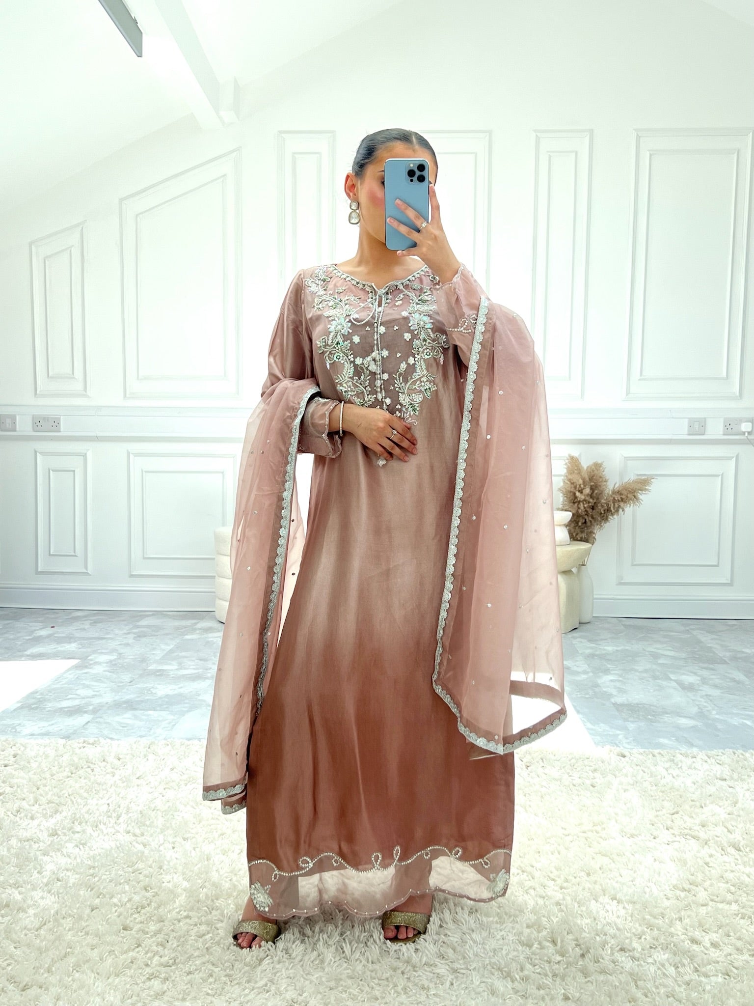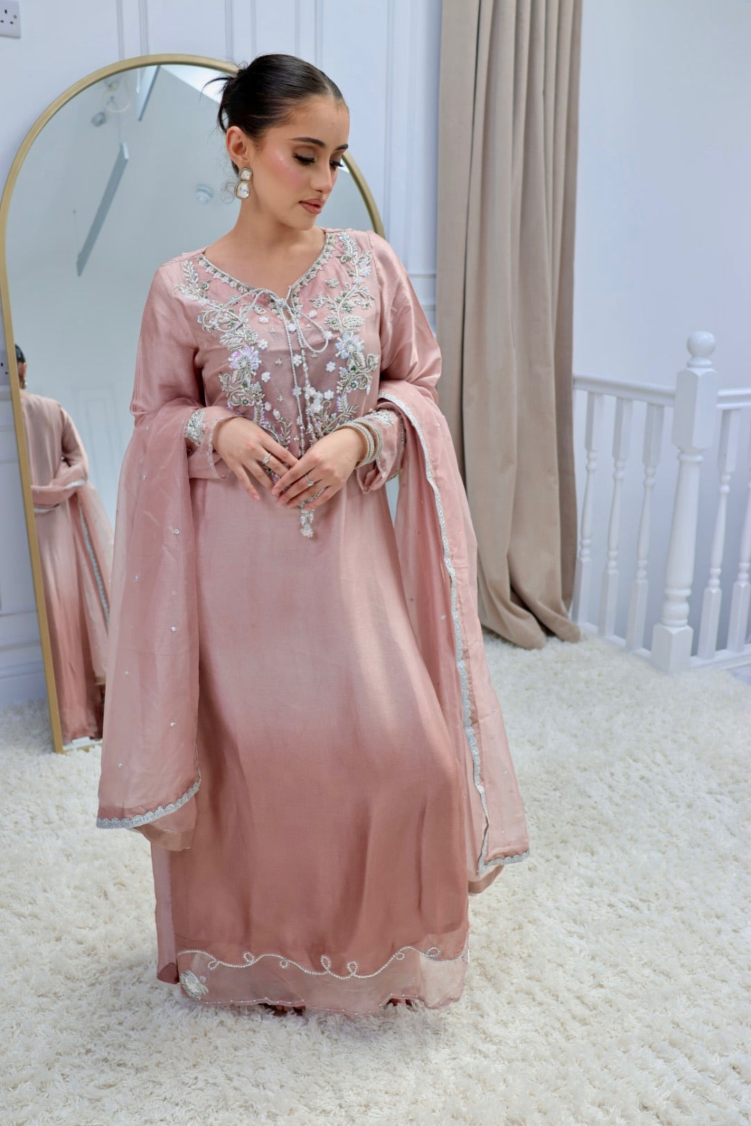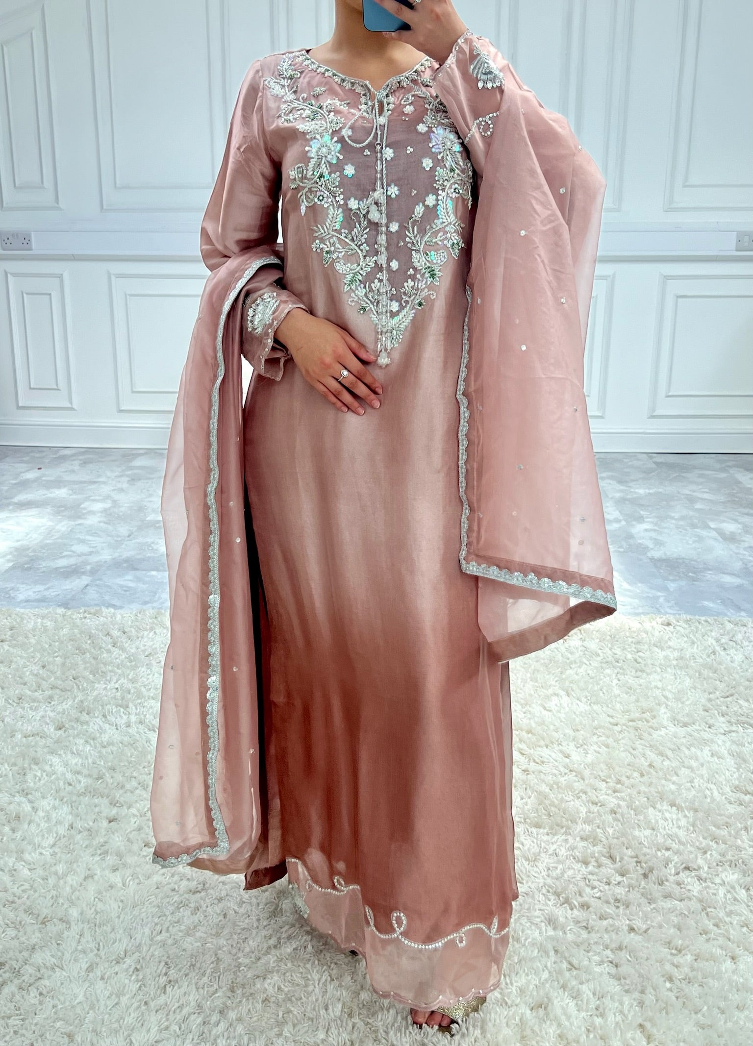 Dusky pink sheesh silk embellished kameez with organza appliqued embellishment on sleeves and Daman paired with straight trouser.