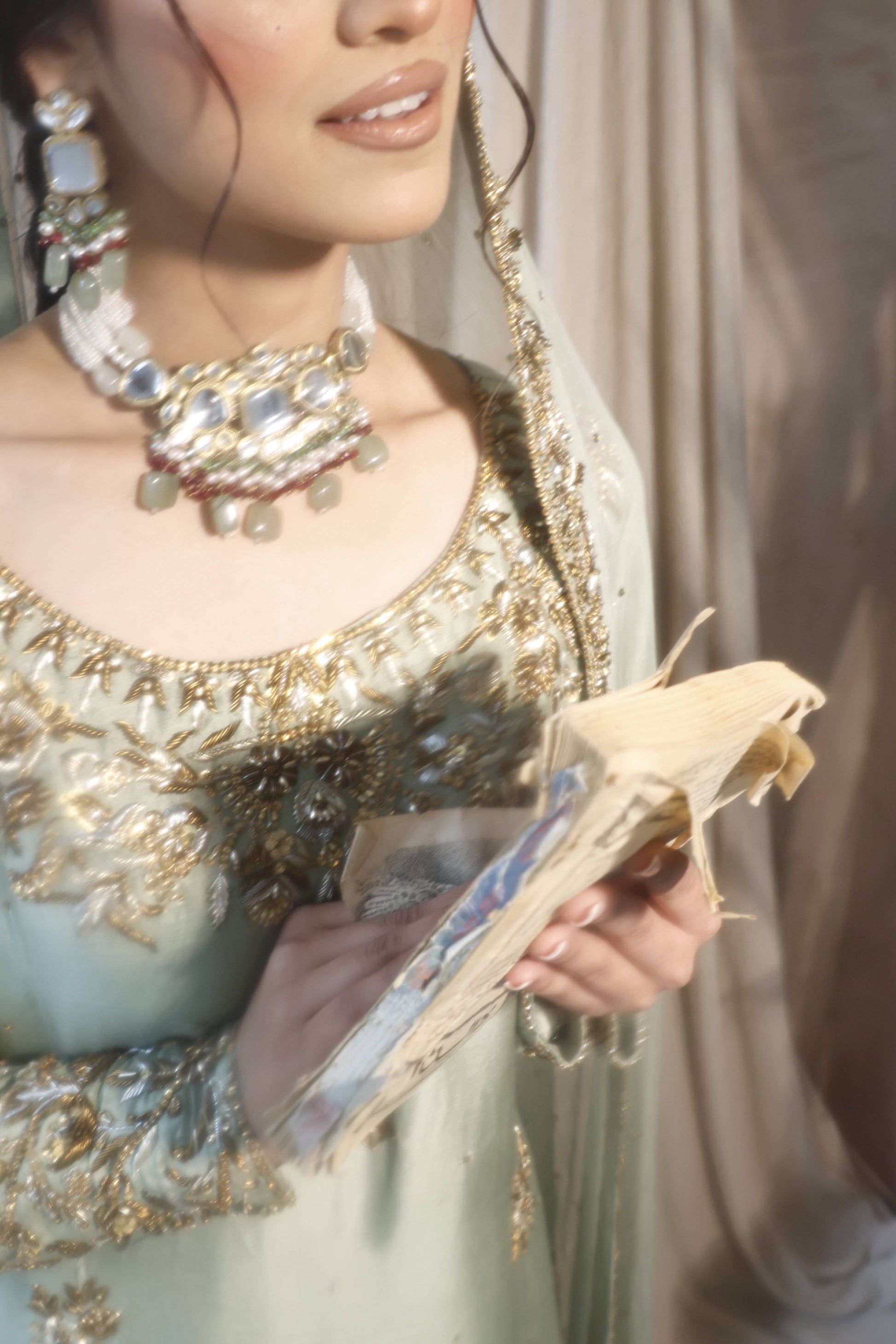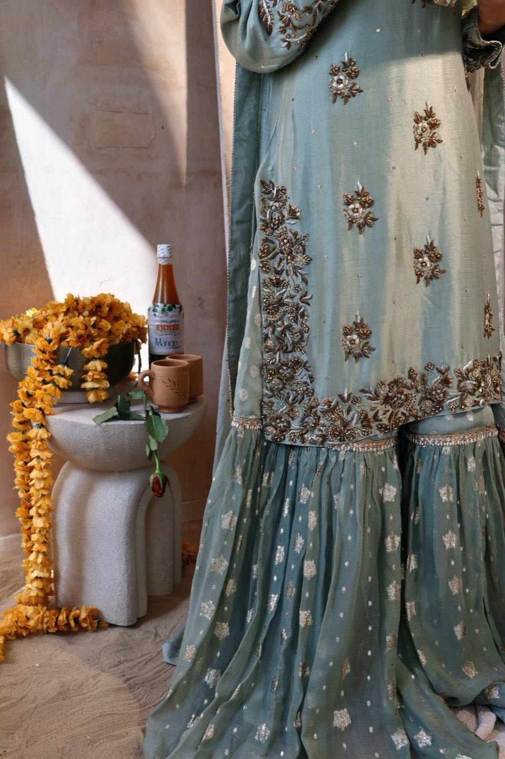 A stunning Mint Sheesh silk kameez richly hand embellished, paired with a Banarsi chiffon farshi gharara featuring intricate detailing. The look is completed with a chiffon dupatta adorned with a hand embellished border and scatter work perfect for Nikkah brides or bridesmaids seeking refined elegance.
