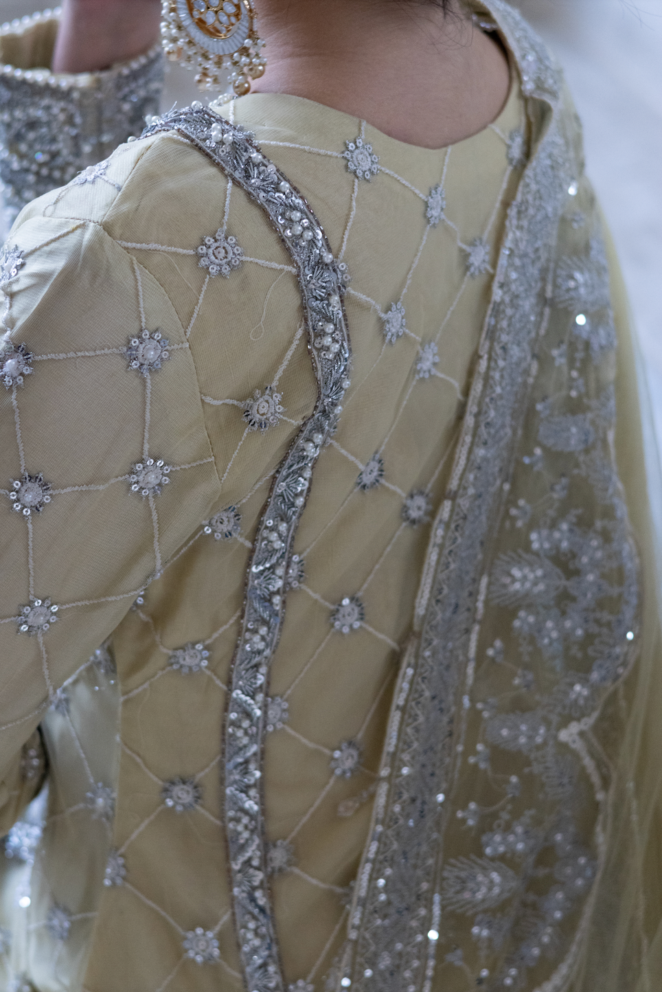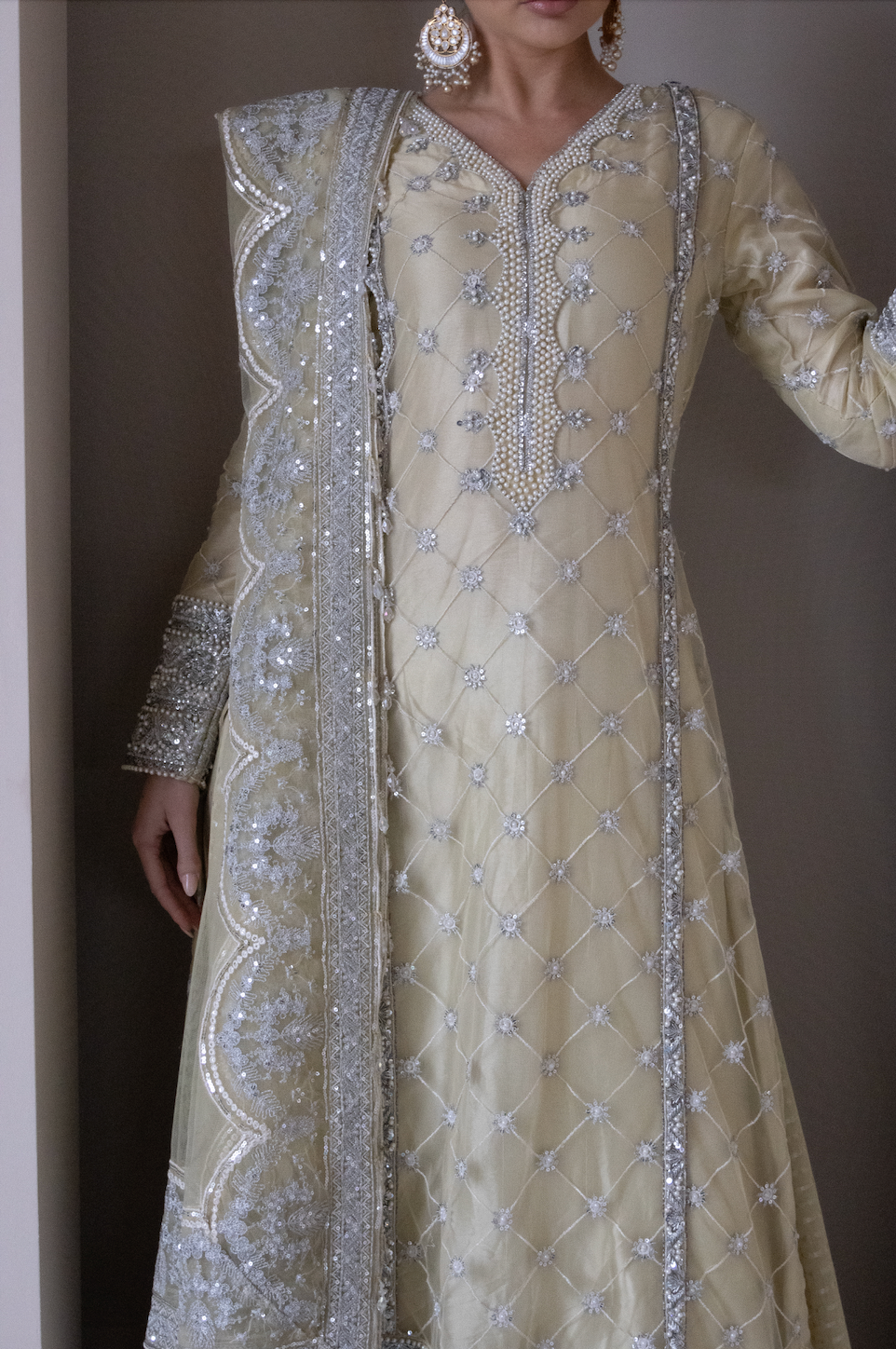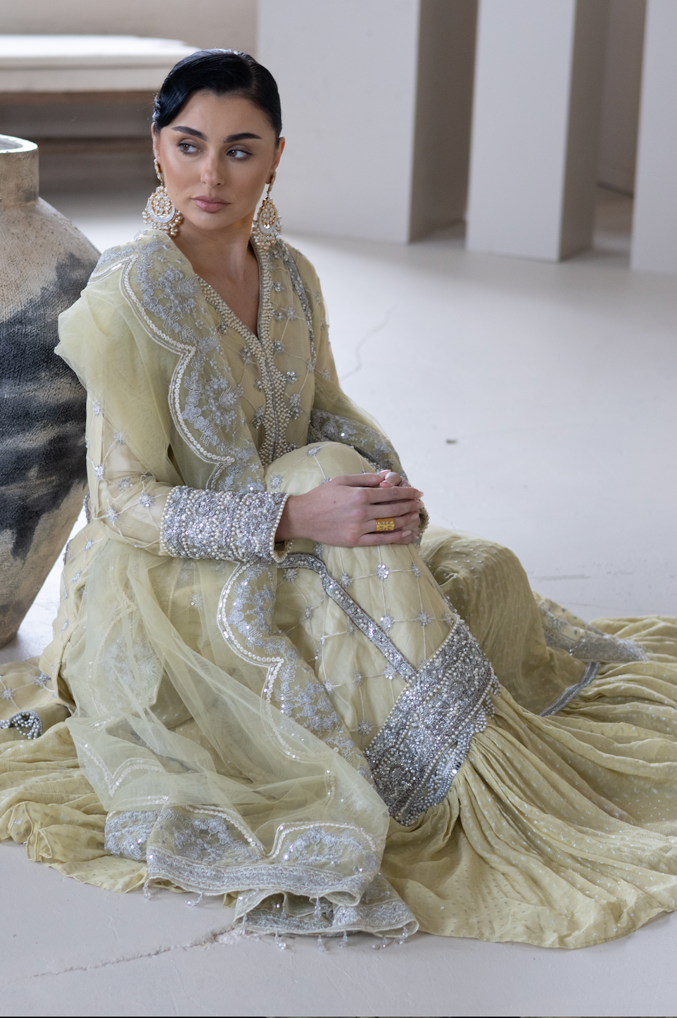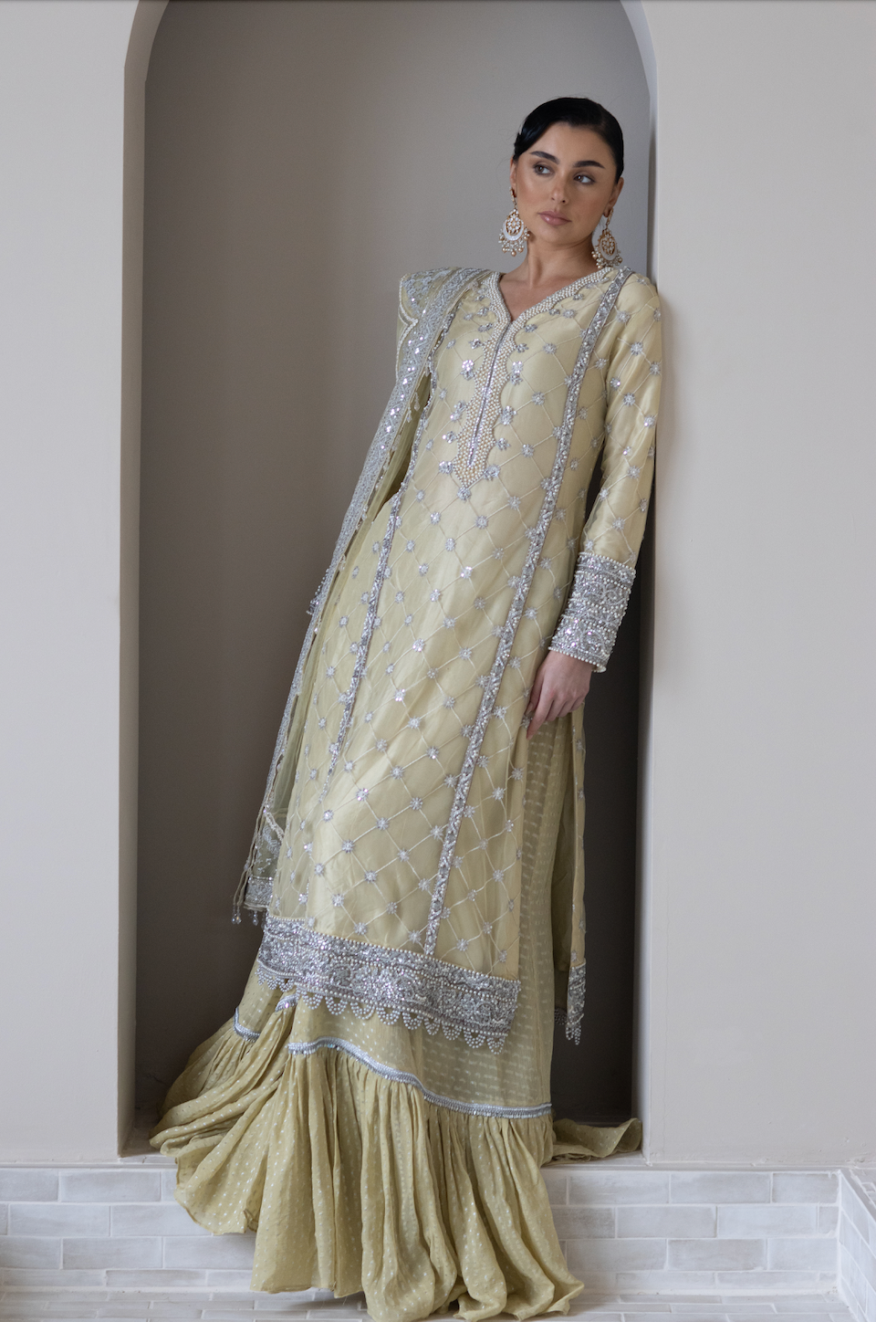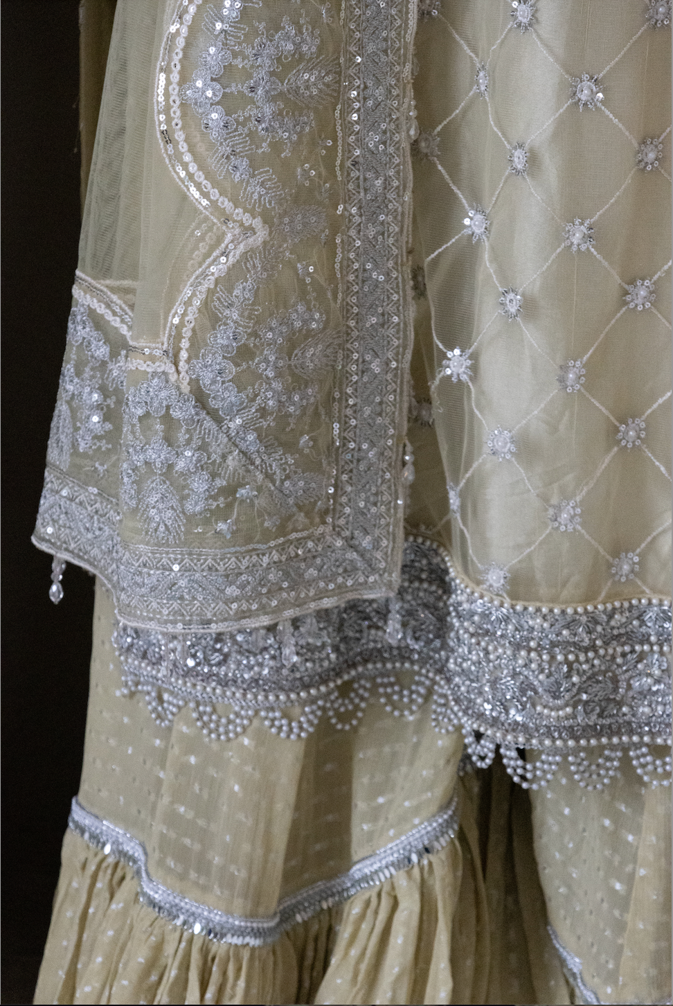 Paired with a flowing chiffon Boti Gharara, blending classic charm with modern sophistication. The set is completed with an embellished net dupatta, enhancing its grace and making it the perfect choice for any special occasion.