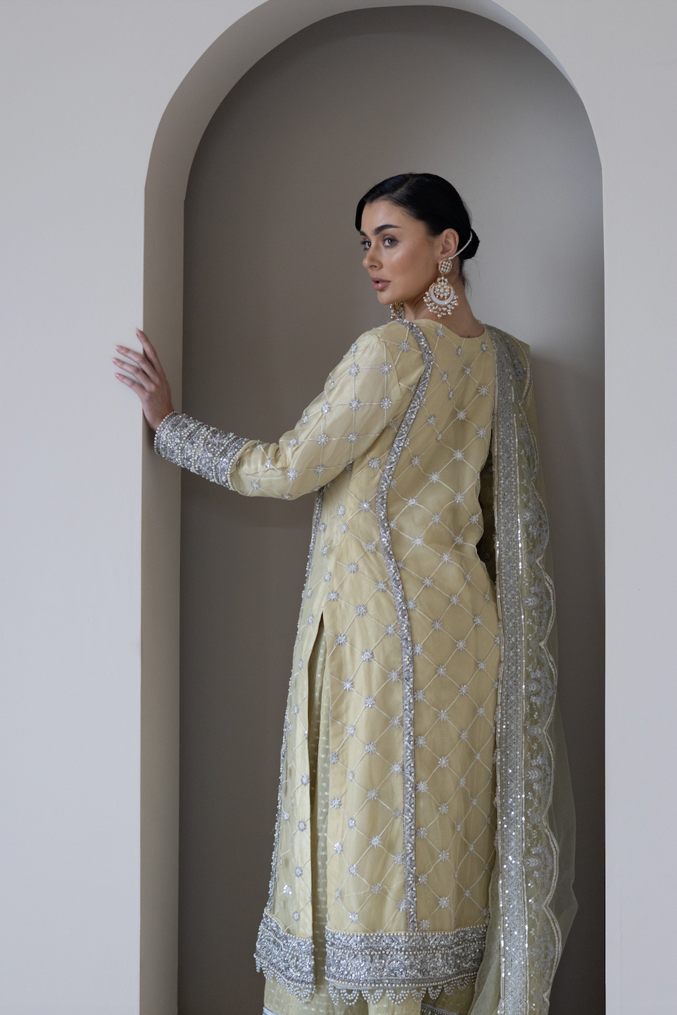Elevate your wardrobe with our Bellflower lemon net kameez, a stunning fusion of traditional elegance and contemporary flair. Crafted from luxurious net fabric, this exquisite design features intricate embellishments along the front border, sleeves, and neckline, adding a touch of opulence to every detail.