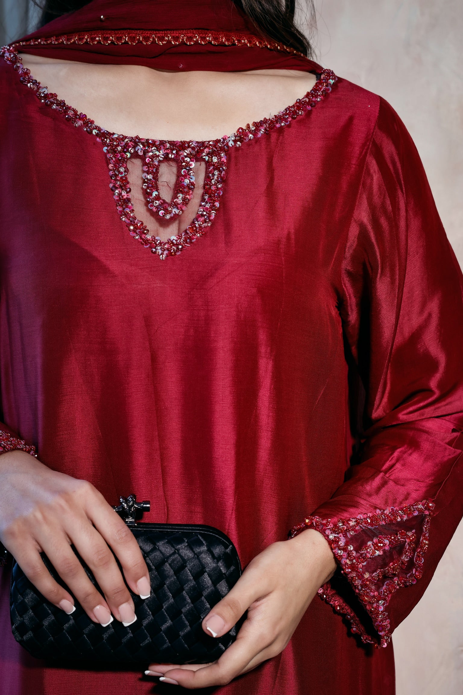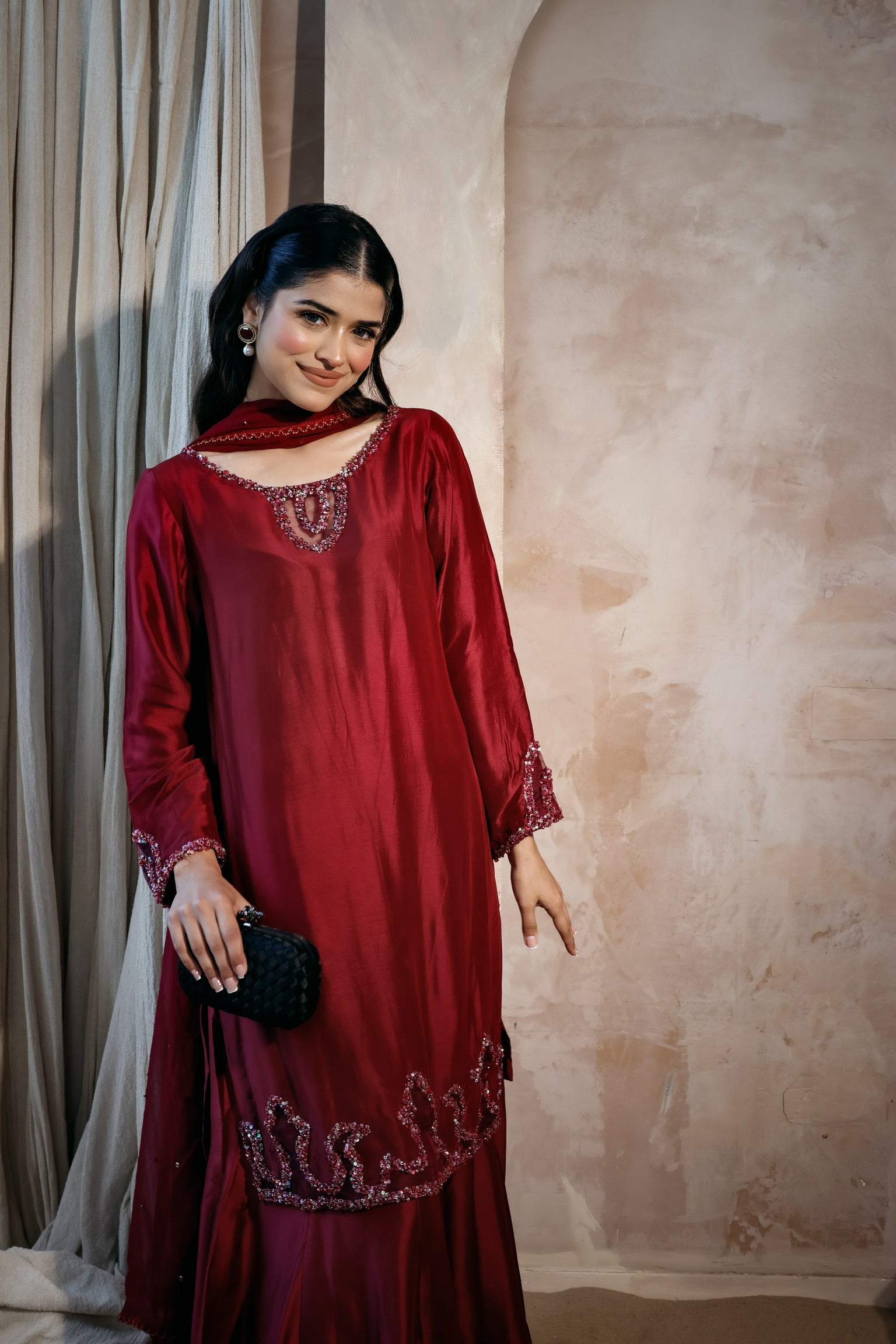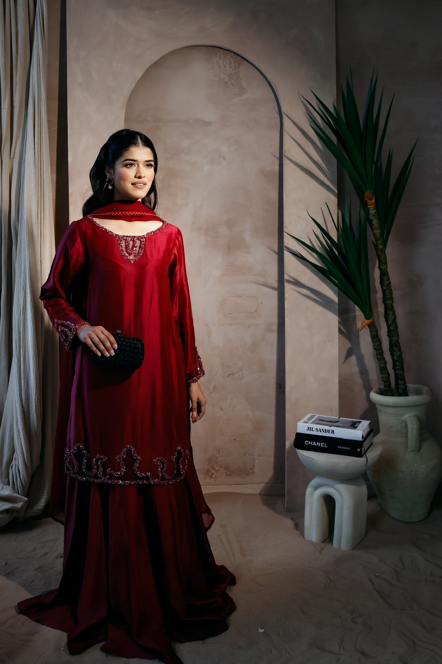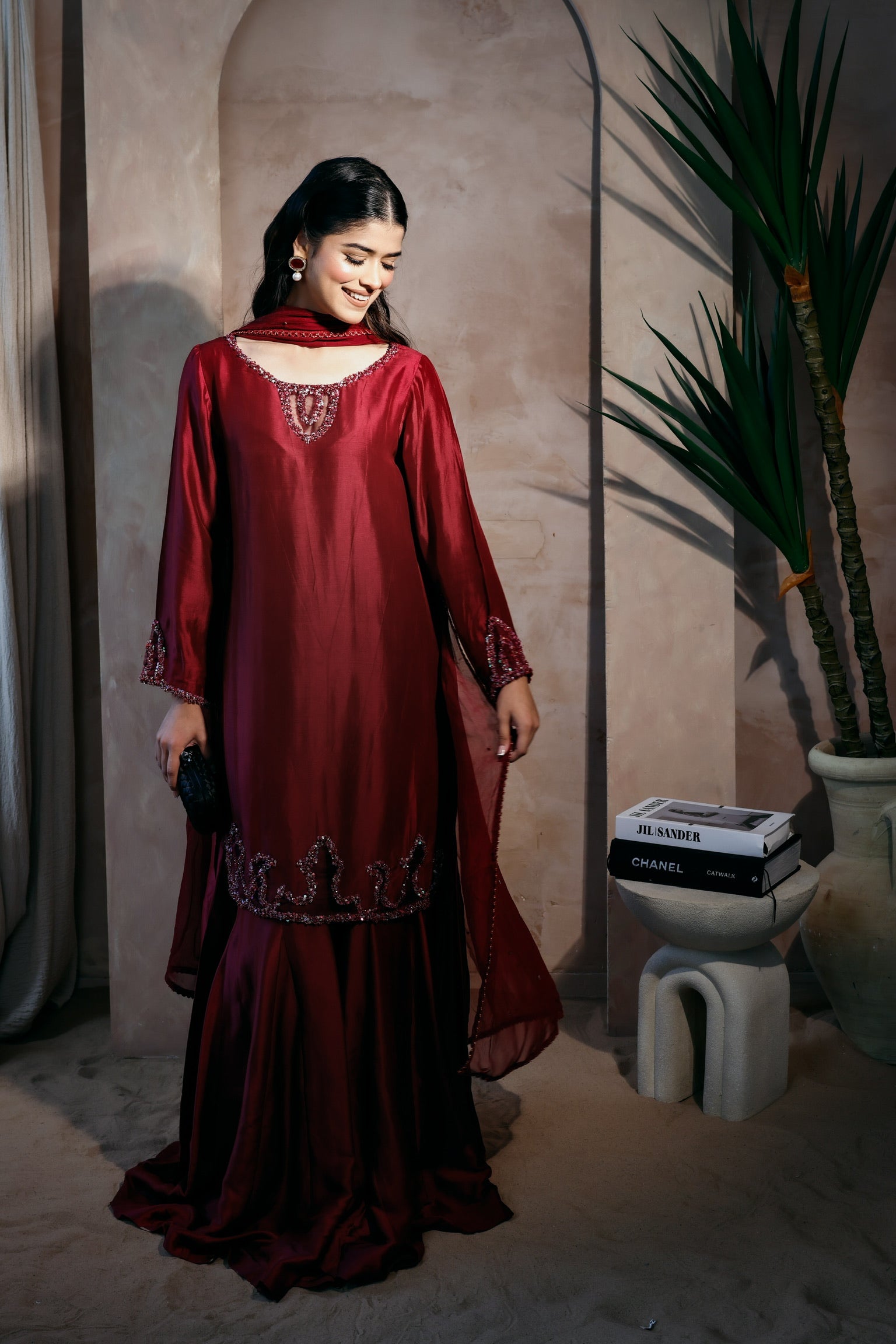 Berry Sheesh Silk 3-Piece Kameez with Flared Sharara & Chiffon Dupatta