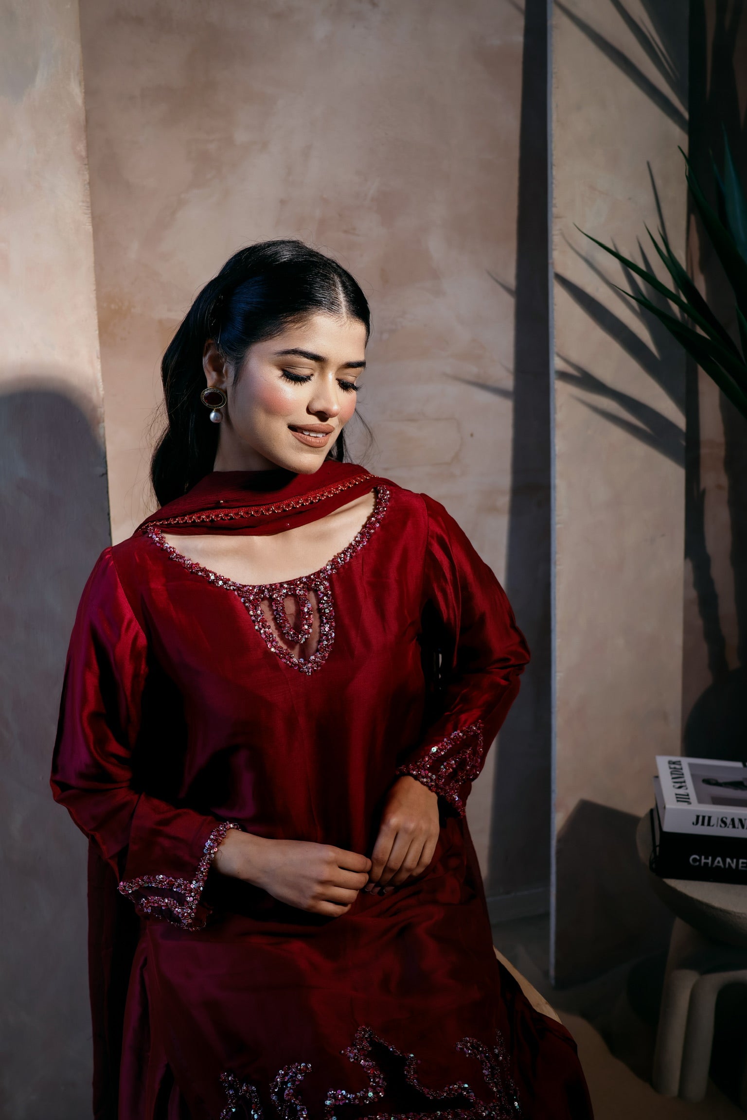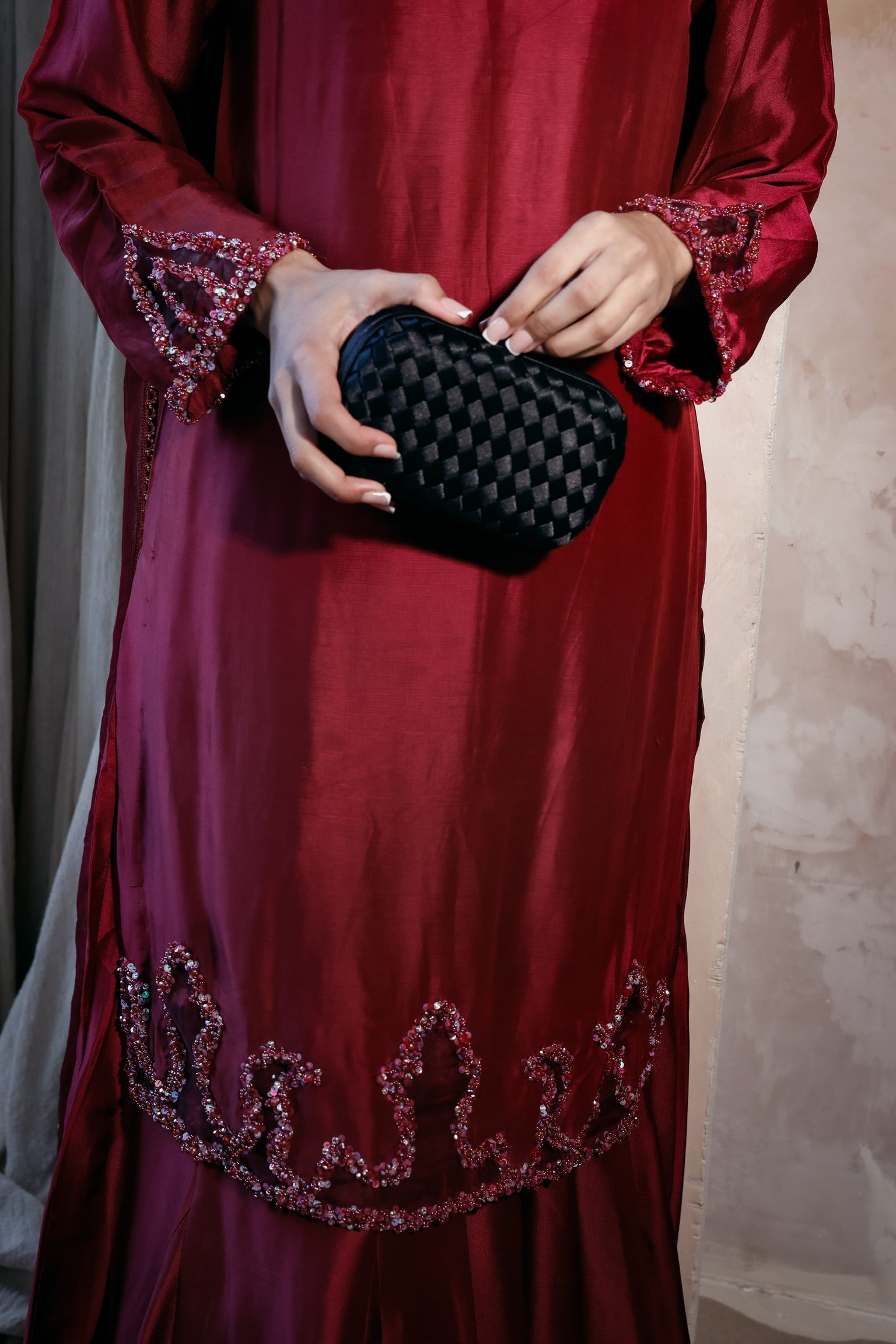 Step into timeless elegance with this berry-toned Sheesh silk ensemble. The straight-cut kameez is beautifully enhanced with handmade detailing on the neckline, sleeves, and border, offering a refined yet statement look. It is paired with a panelled, flared sharara in matching Sheesh silk, designed for graceful flow and volume.