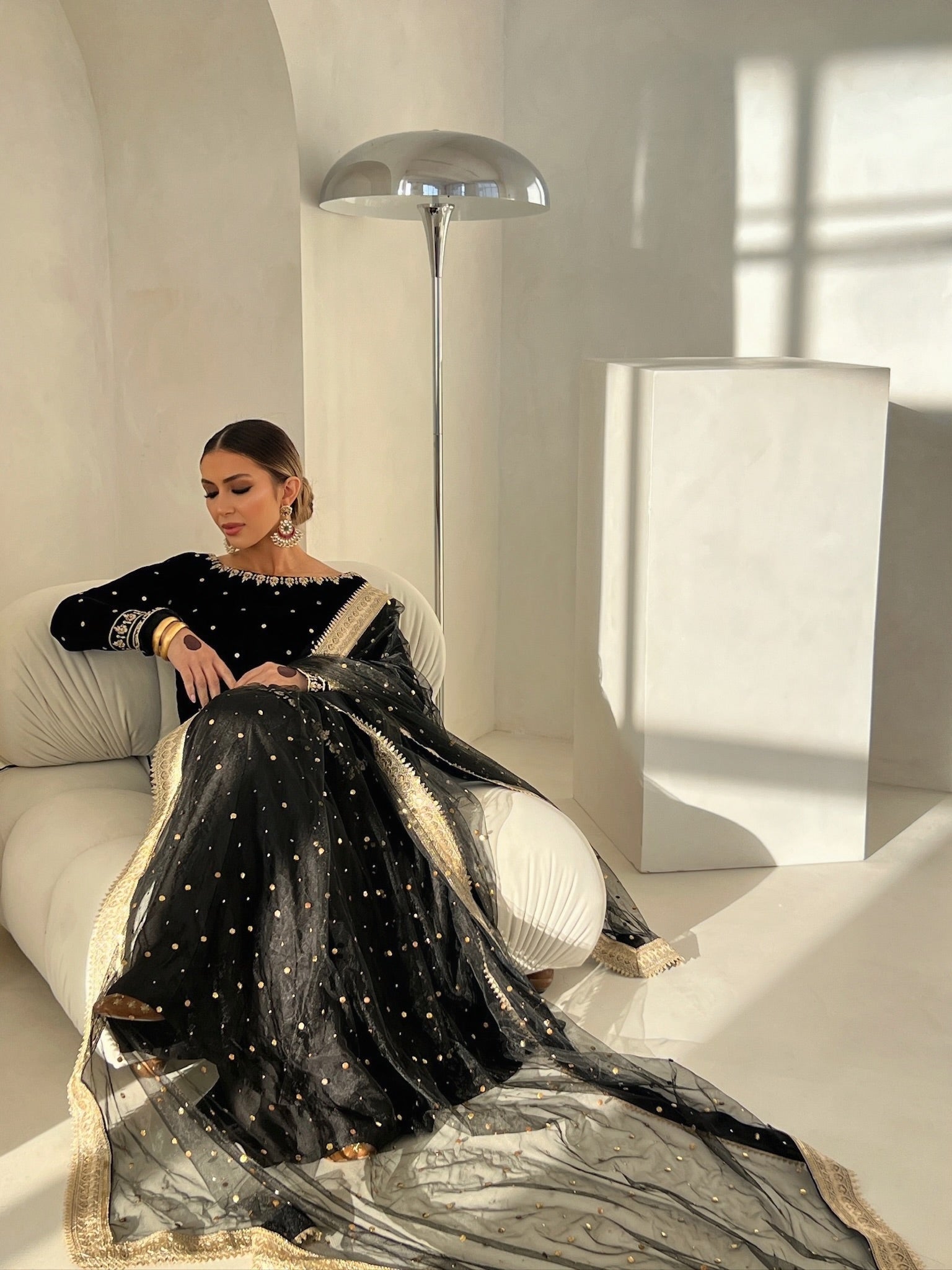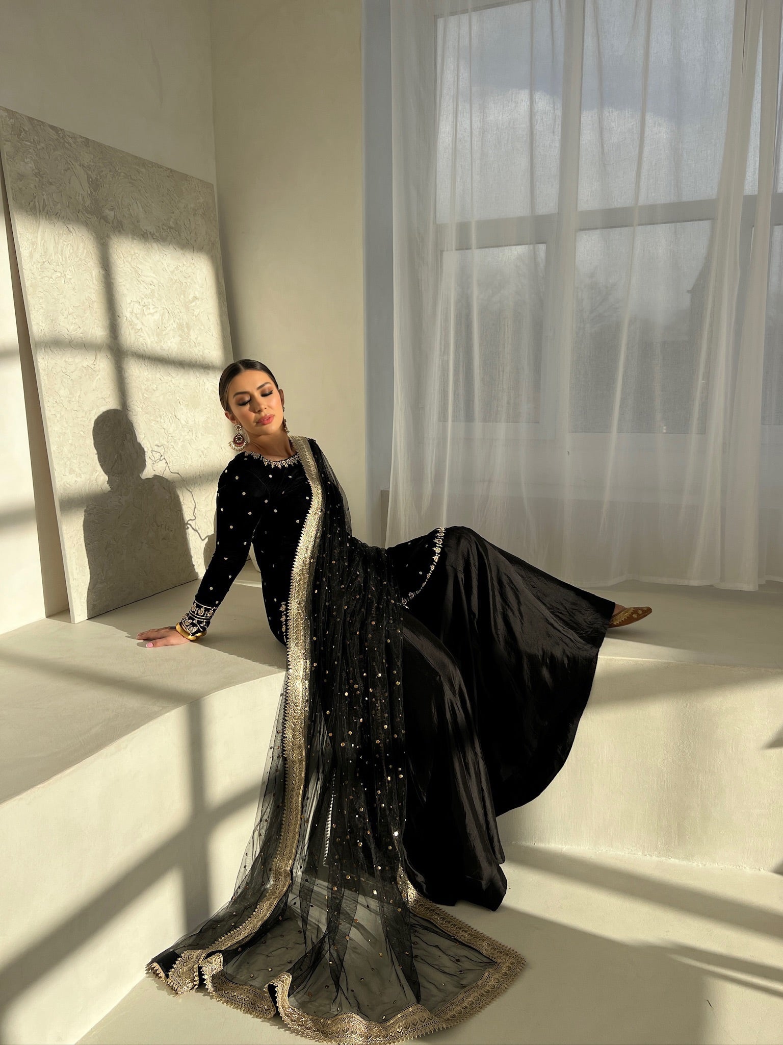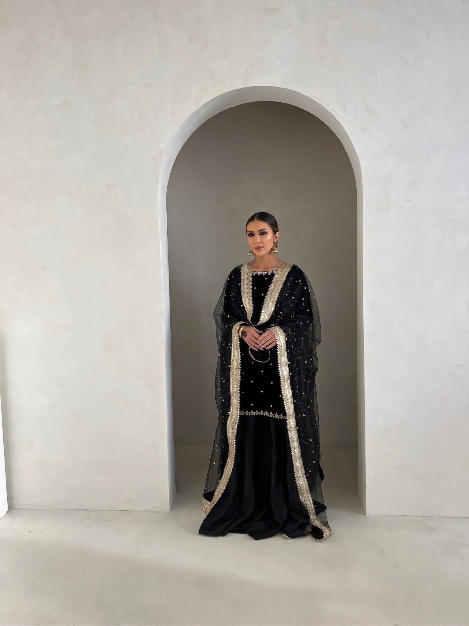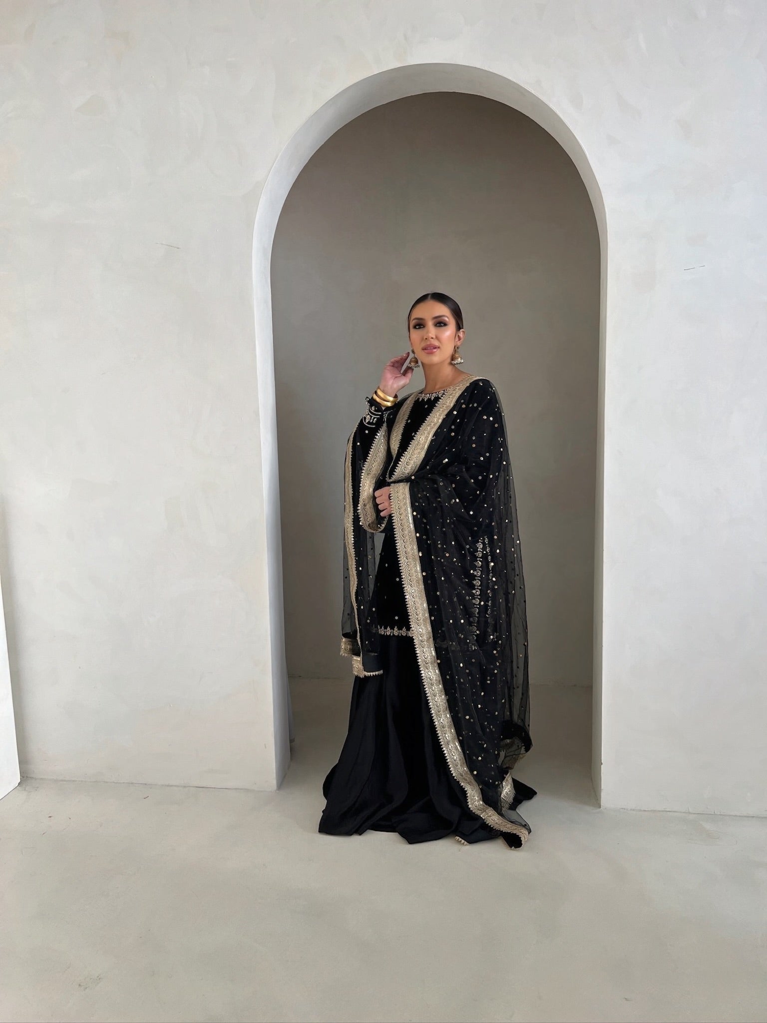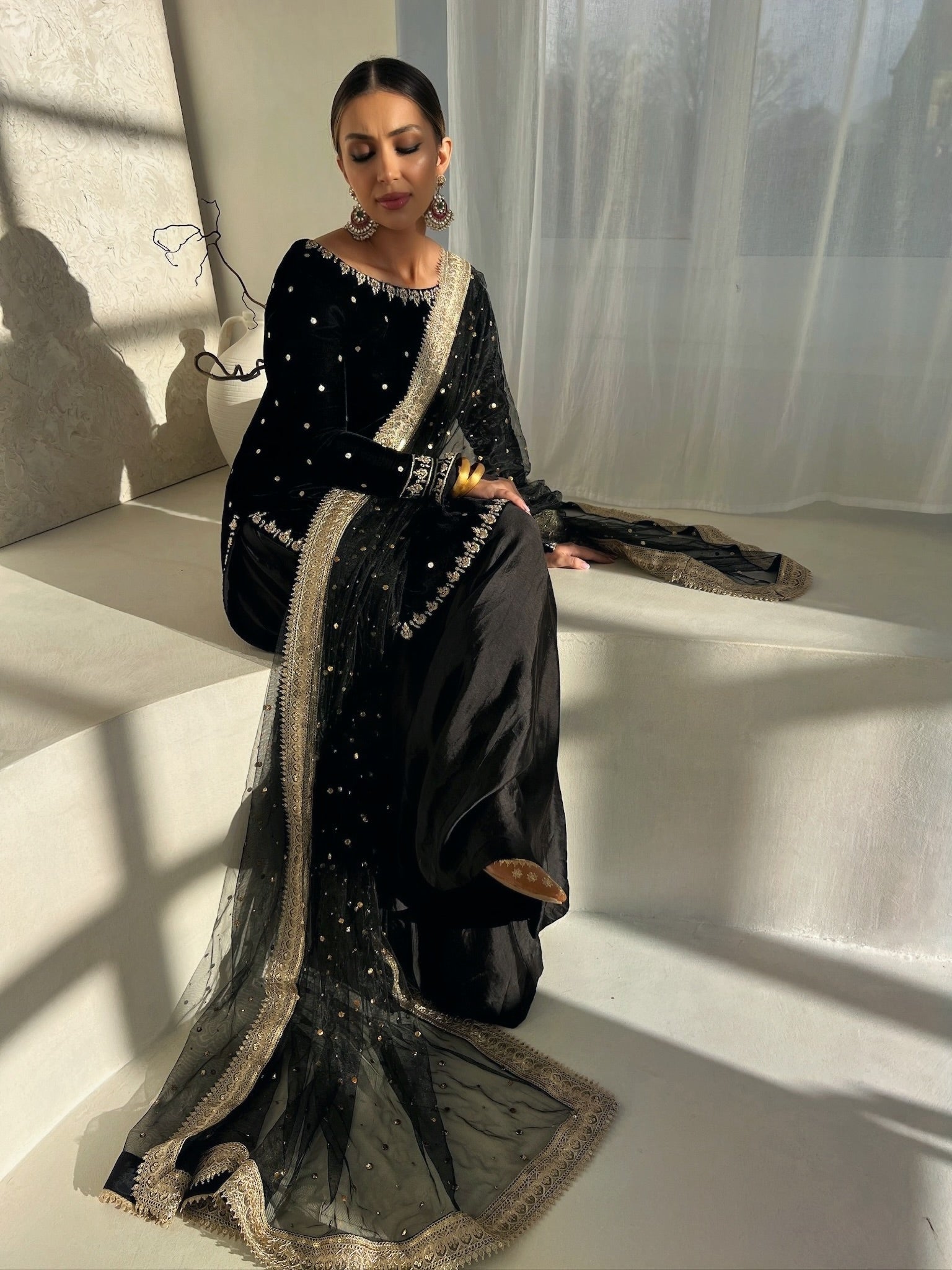 Black velvet kameez with intricate detailing on neckline and side seam, complimented with a scatter of daman embroidery