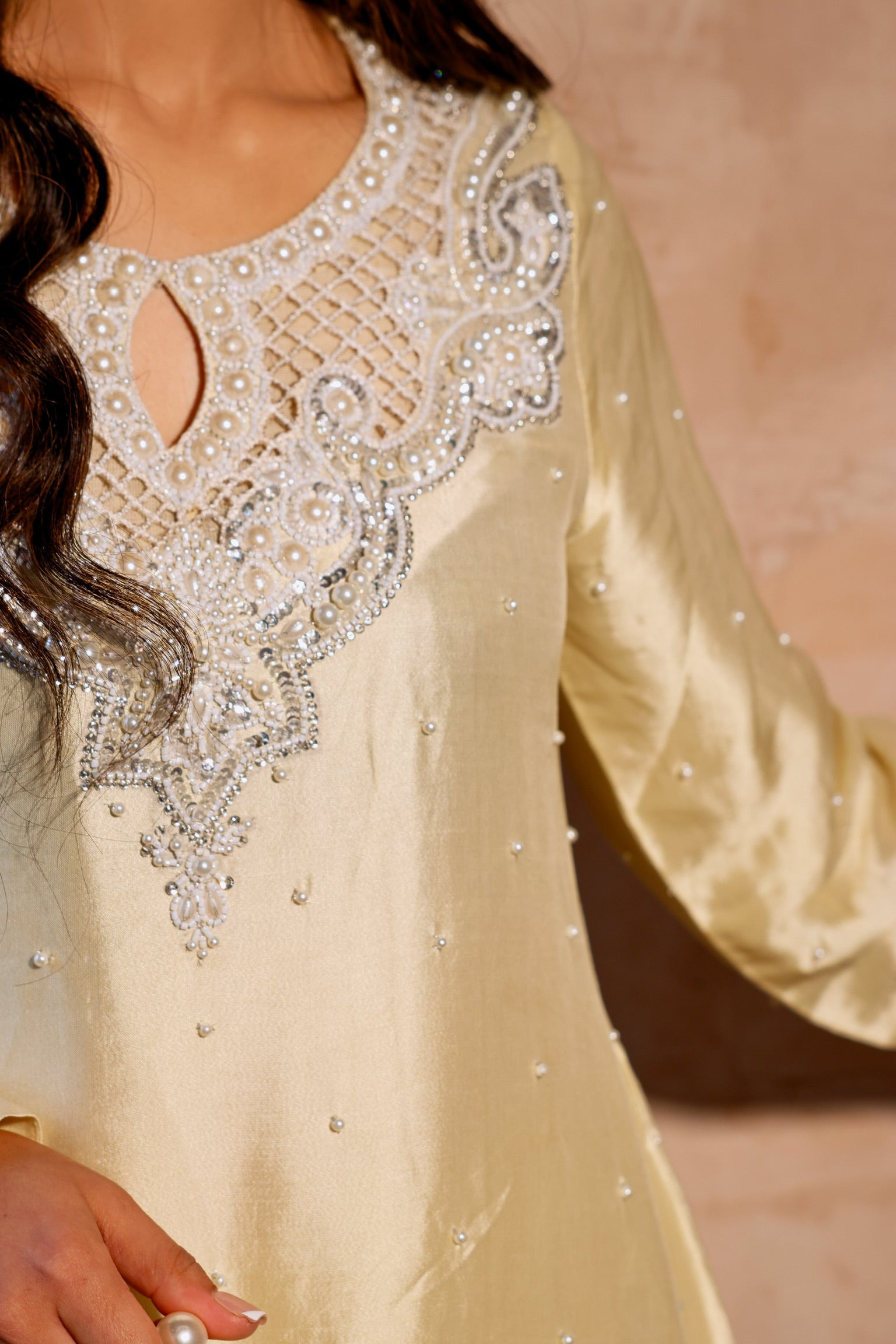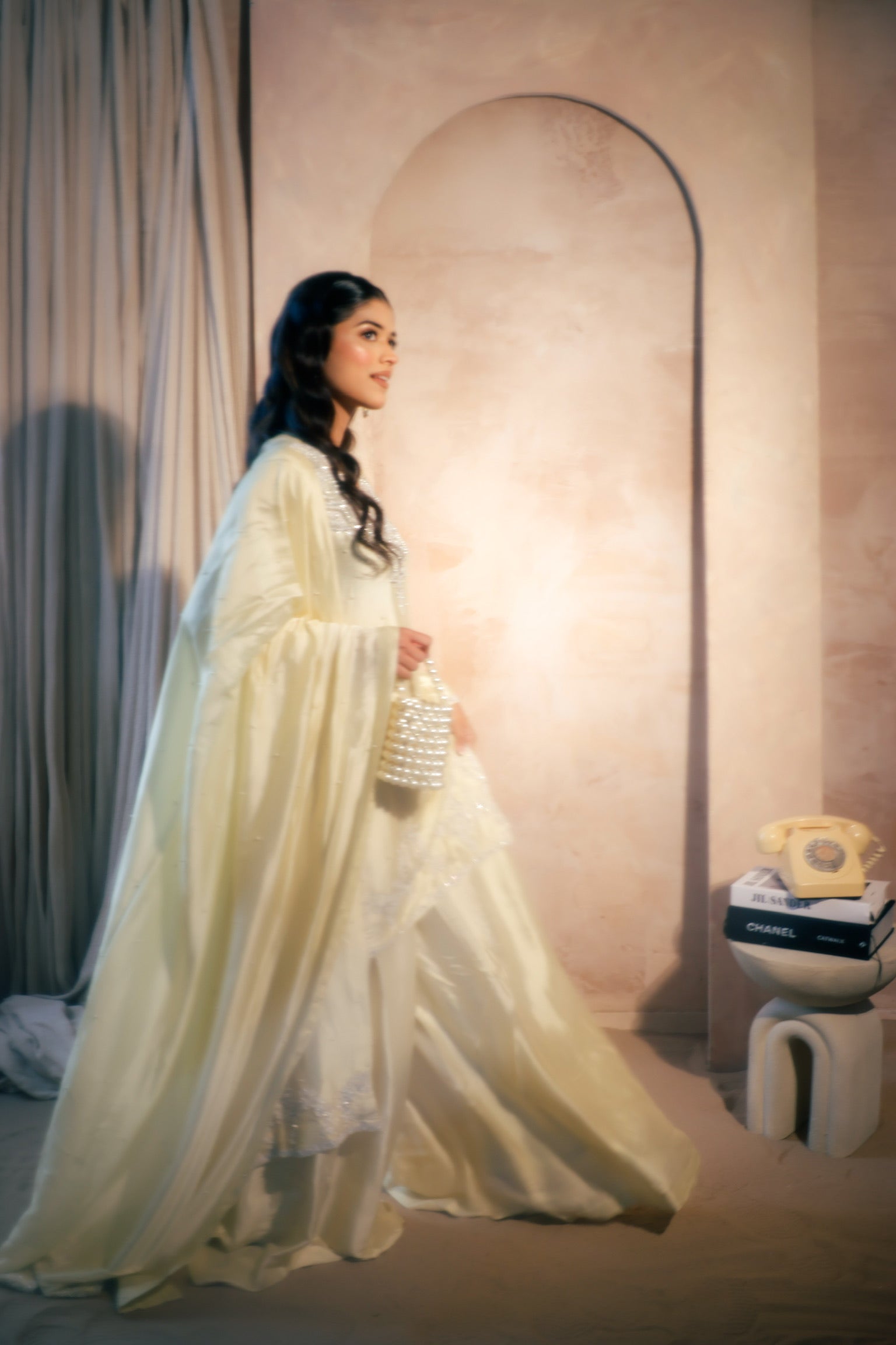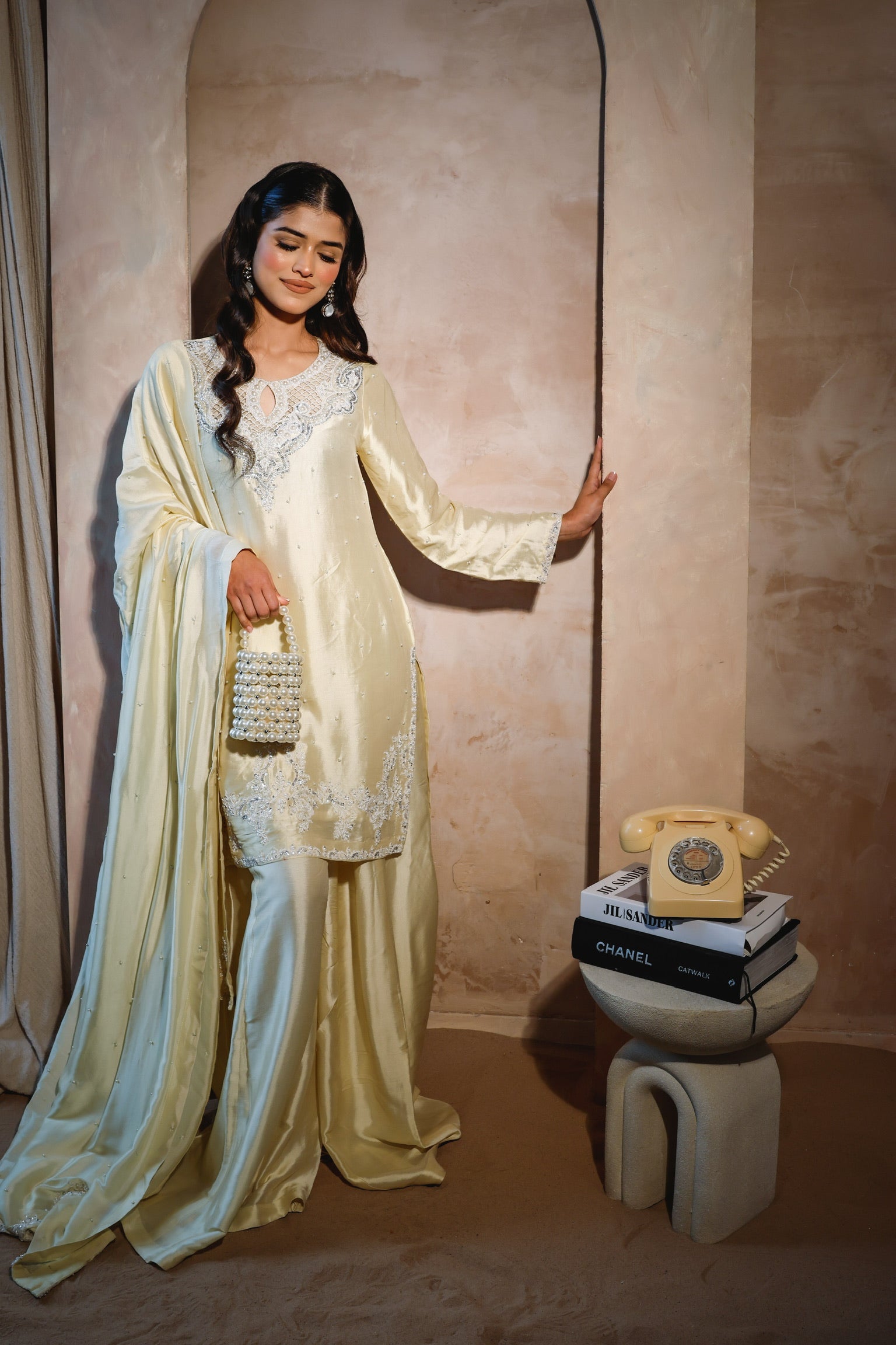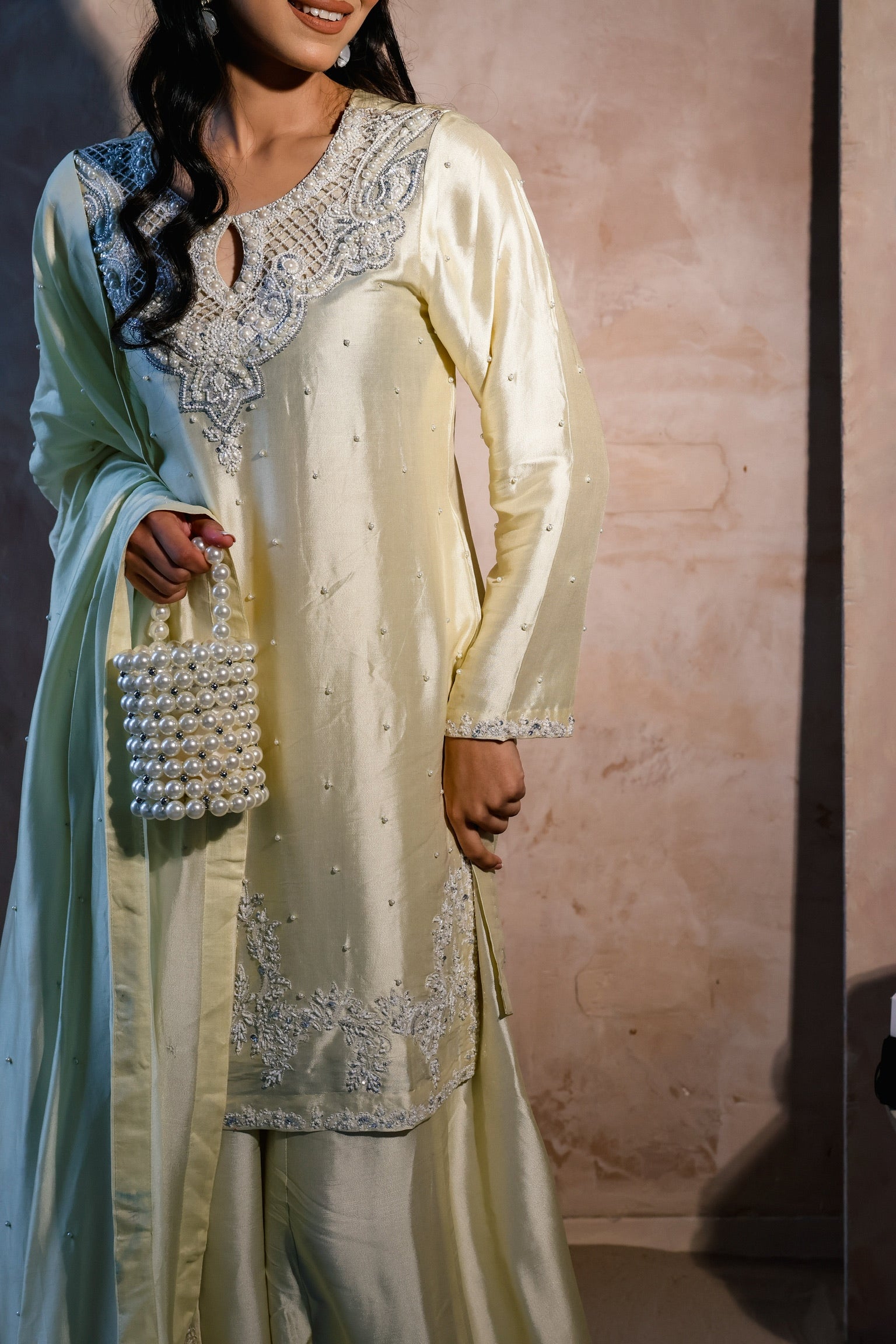 Buttermilk Sheesh Silk Kameez with Panelled Flared Sharara & Dupatta
