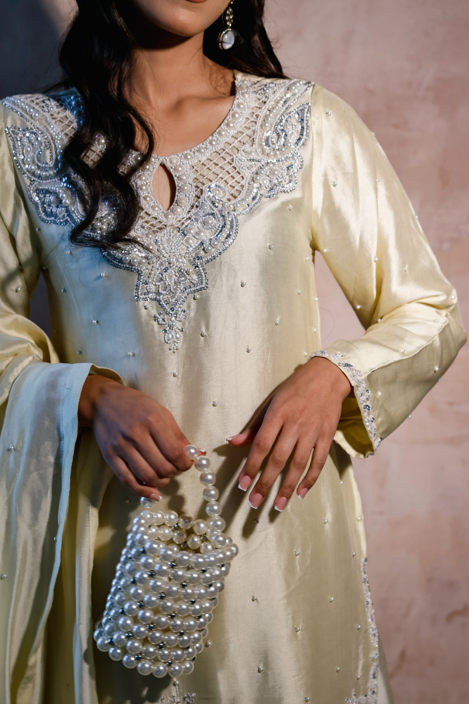 Elevate your festive and wedding wardrobe with this luxurious buttermilk-hued ensemble, crafted from rich Sheesh silk. The set features a straight kameez adorned with delicate embroidery along the neckline, sleeve cuffs, and hemline, adding timeless elegance. Paired with a panelled, flared sharara in matching silk for graceful movement and volume.
