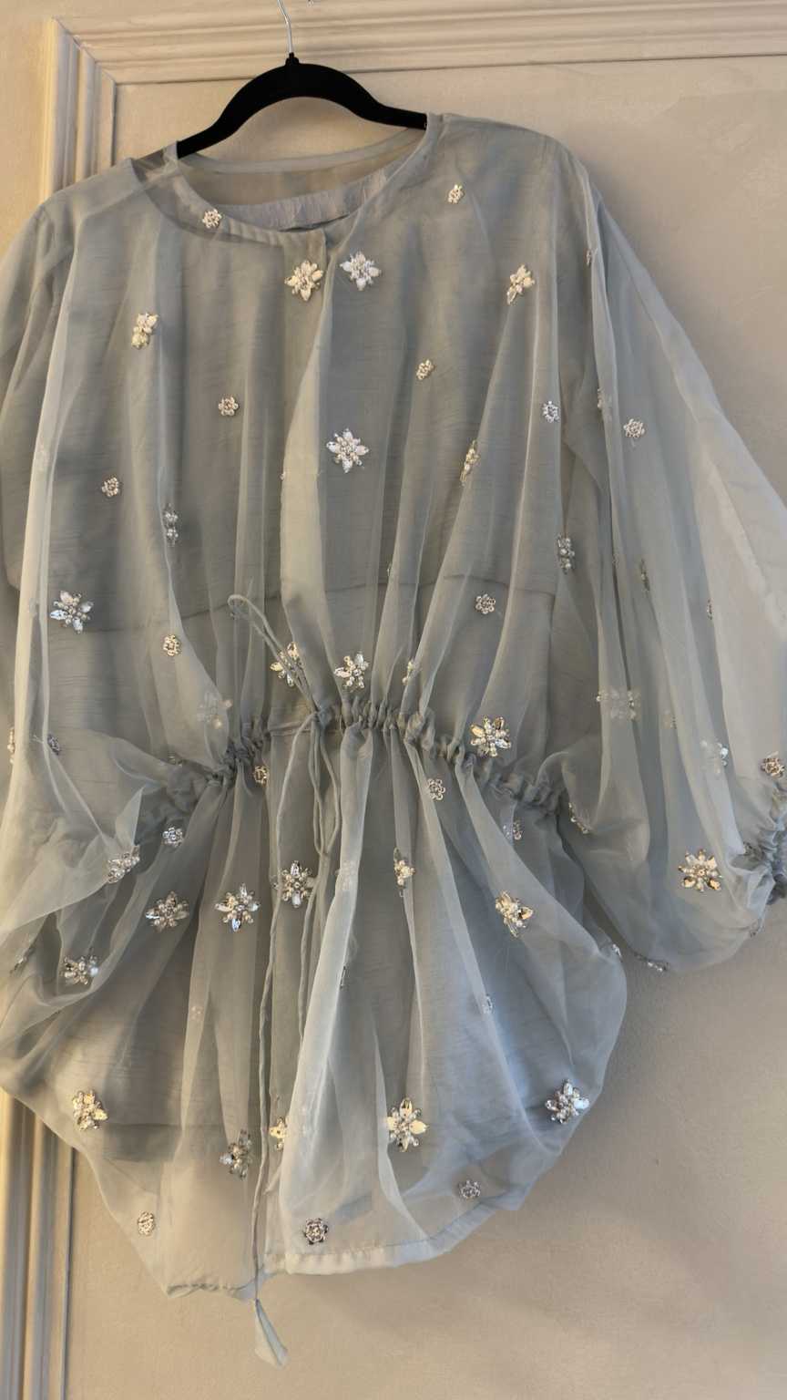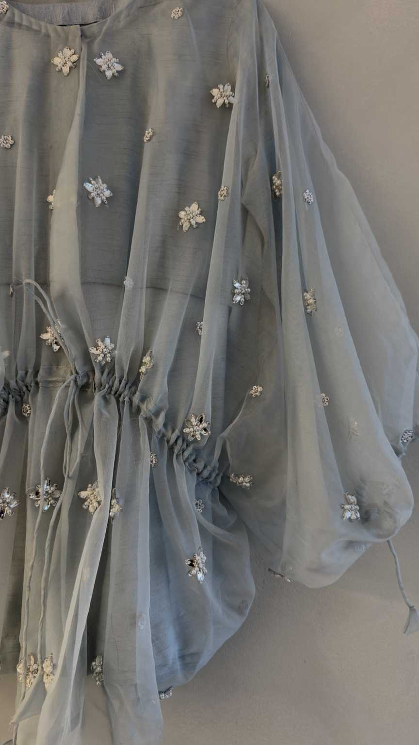 Dusky blue organza cape with hand embellishment. Comes with a slip and wide leg trouser