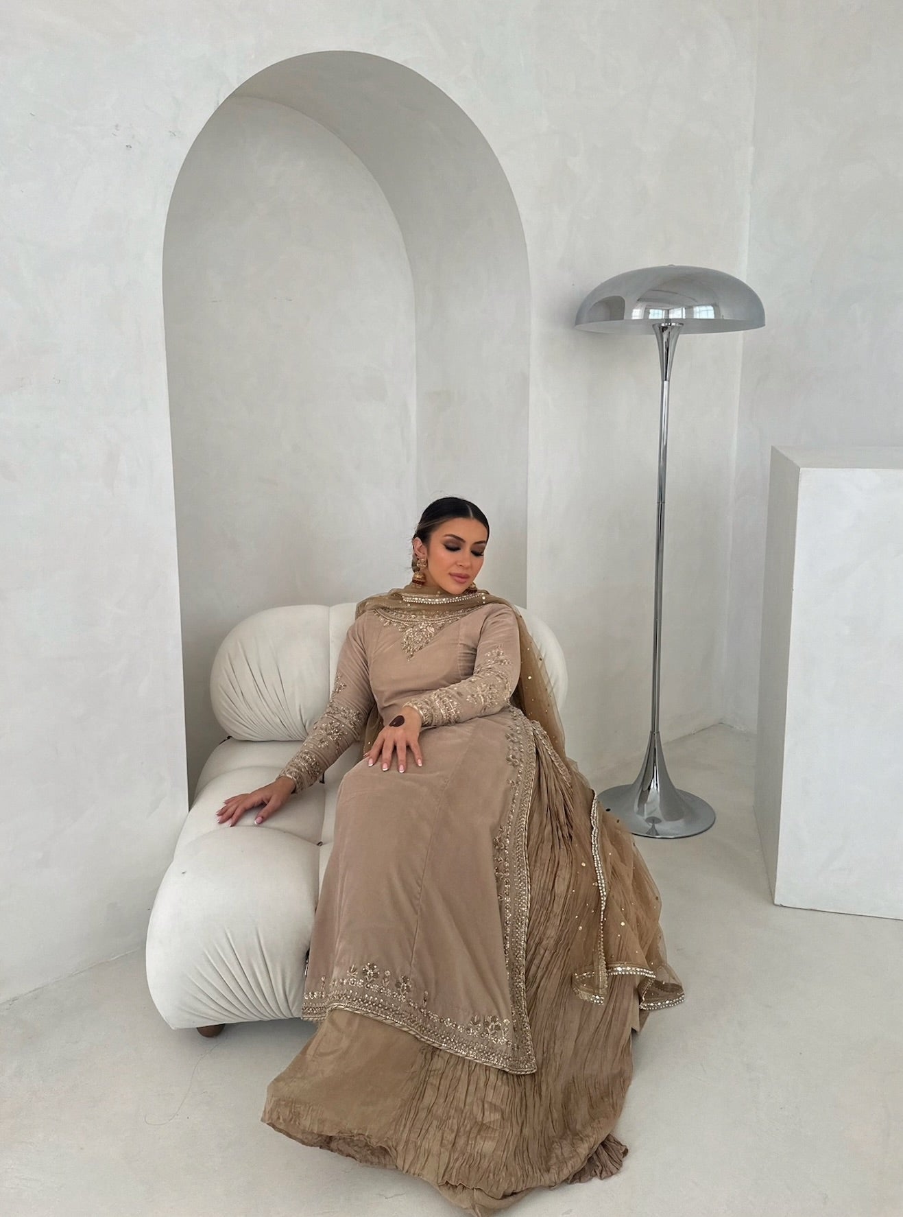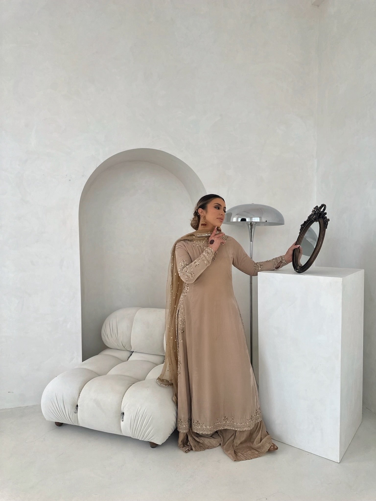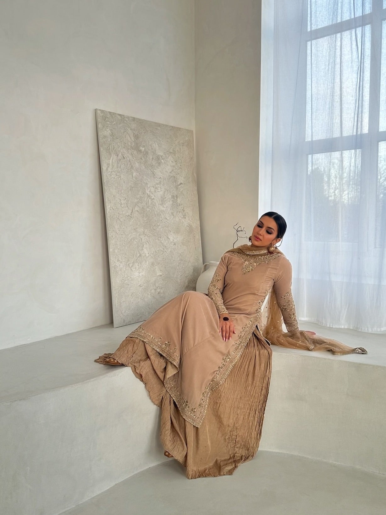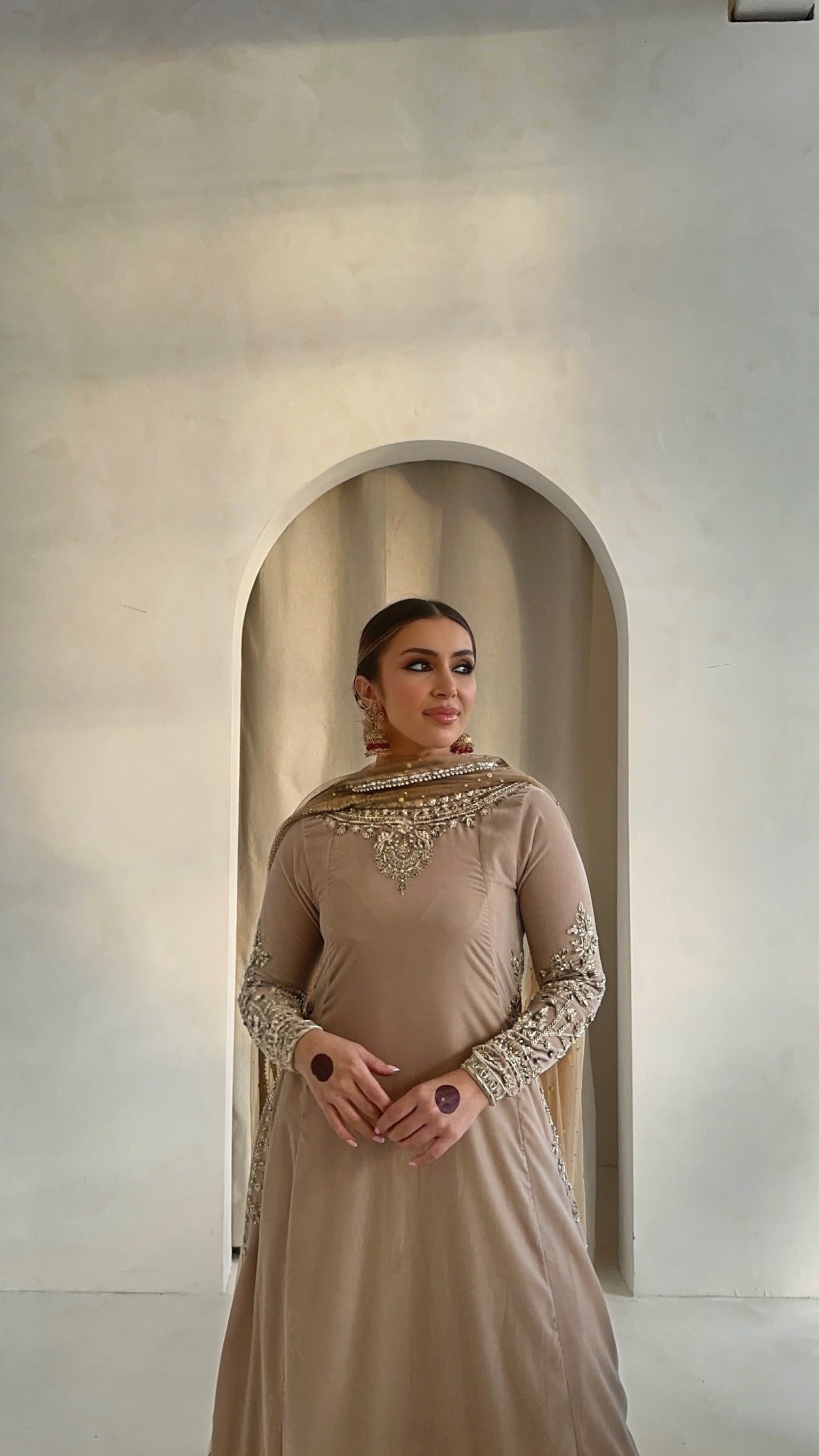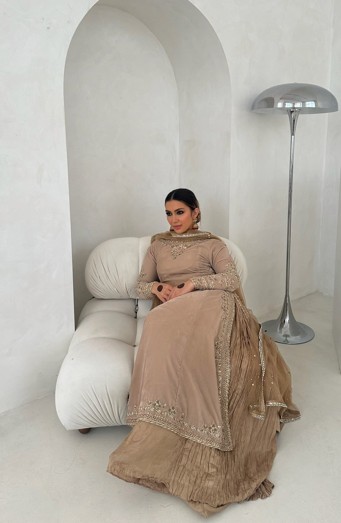 A-line nude velvet kameez with hand embellished neckline, side seam and border