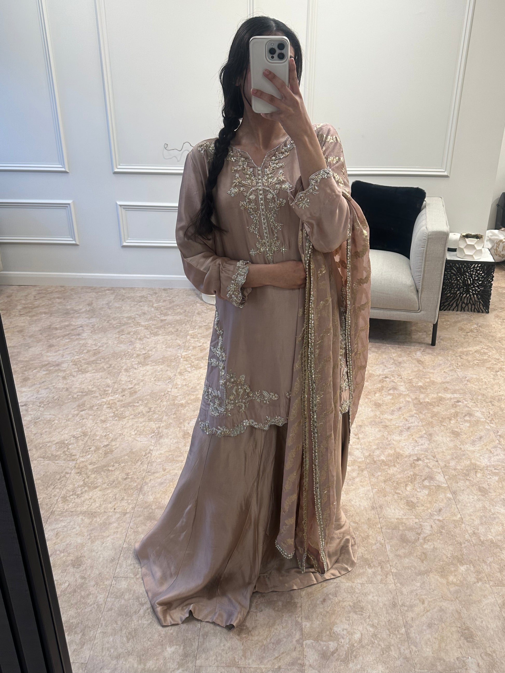 This exquisite ivory kameez features intricate hand detailing adorned with shimmering pearls and sparkling stones, making it a stunning choice for Nikkah brides or bridesmaids. The elegant ensemble is complemented by a luxurious sheesh silk panelled sharara. Completing the look is a delicate foil organza dupatta, embellished with ornate trimming that adds an extra touch of sophistication and charm