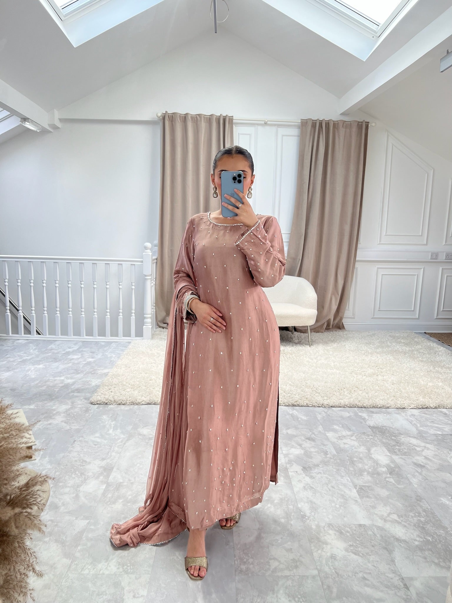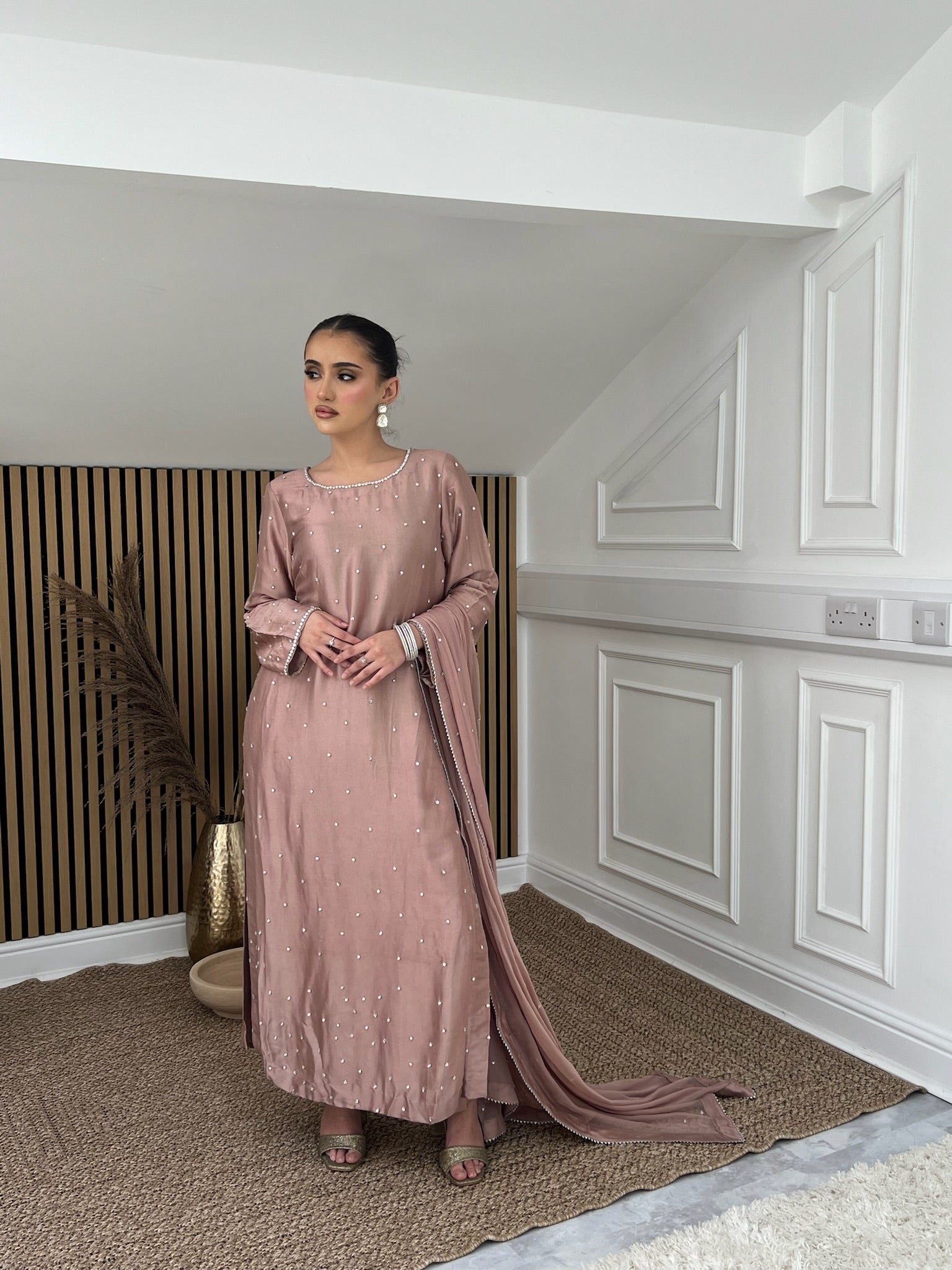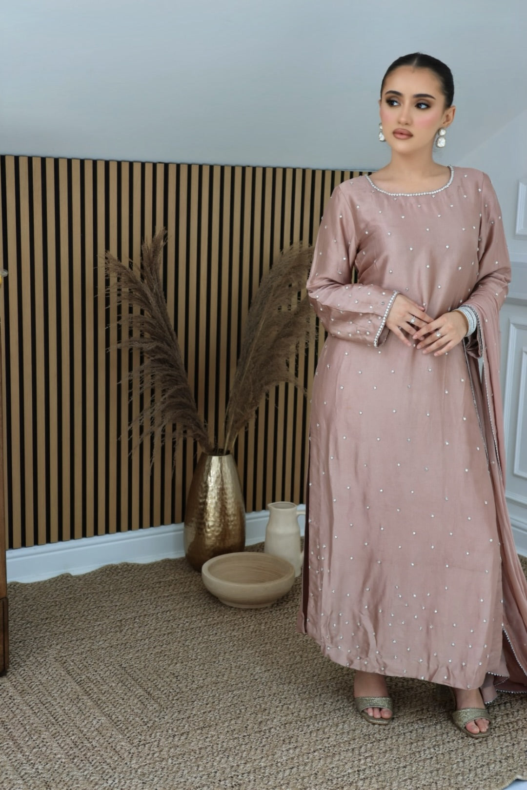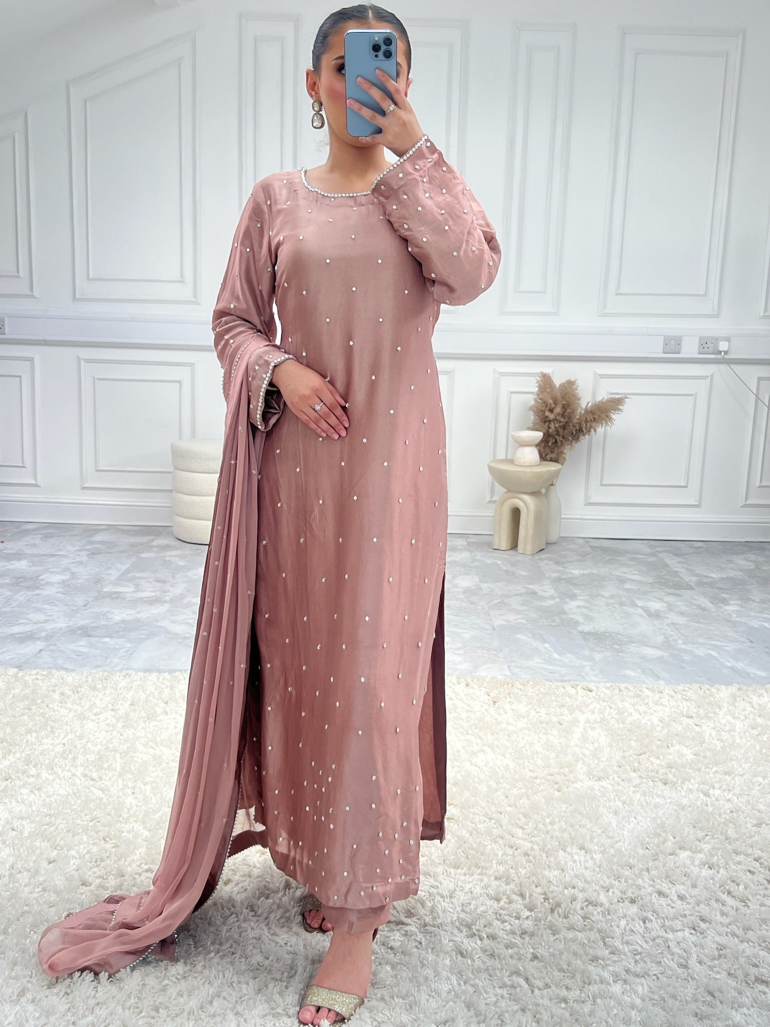 Pink sheesh silk long kameez featuring stone hand embellishments, accompanied by a chiffon dupatta adorned with scattered lace trim, paired with straight sheesh silk trousers.