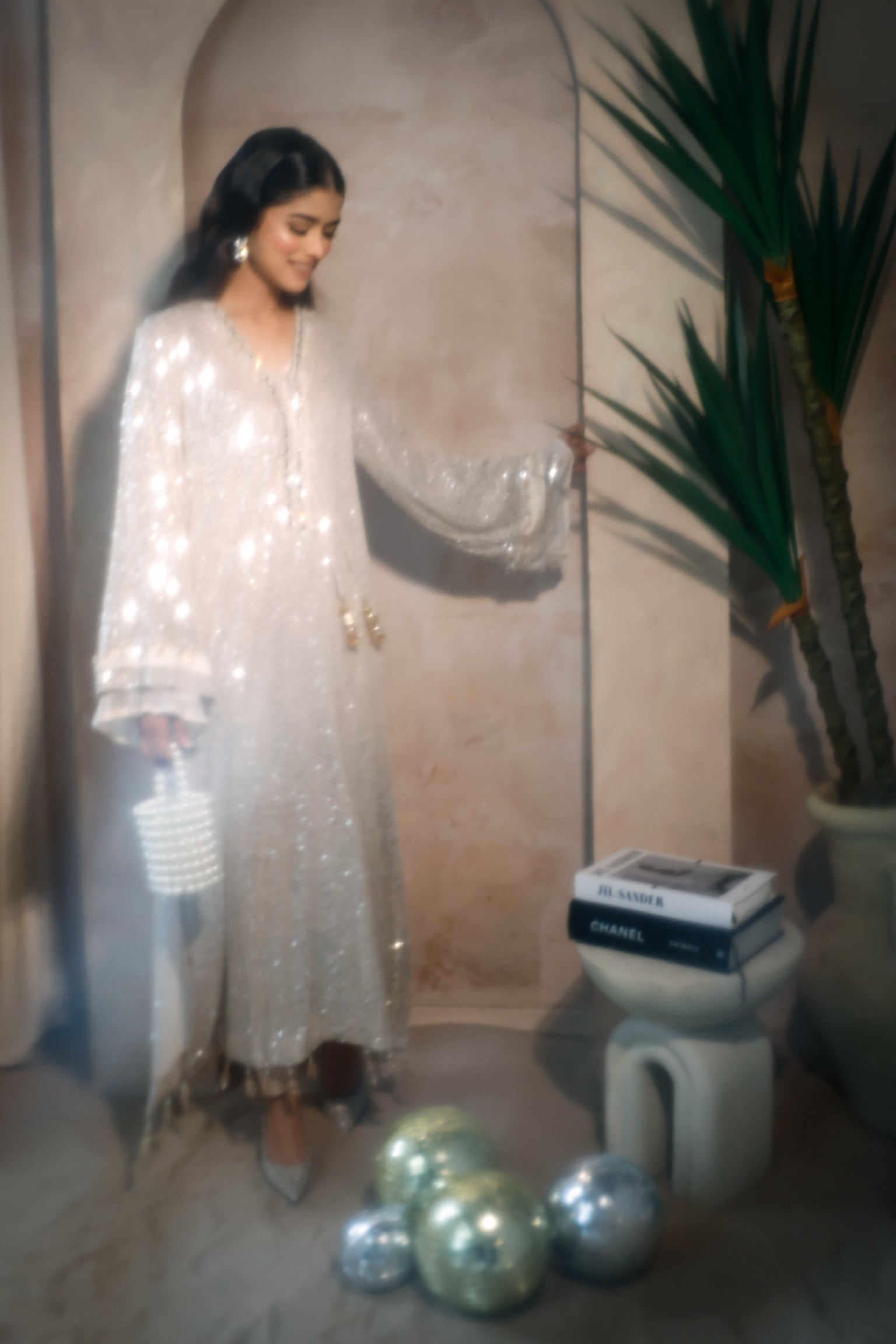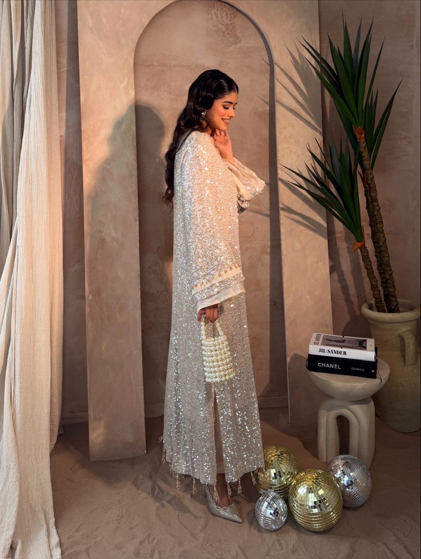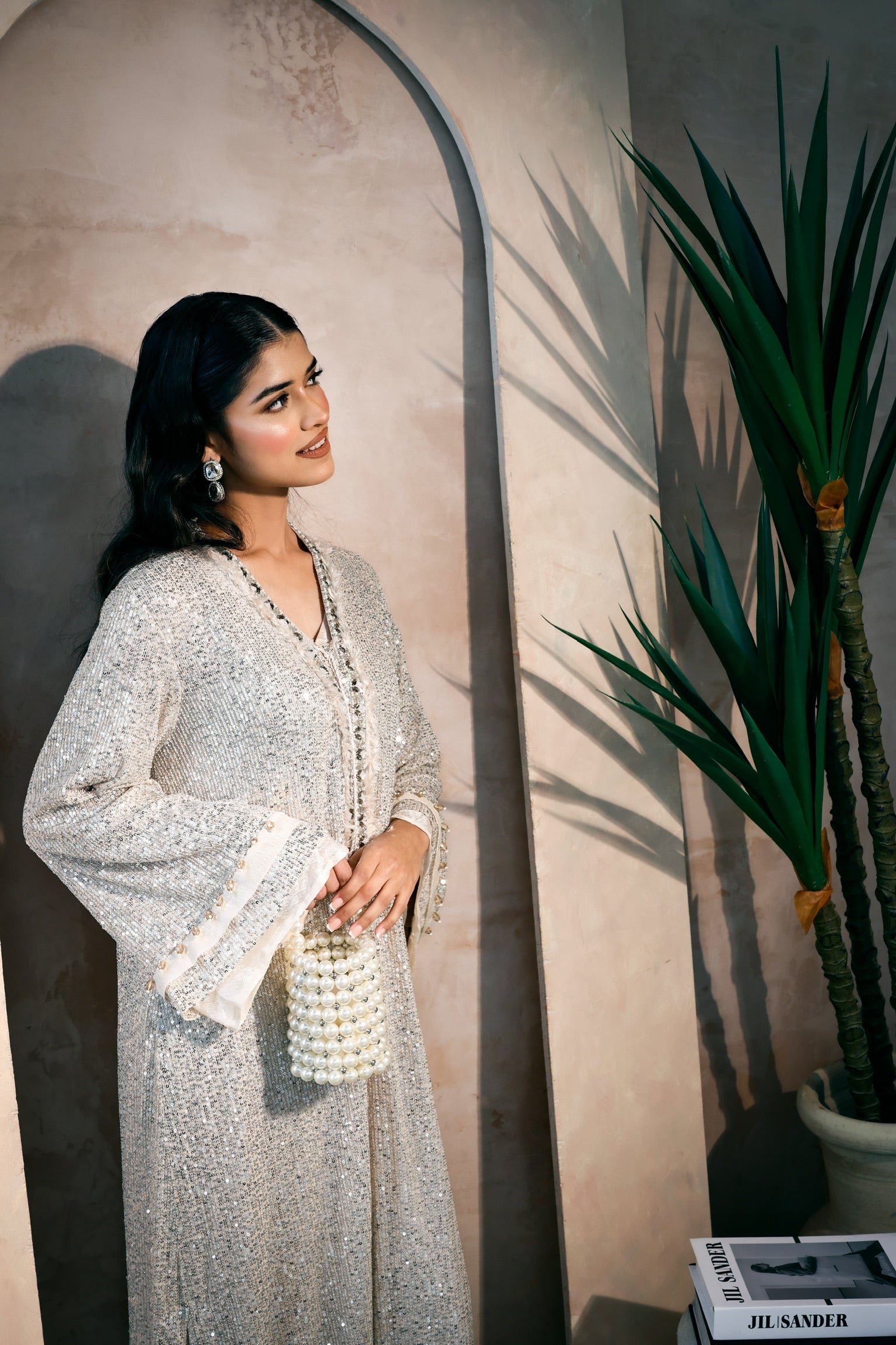 Drape yourself in effortless elegance with this champagne-toned kaftan ensemble. Crafted from a soft shimmer fabric, it exudes subtle glamour perfect for festive evenings and refined gatherings. The kaftan overlay flows gracefully, adorned with gorgeous handmade tassels along the border, adding a touch of artisanal charm.