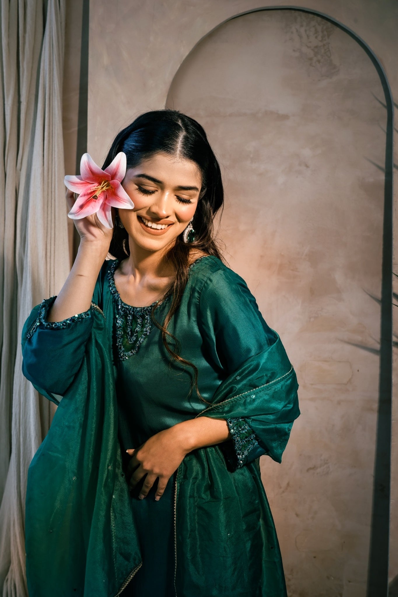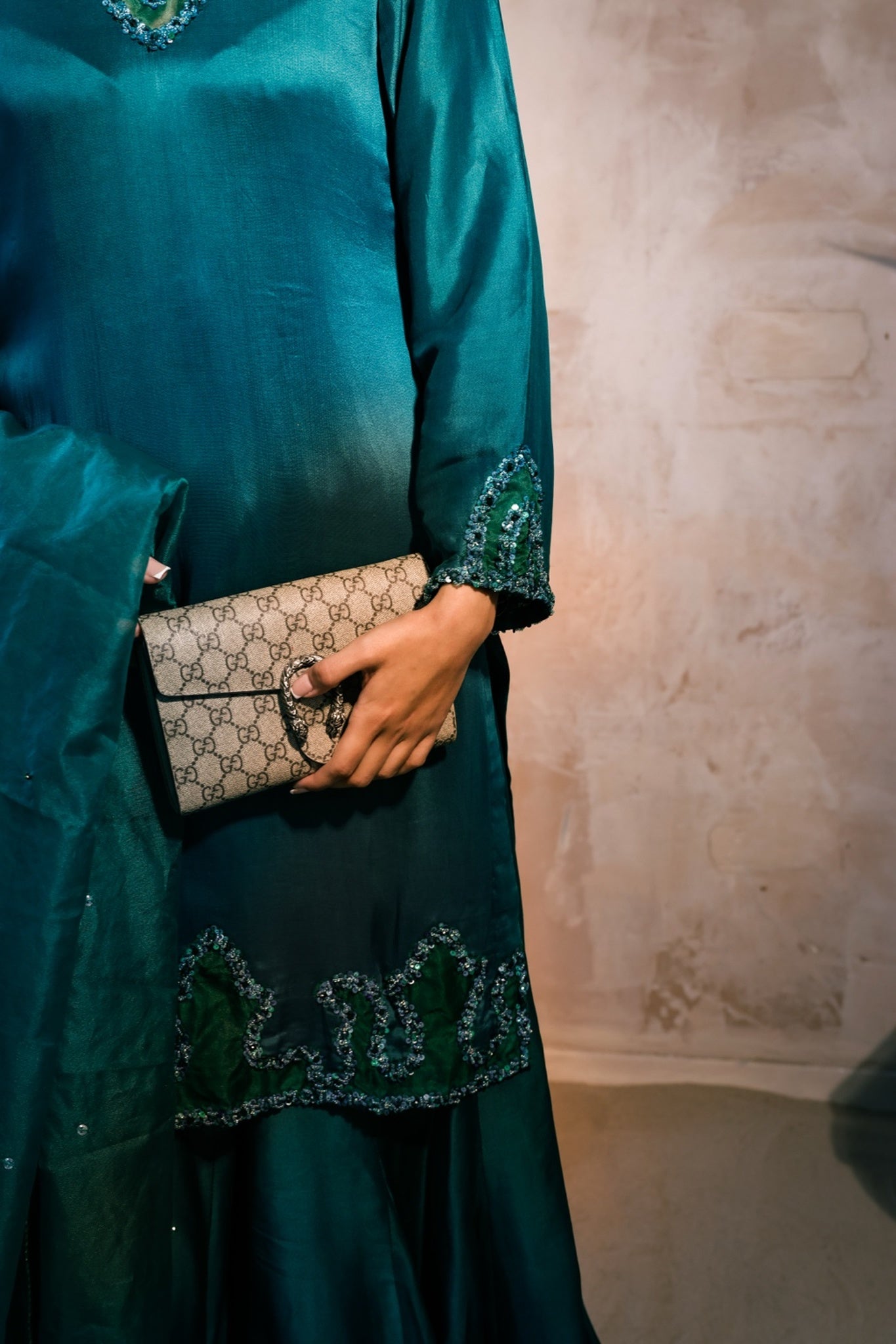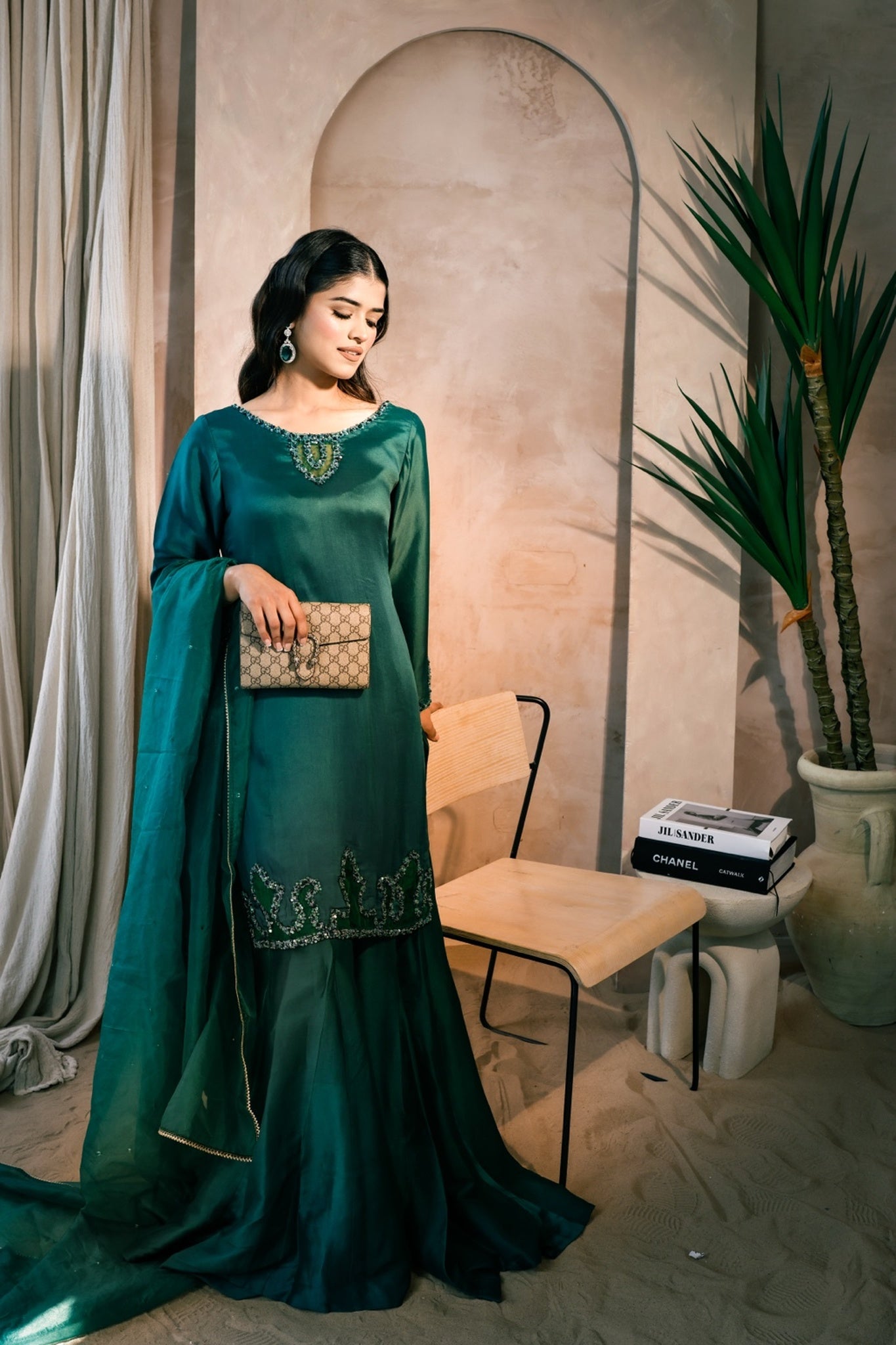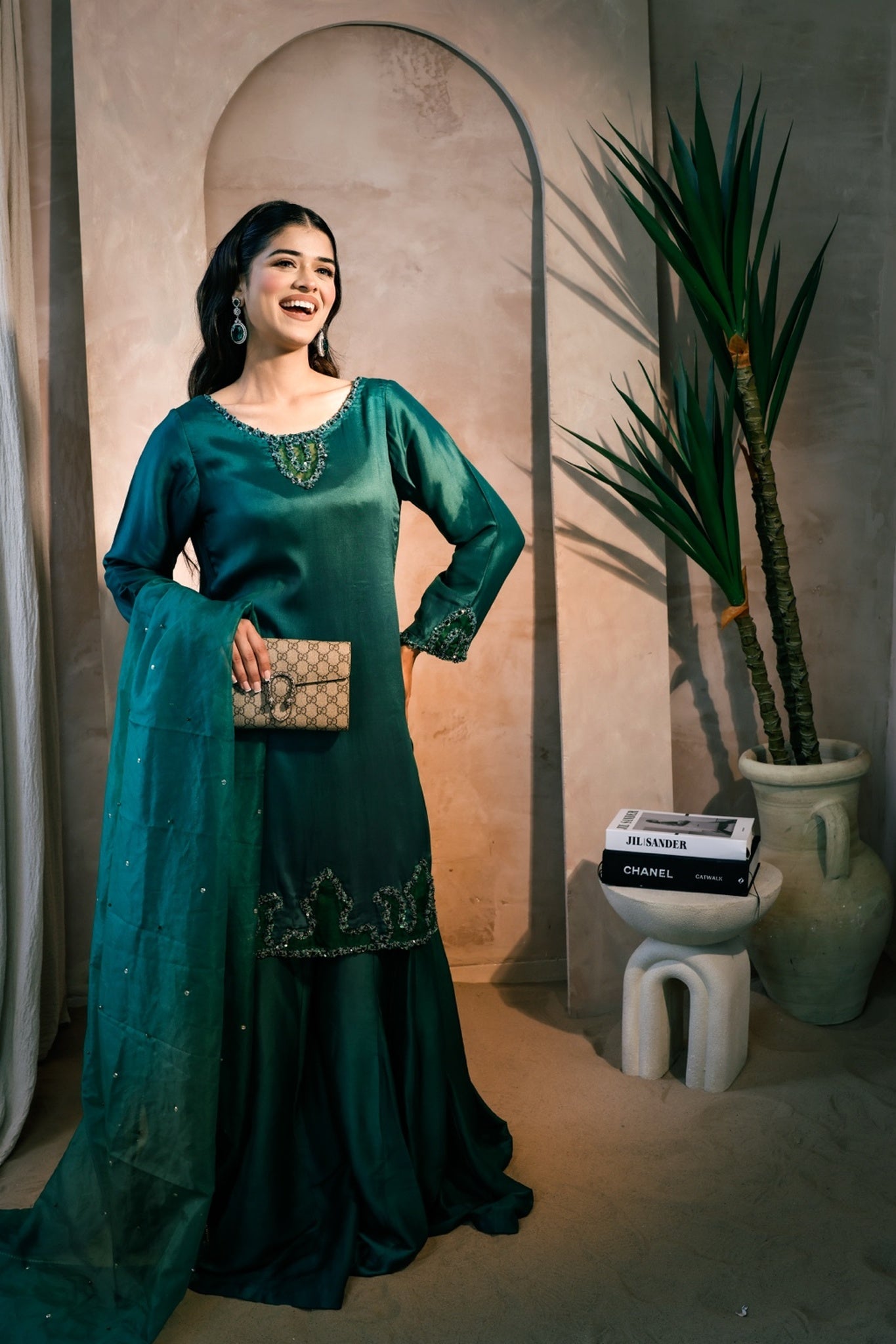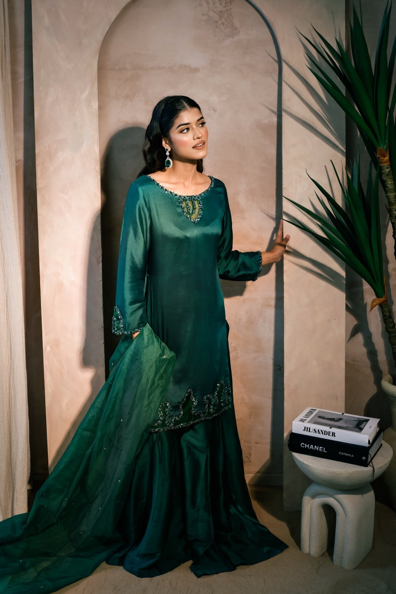 Radiate elegance in this emerald green Sheesh silk ensemble, designed with timeless grace. The kameez features hand-embellished detailing on the neckline, cuffs, and border, adding a luxurious artisanal touch. Paired with a panelled flared sharara in matching Sheesh silk, it creates a flowing silhouette full of movement and charm.
