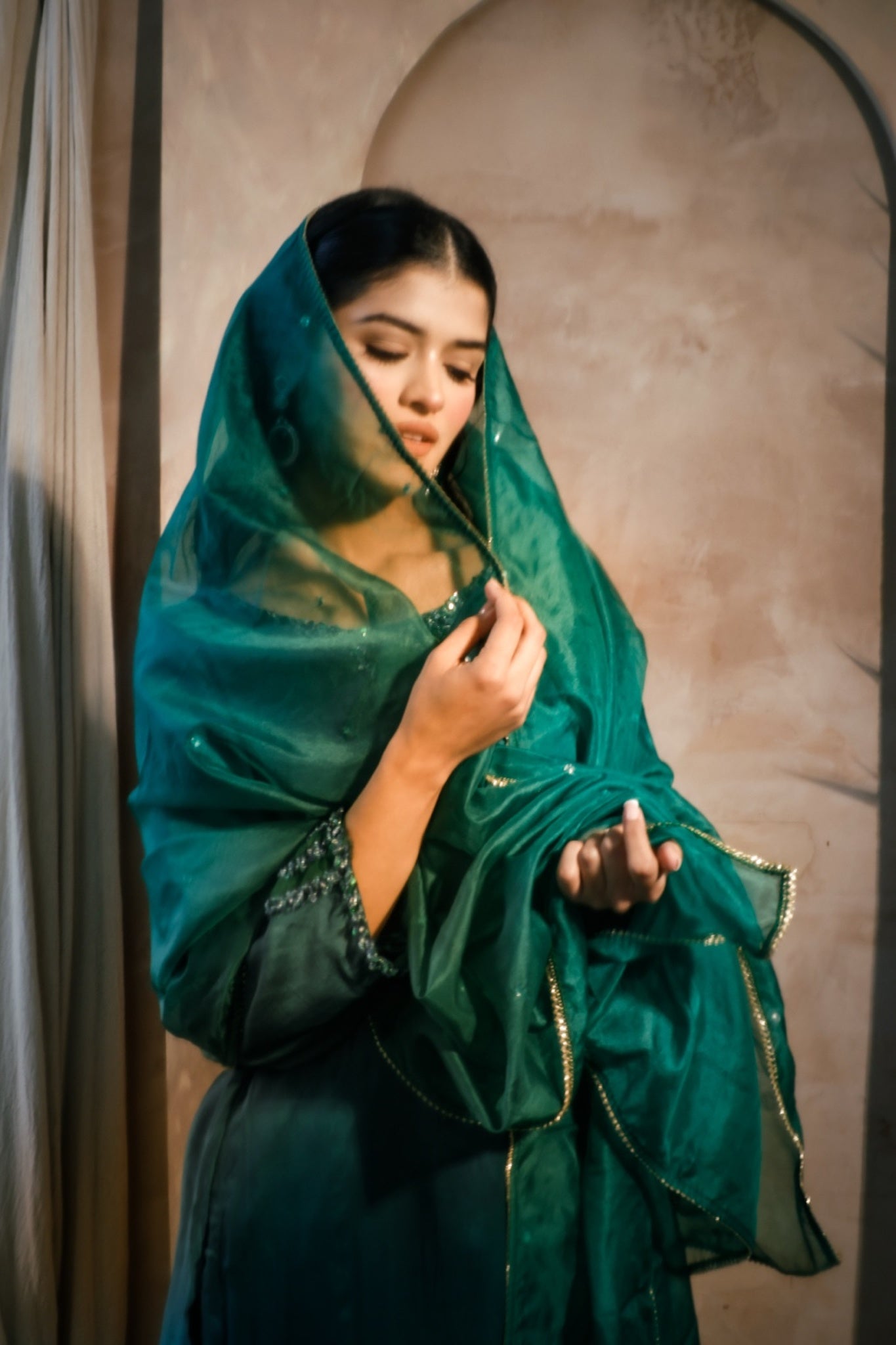 The look is completed with a lightweight organza dupatta, finished with hand-applied emerald green embellishments, offering the perfect balance of delicacy and sophistication.