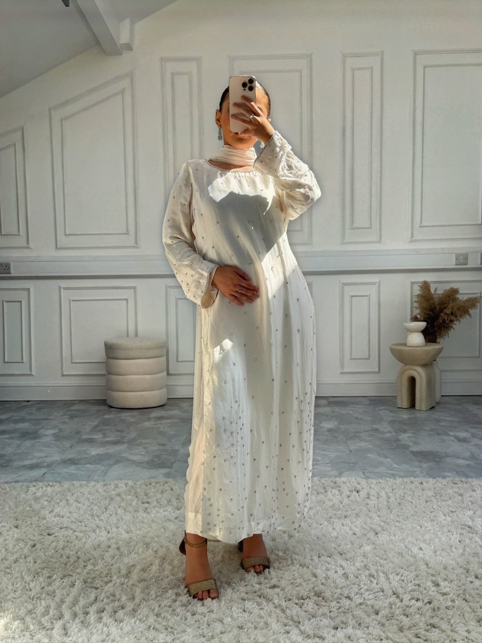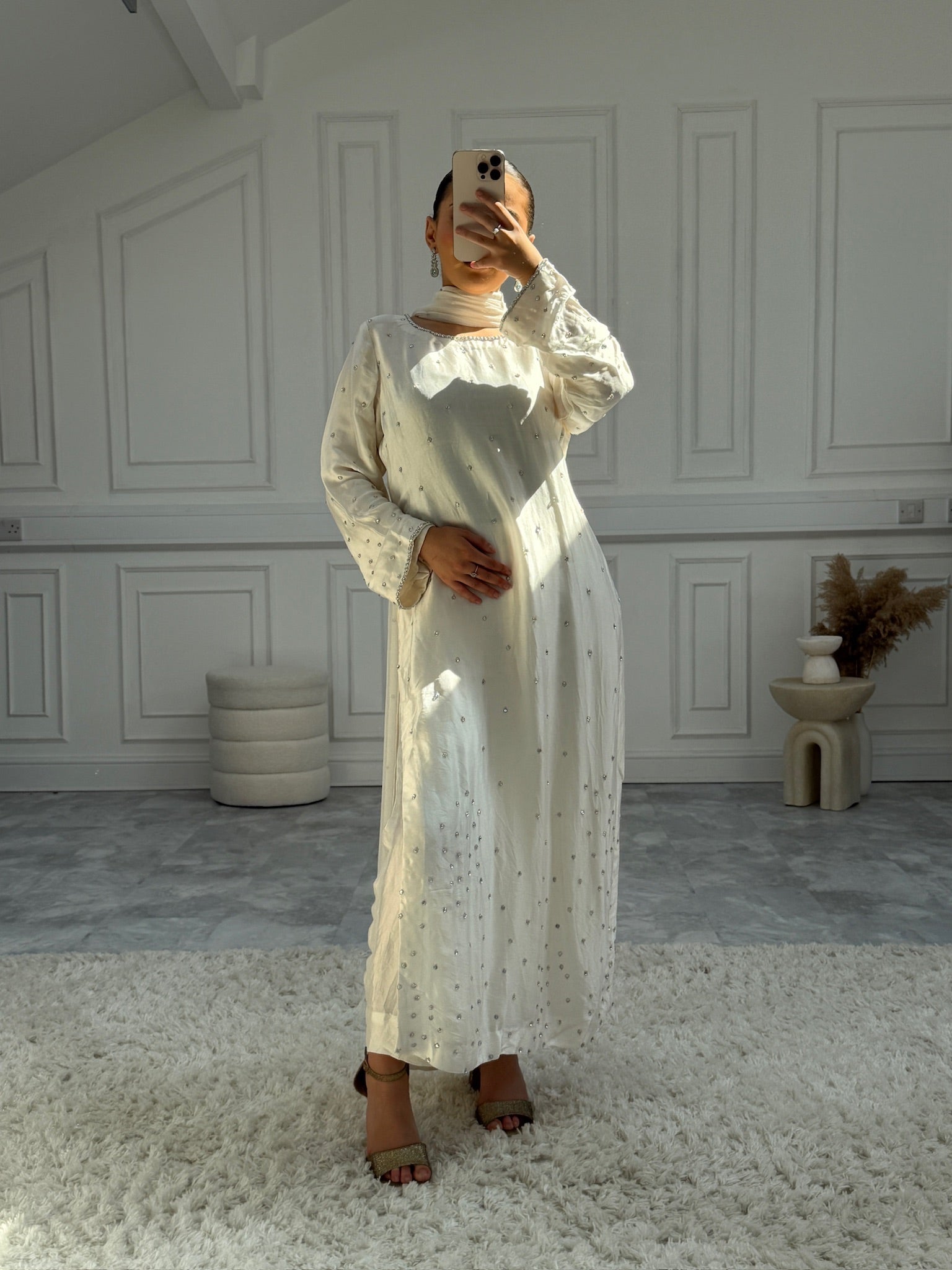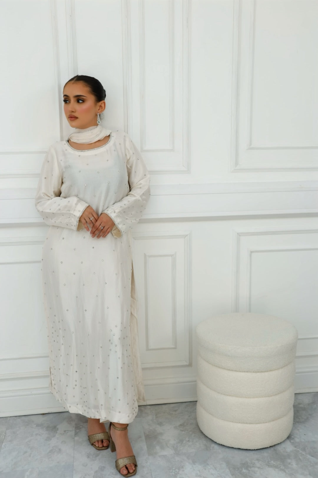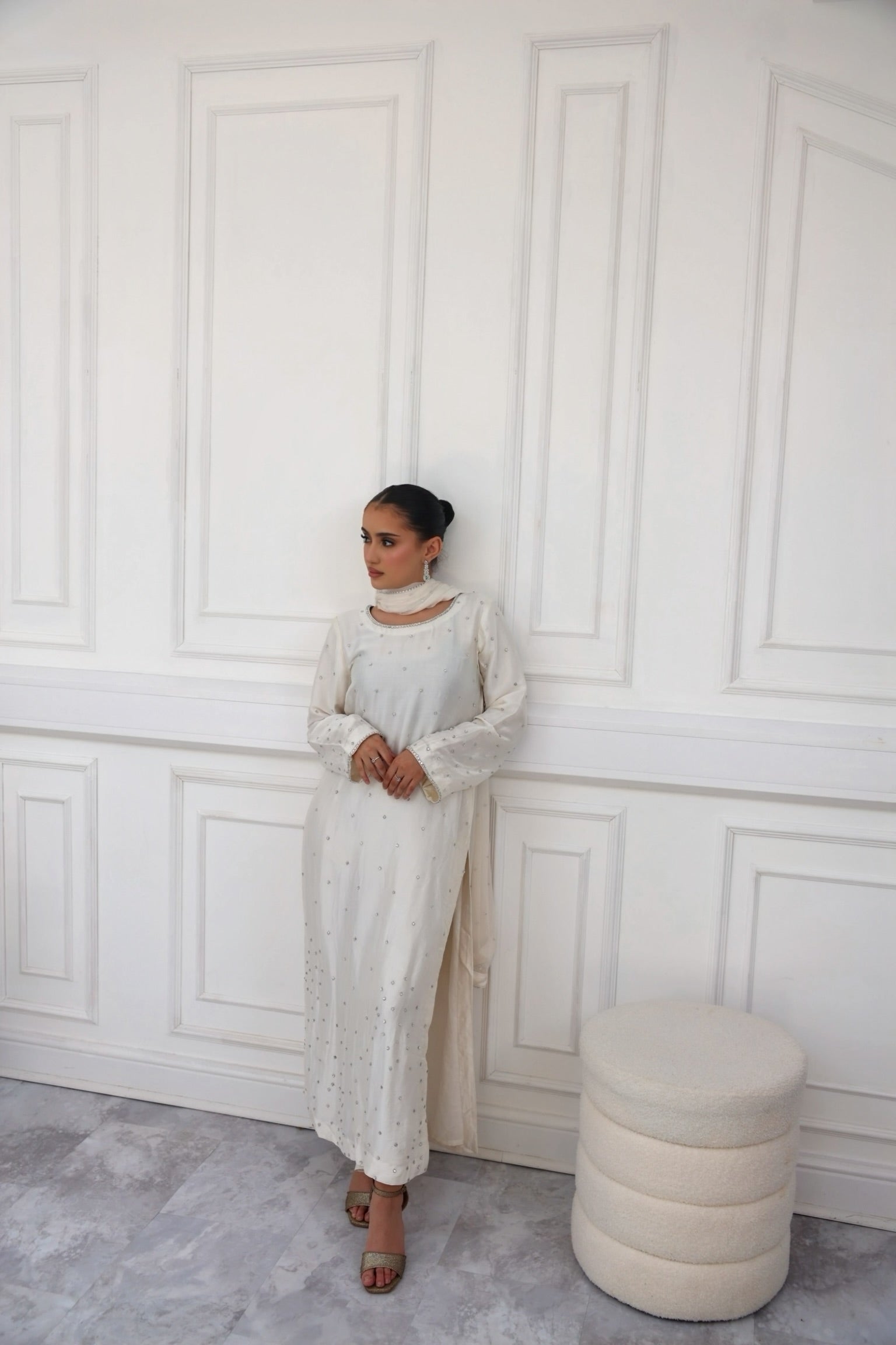 Ivory sheesh silk long kameez featuring stone hand embellishments, accompanied by a chiffon dupatta adorned with scattered lace trim, paired with straight sheesh silk trousers.