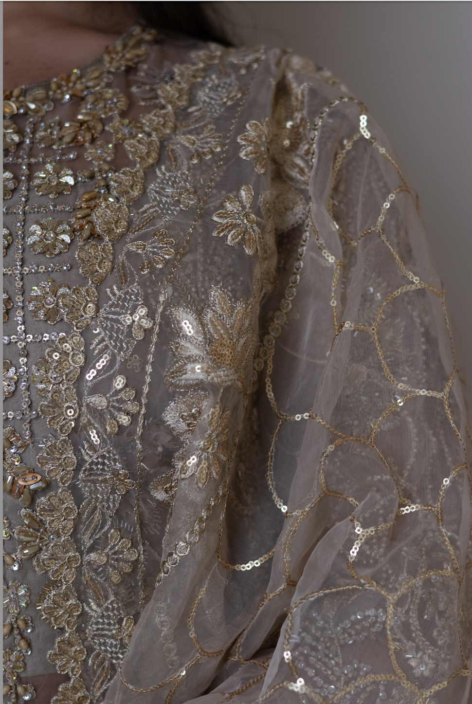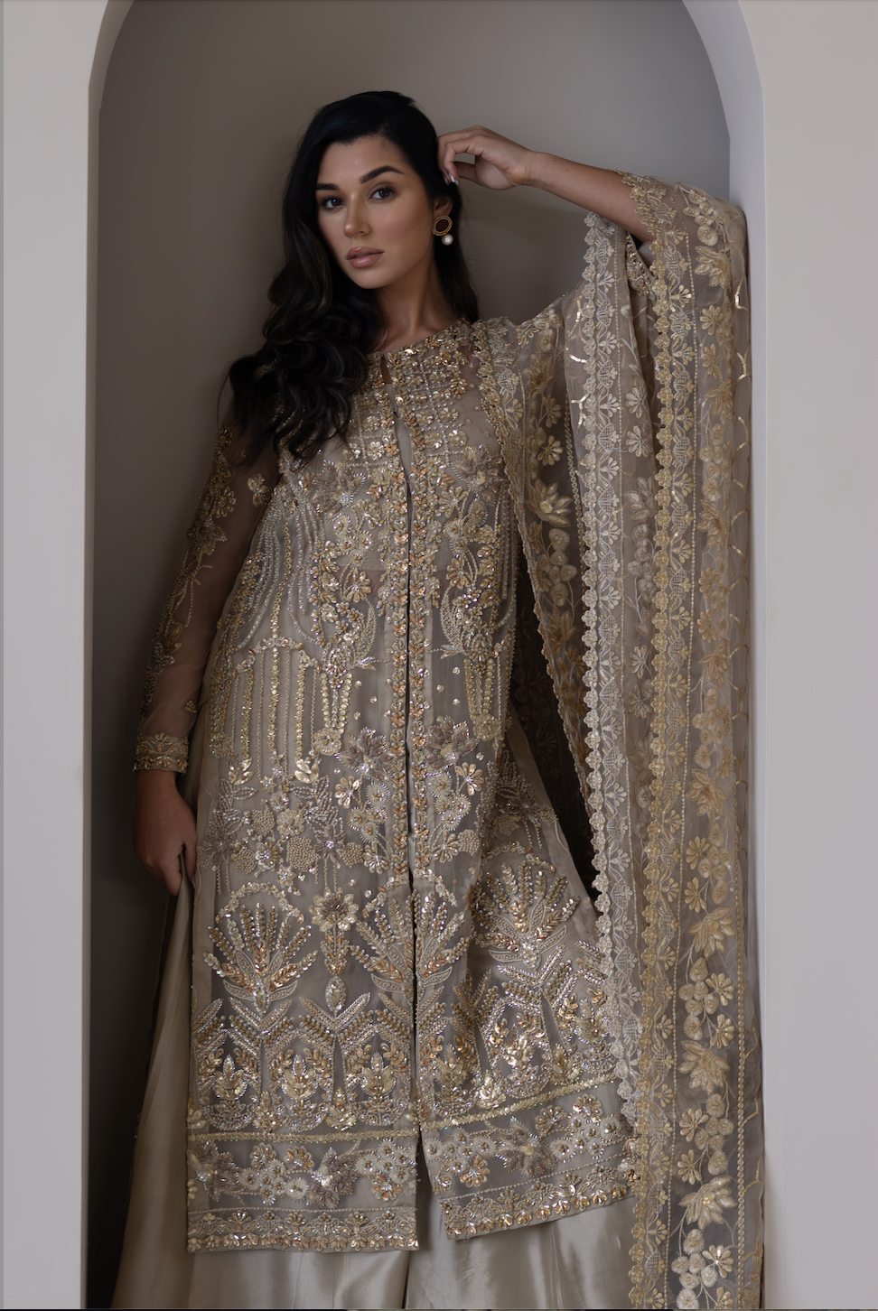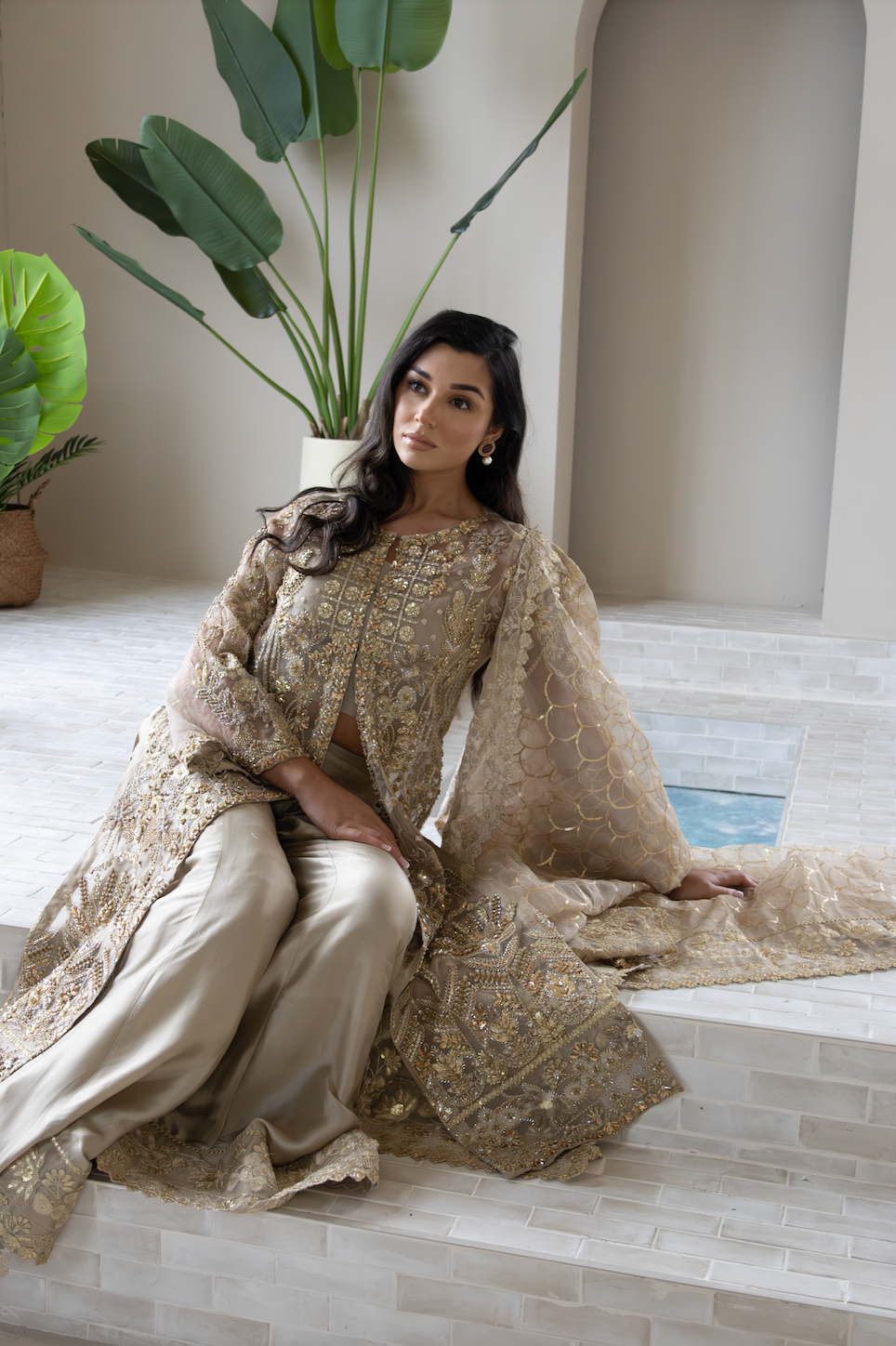 Make a statement with Fresia, fully adorned with intricate gold, copper, and bronze embellishments. Paired with wide-leg trousers, this design is completed with a heavy embroidered dupatta, adding an extra layer of elegance and sophistication.