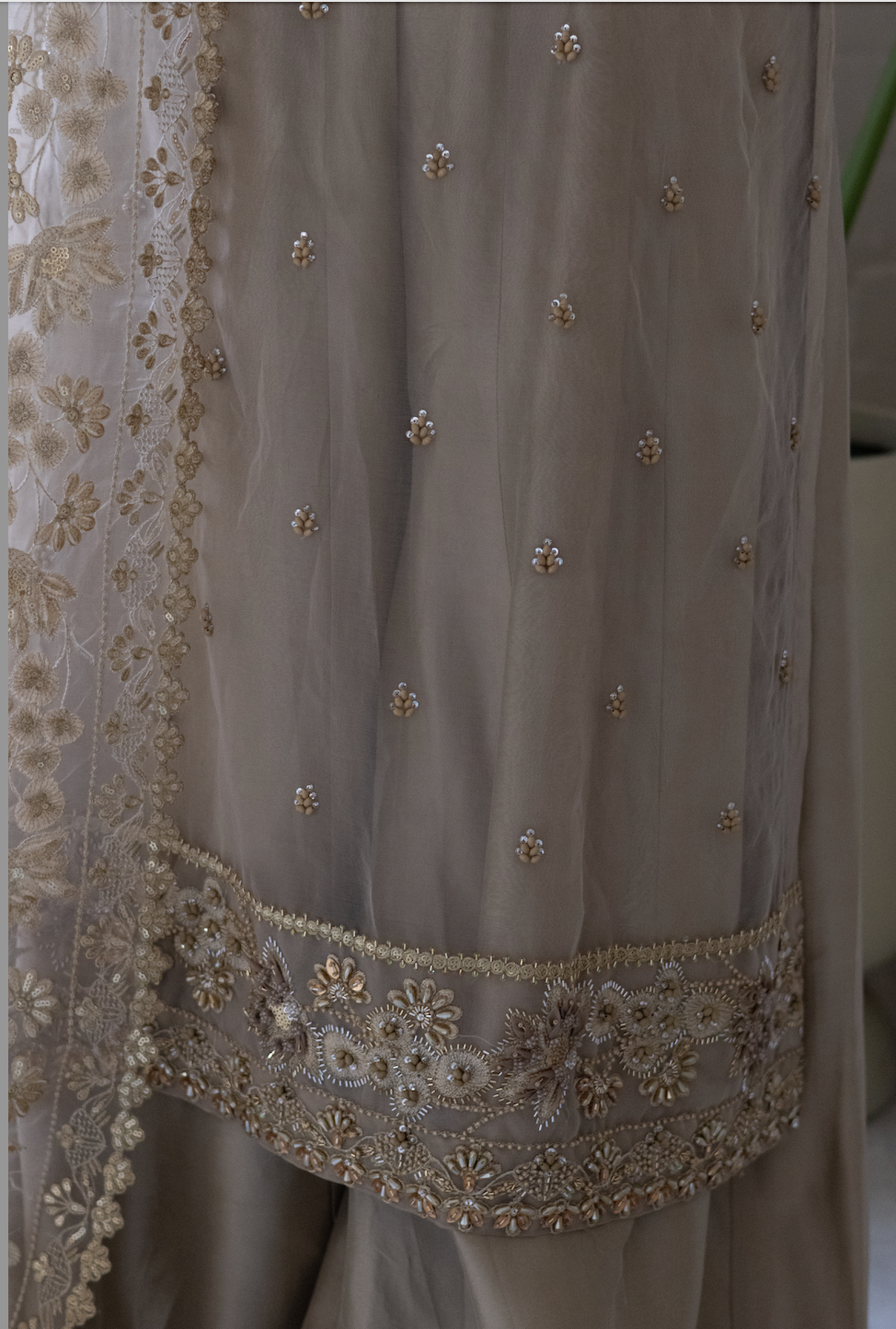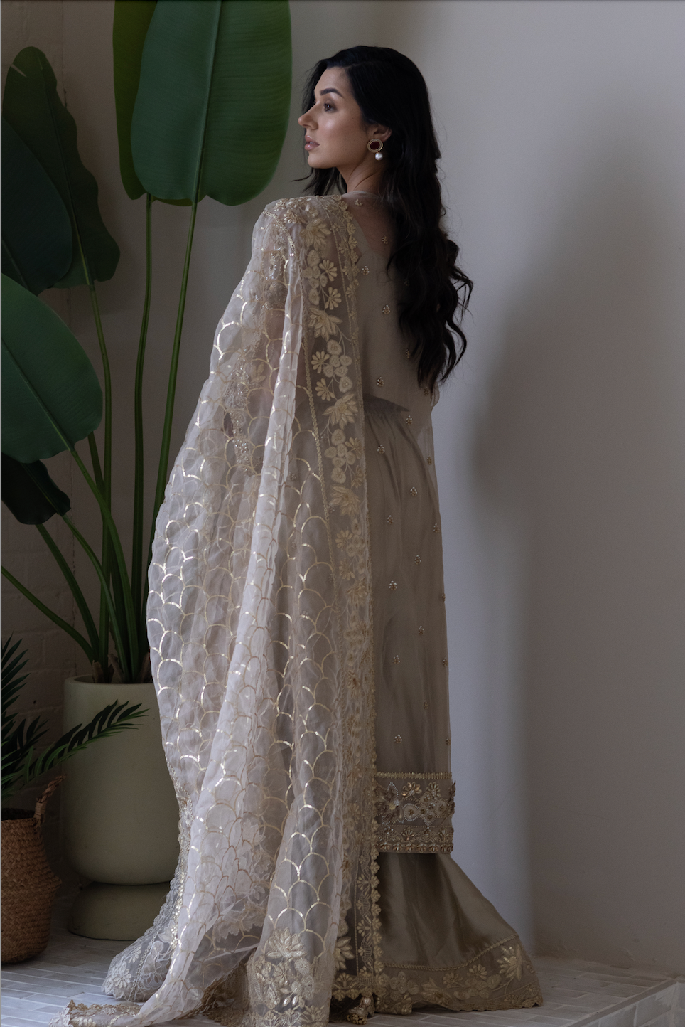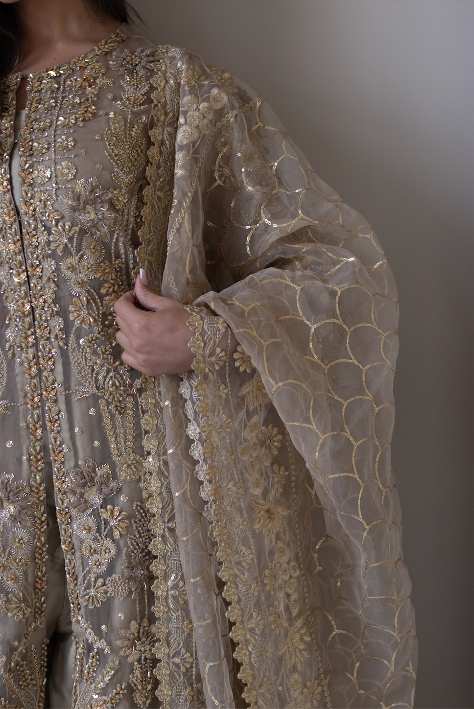 Make a statement with Fresia, fully adorned with intricate gold, copper, and bronze embellishments. Paired with wide-leg trousers, this design is completed with a heavy embroidered dupatta, adding an extra layer of elegance and sophistication.