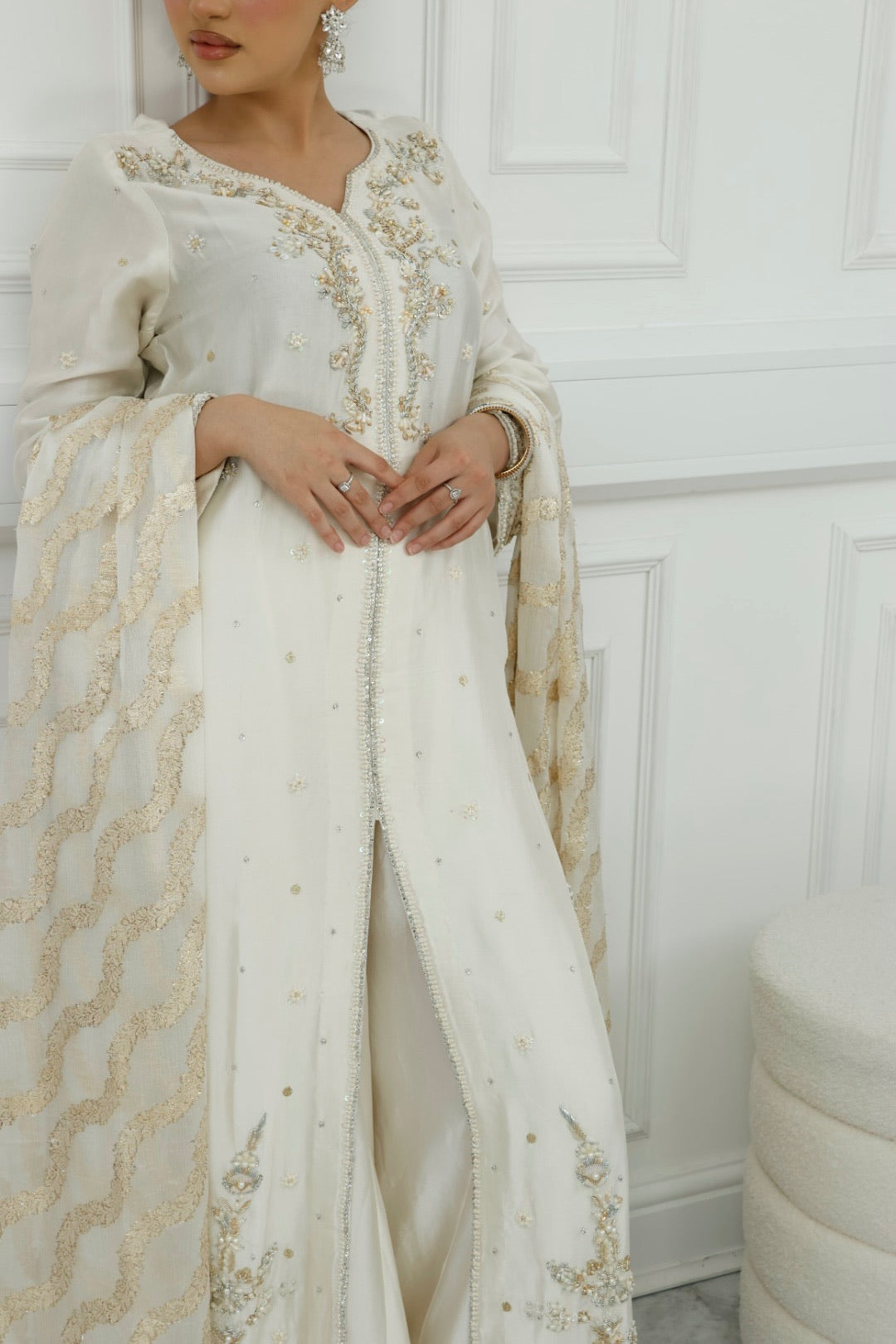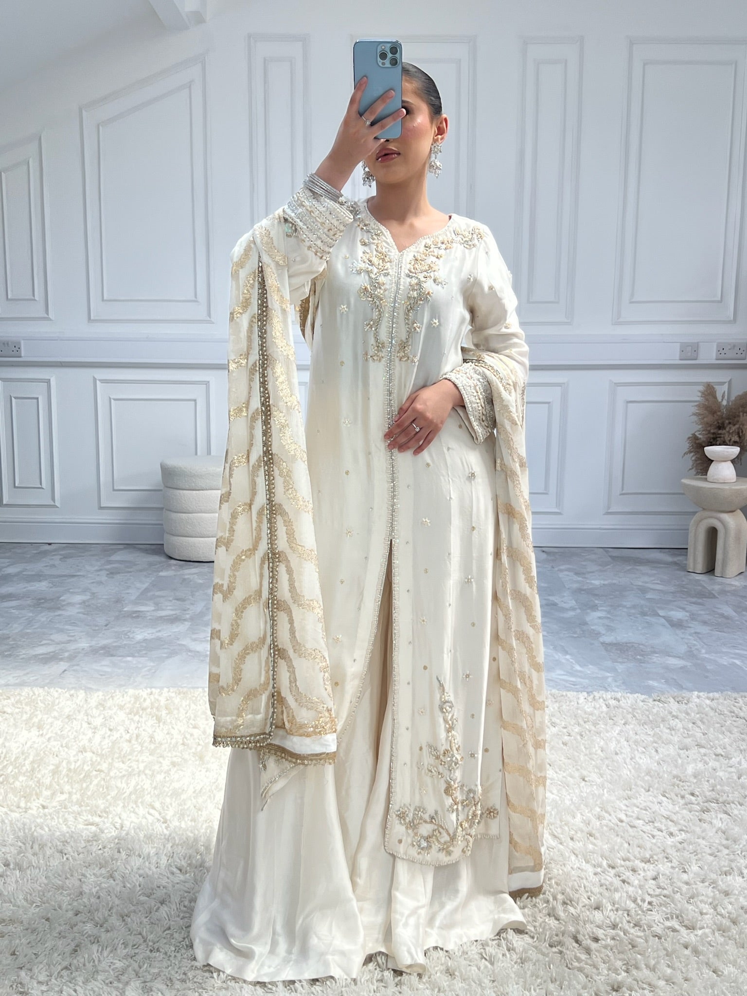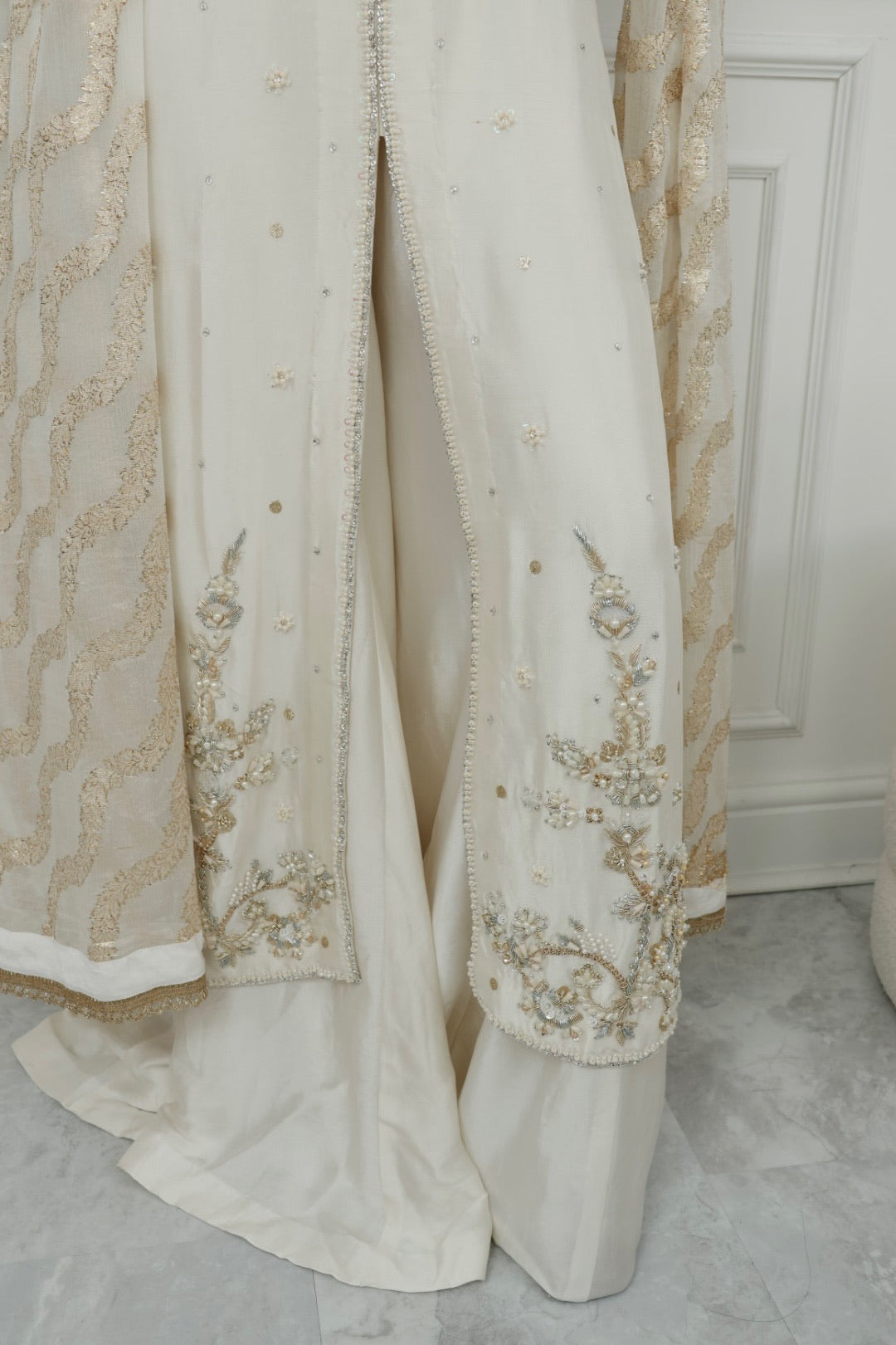Ivory long sheesh silk open jacket A-line kameez with foil dupatta with beaded lace trim, paired with panel sheesh silk sharara.