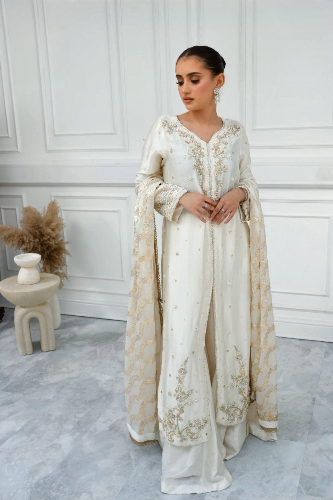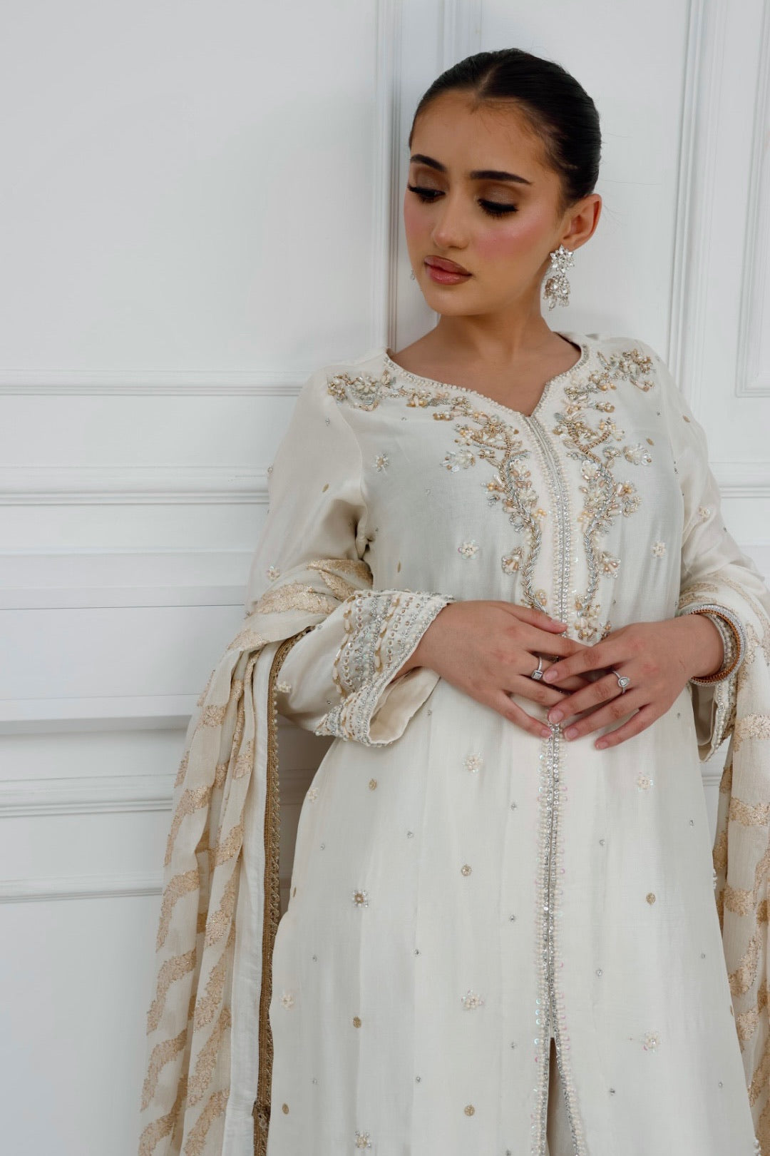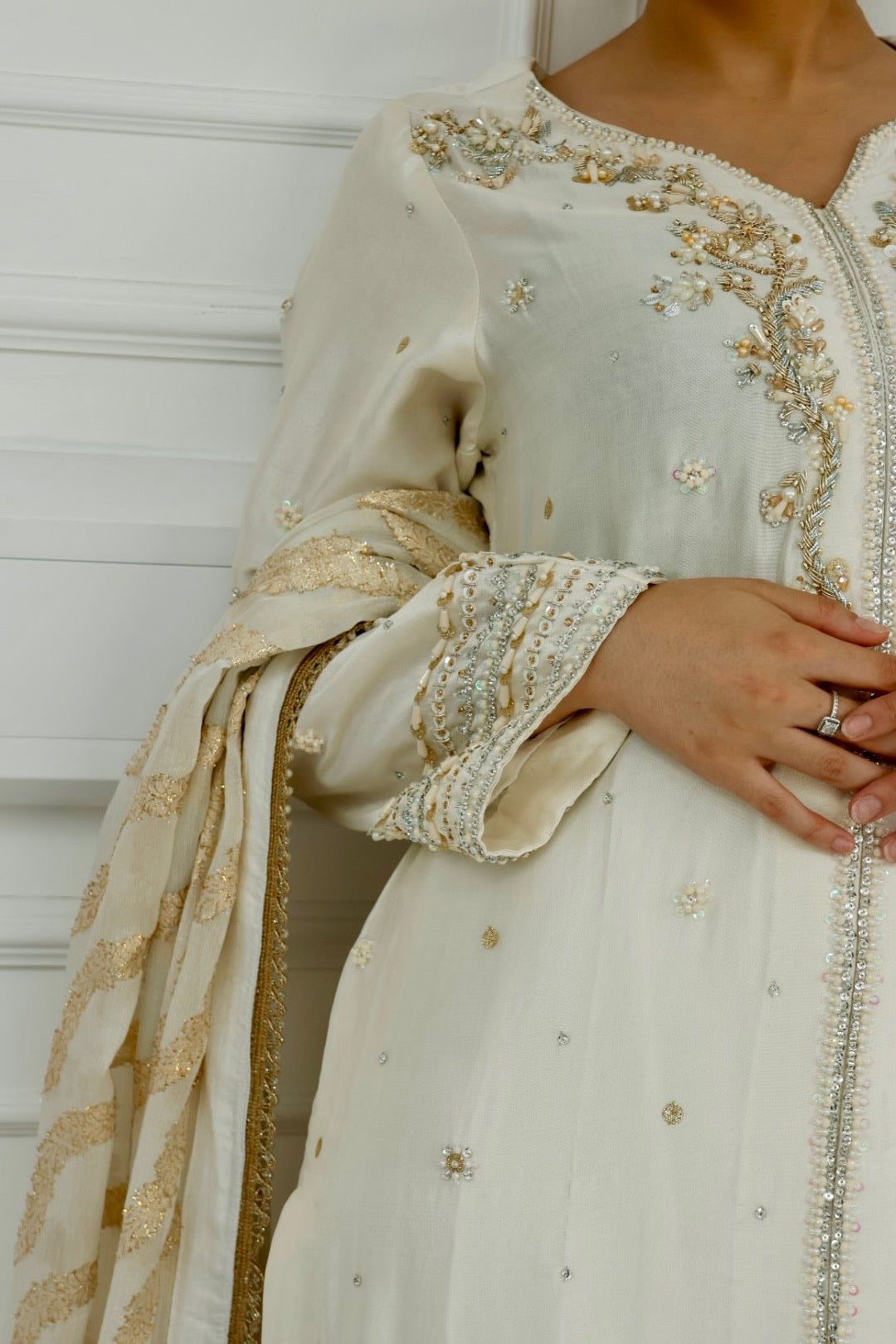 Ivory long sheesh silk open jacket A-line kameez with foil dupatta with beaded lace trim, paired with panel sheesh silk sharara.