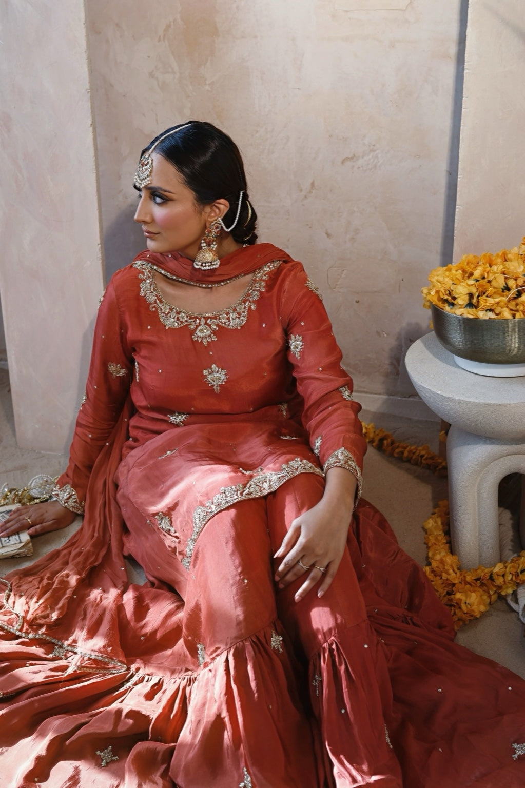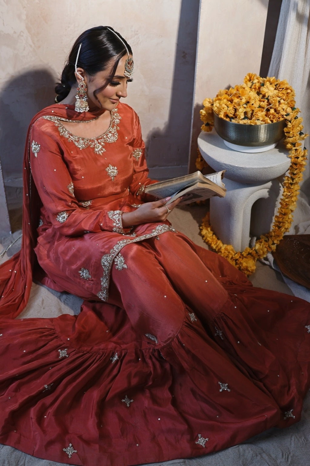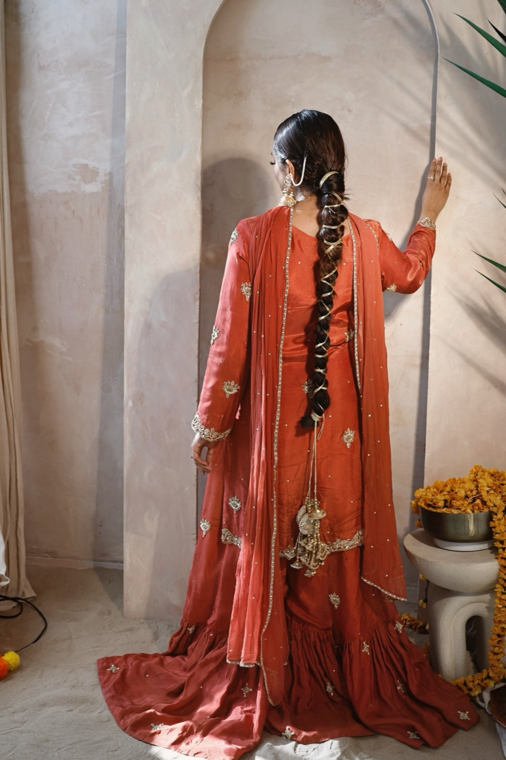 Radiate festive charm in this vibrant orange Russian silk kameez, beautifully hand embellished and paired with a flowing farshi gharara. The look is completed with a chiffon dupatta finished with delicate lace, creating the perfect ensemble for Mehndi brides, home dholkis, or festive celebrations.