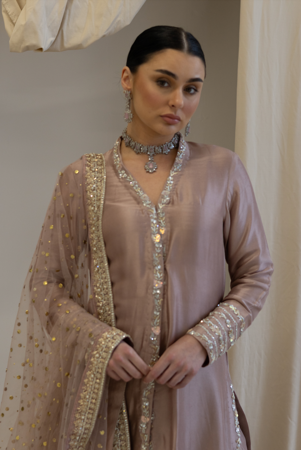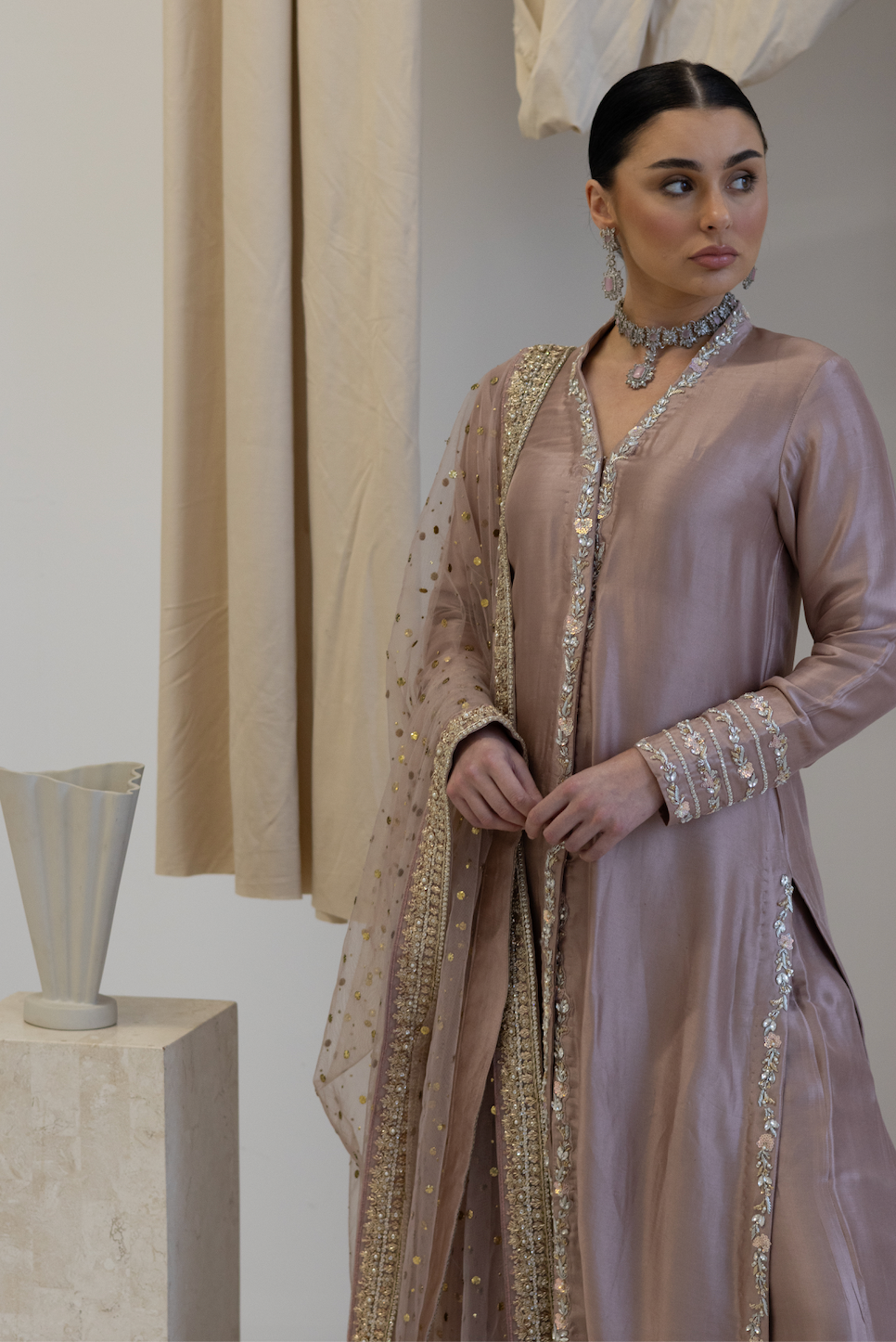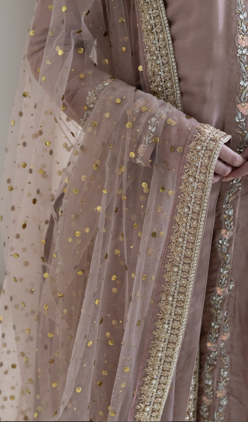 Step into elegance with Ivy. The rich sheesh silk kameez, designed as a stylish jacket, features intricate detailing that enhances its sophisticated charm. Its soft, dusky pink hue exudes warmth and grace, making it the perfect choice for any formal or celebratory occasion.
