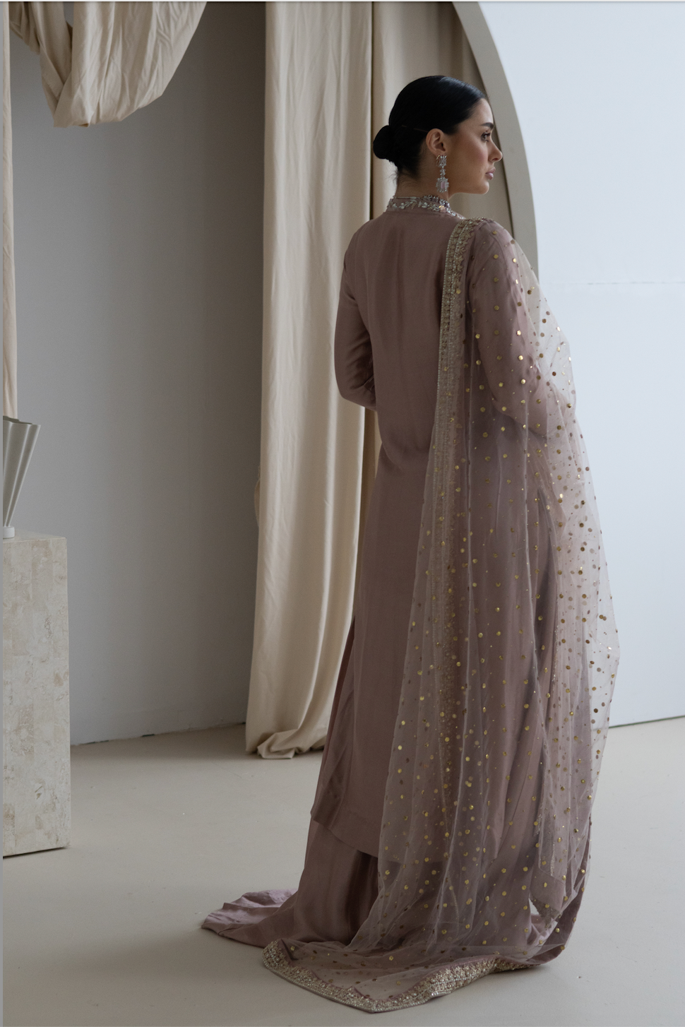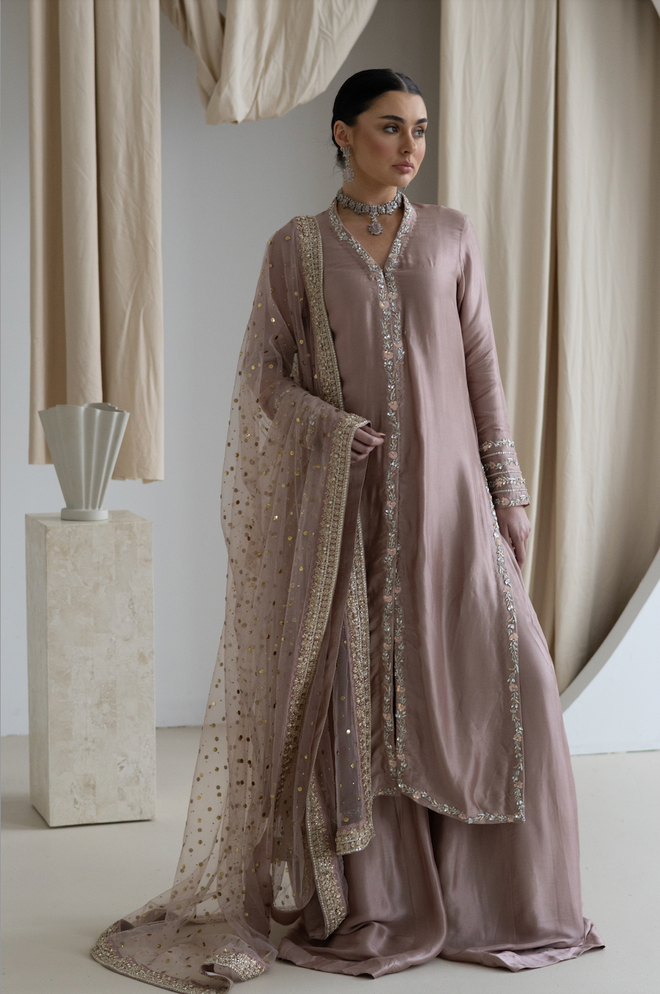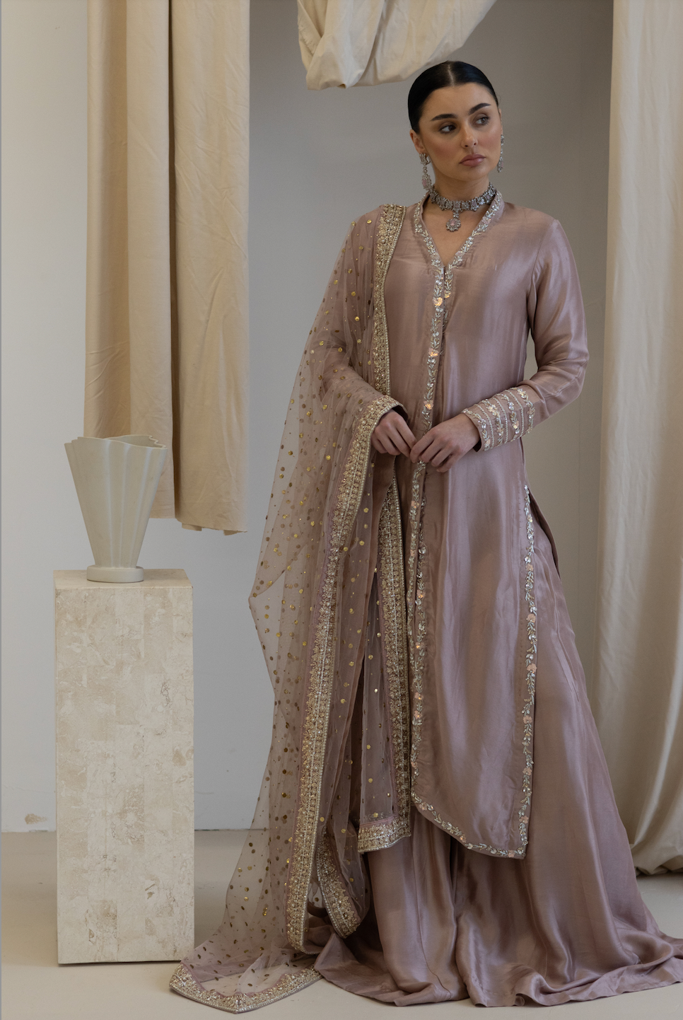 Step into elegance with Ivy. The rich sheesh silk kameez, designed as a stylish jacket, features intricate detailing that enhances its sophisticated charm. Its soft, dusky pink hue exudes warmth and grace, making it the perfect choice for any formal or celebratory occasion.