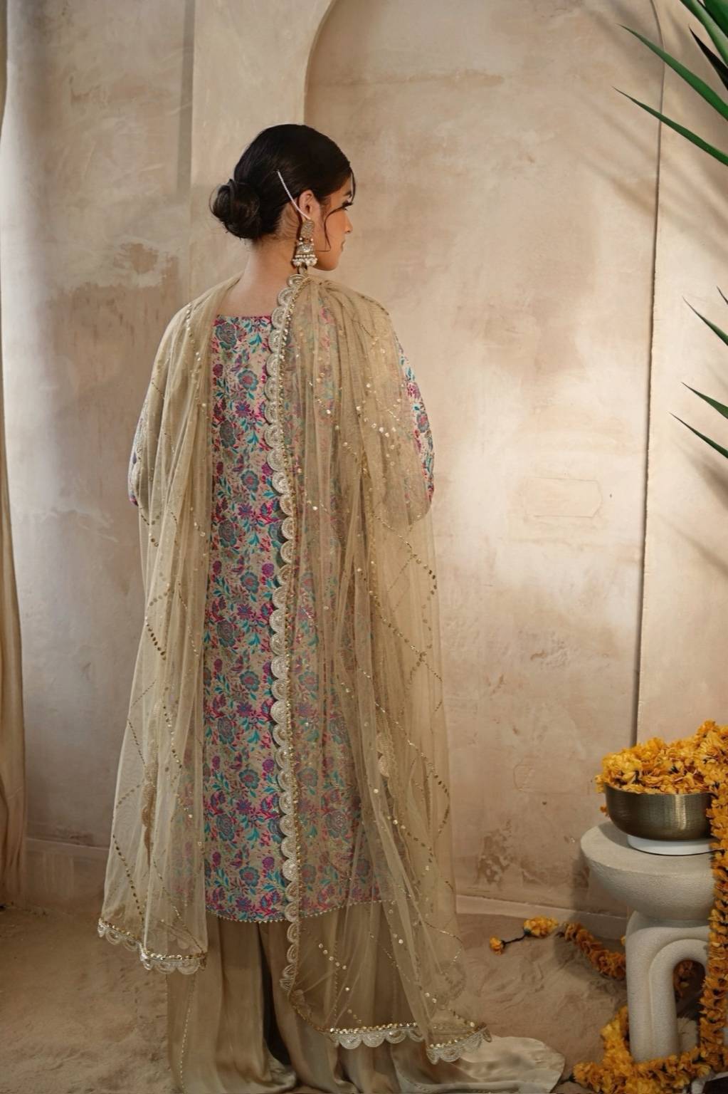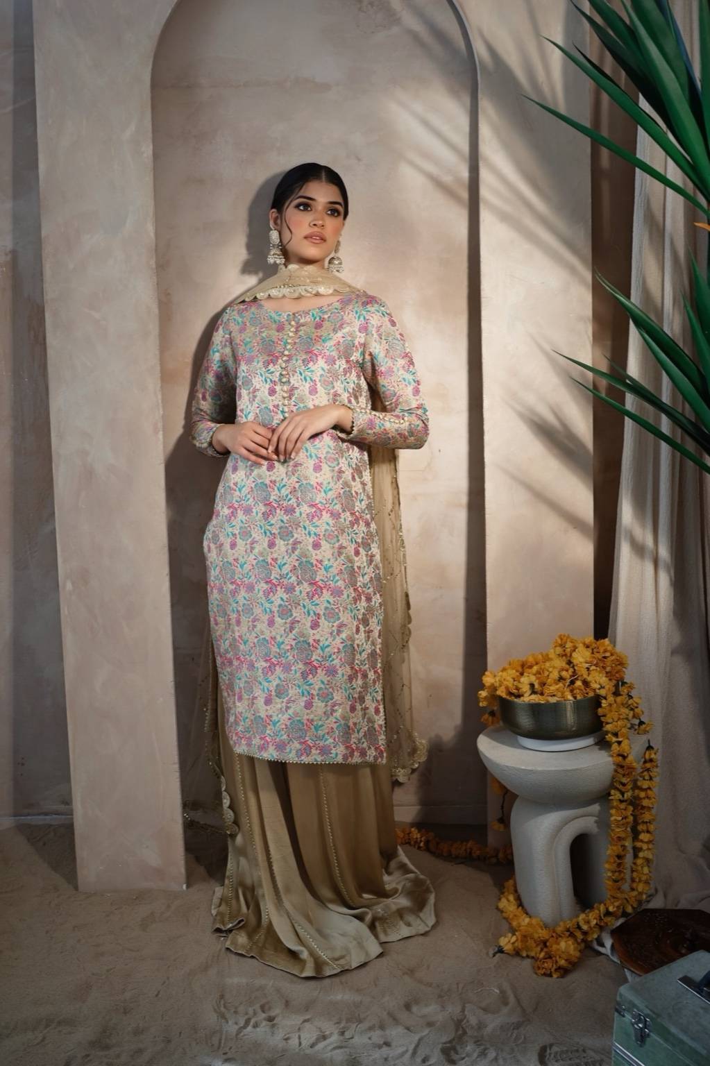 A beautifully crafted cream Banarsi kameez with a subtle lavender print, featuring detailed sleeves and a refined neckline. Paired with a Russian silk sharara and a soft net dupatta adorned with Kamdani work, this ensemble exudes timeless charm — perfect for weddings, festive occasions, or elegant gatherings.
