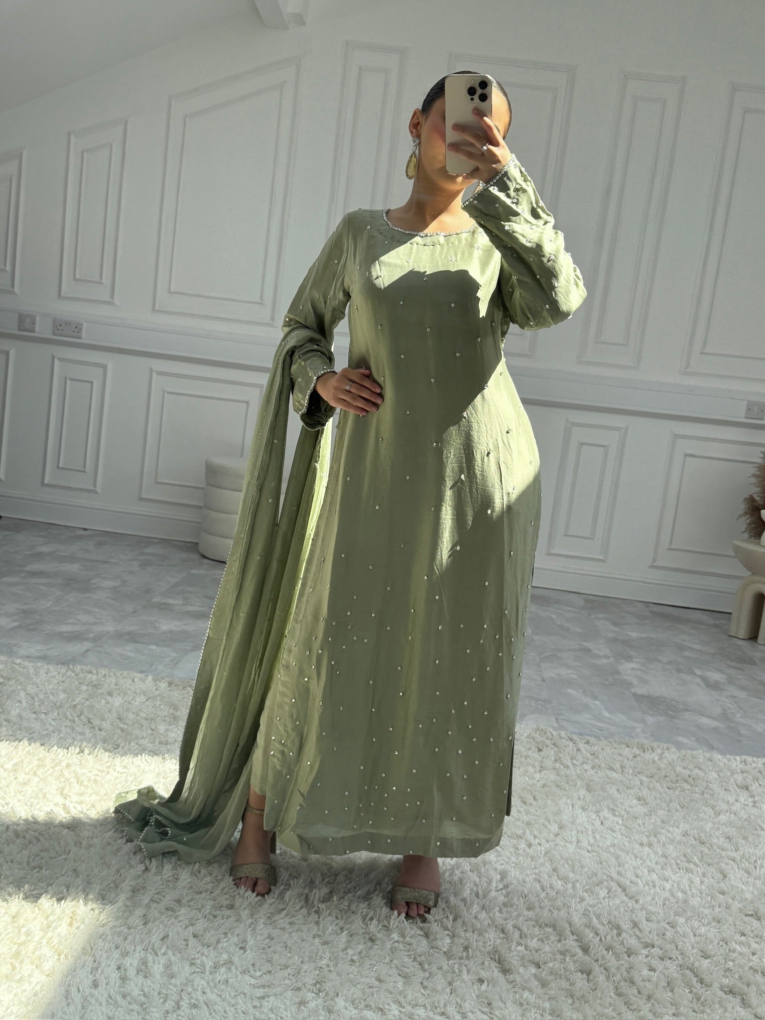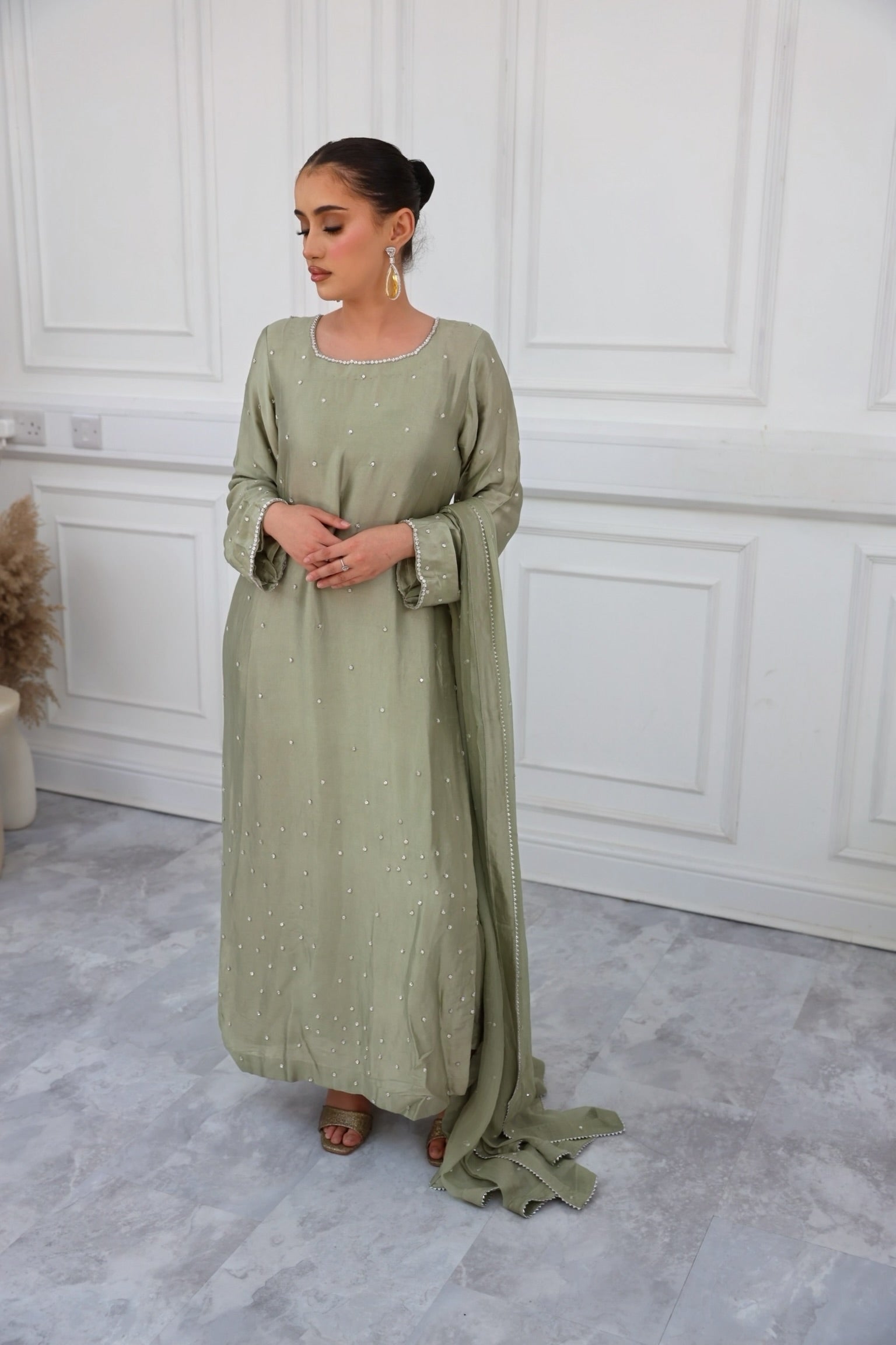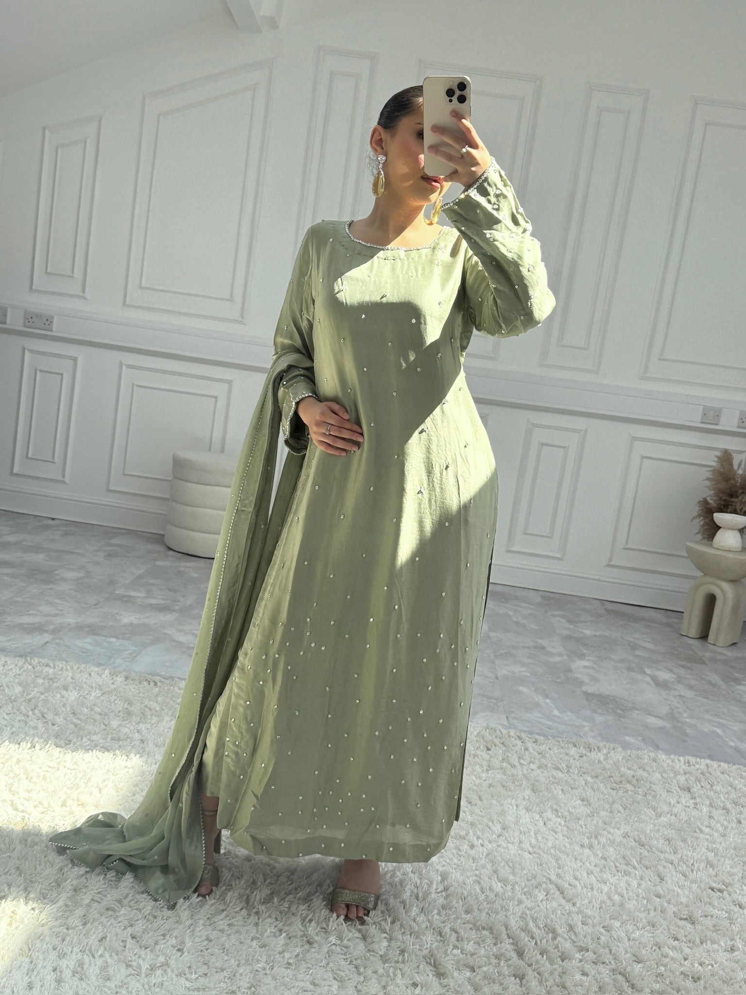 Green sheesh silk long kameez featuring stone hand embellishments, accompanied by a chiffon dupatta adorned with scattered lace trim, paired with straight sheesh silk trousers.