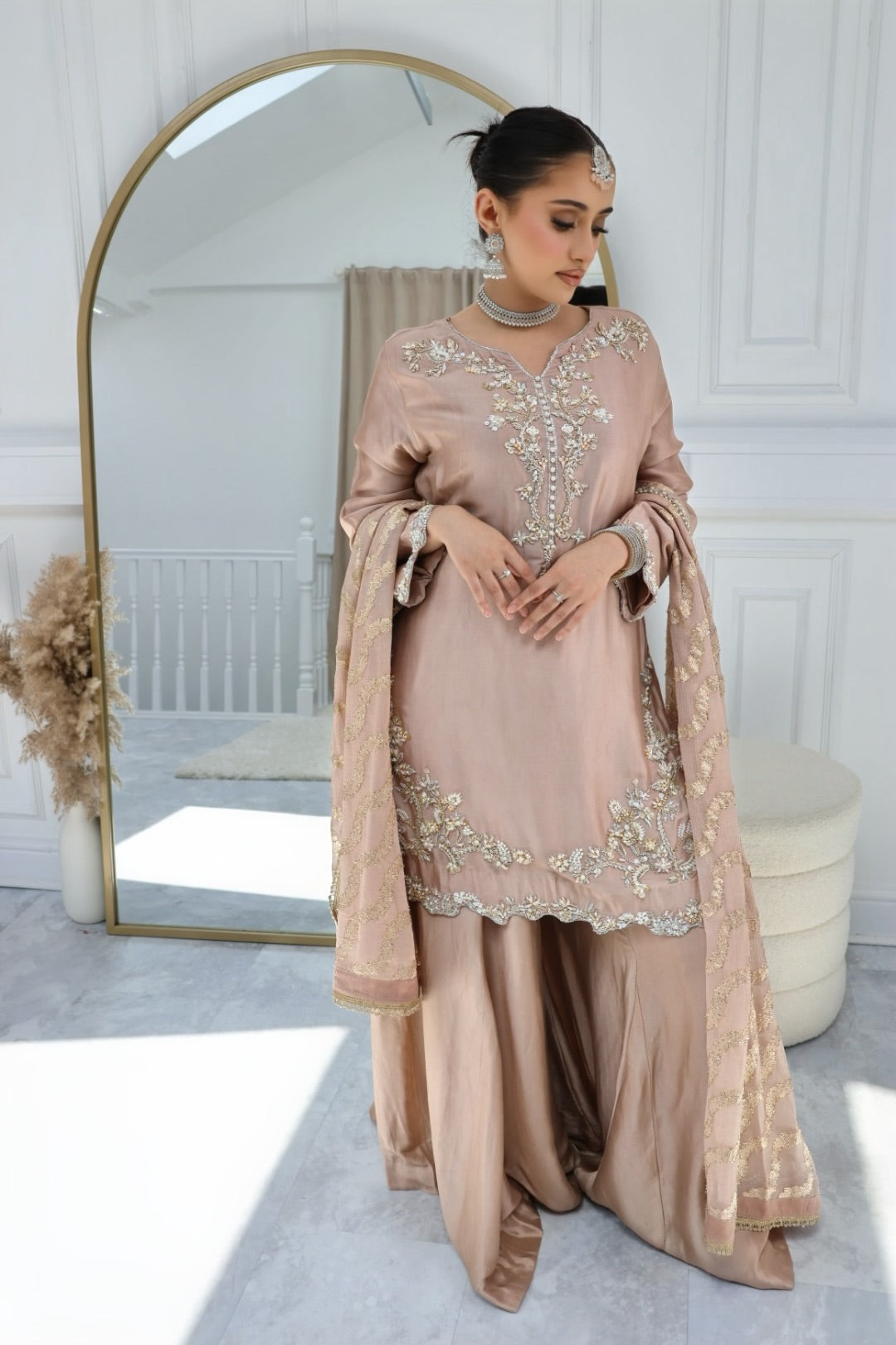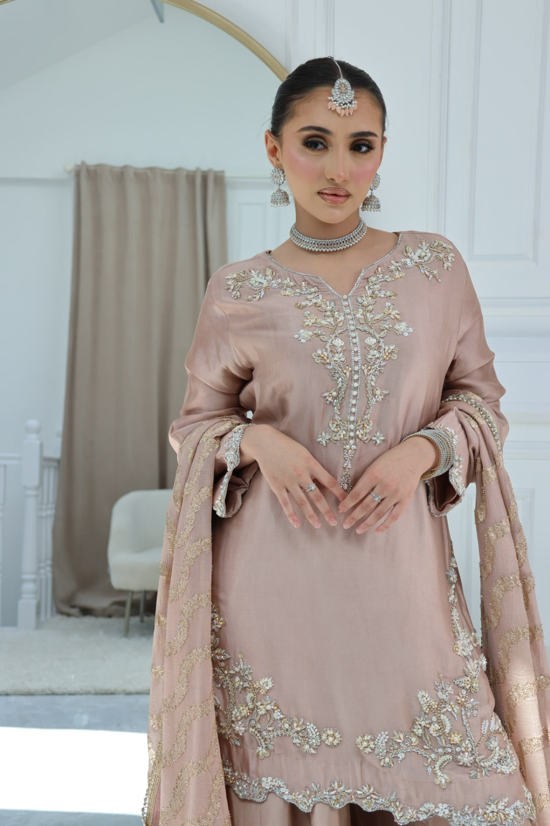 Our no 1 best seller in Delina in Pink sheesh silk with hand embellishment with panelled sharara pants and foil dupatta with lace trims.