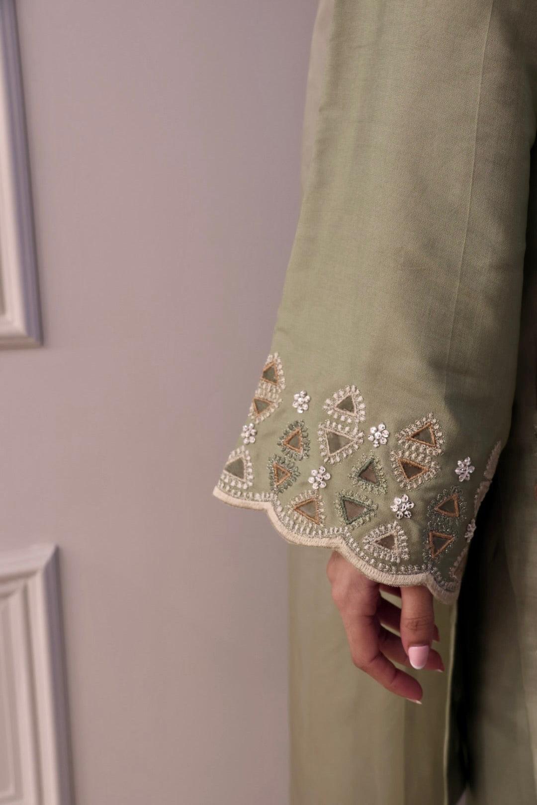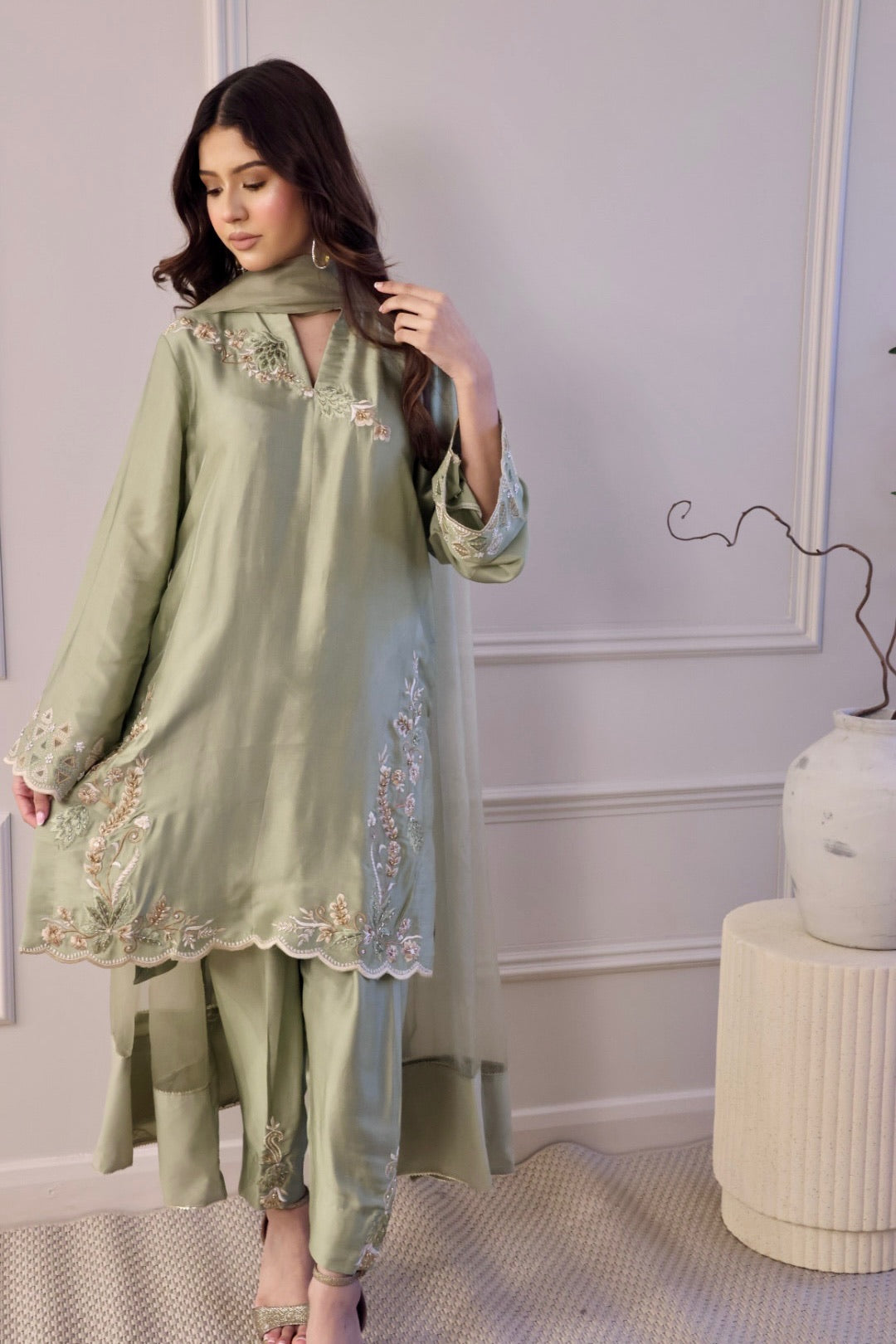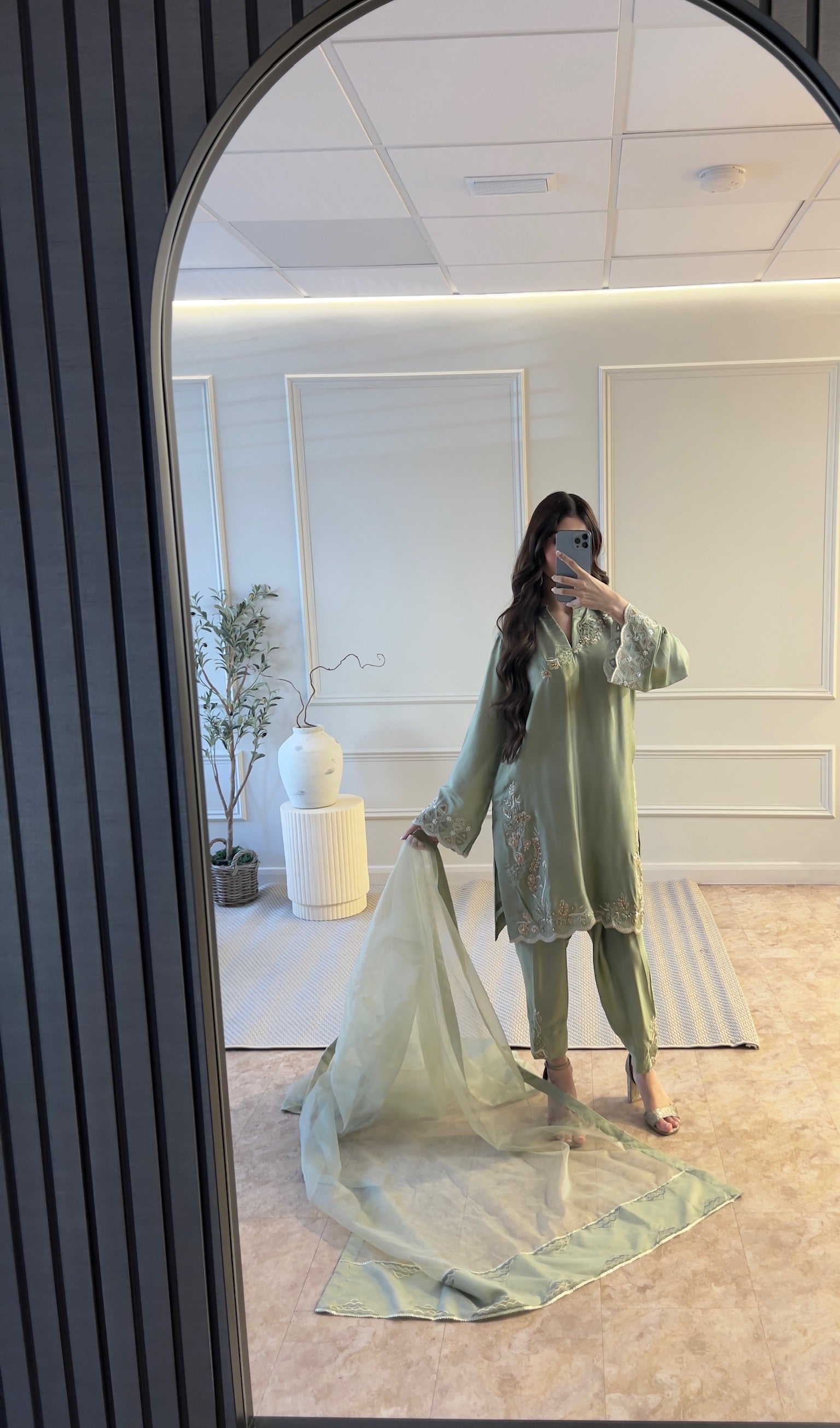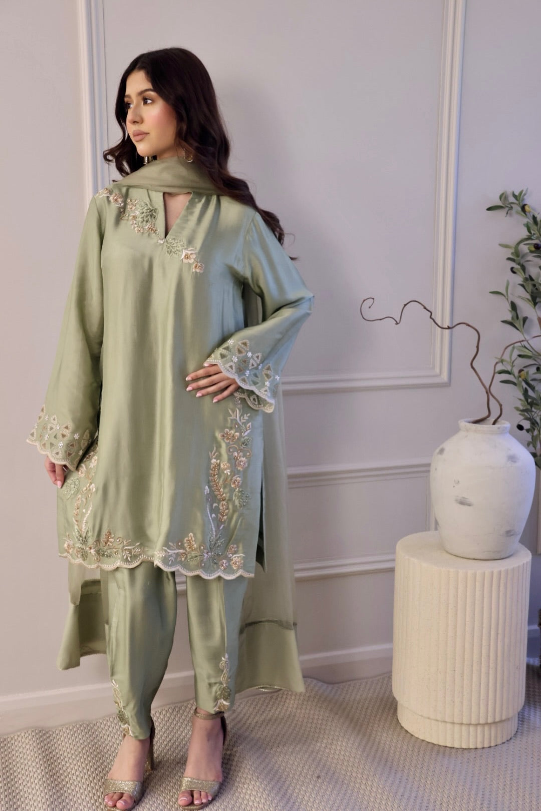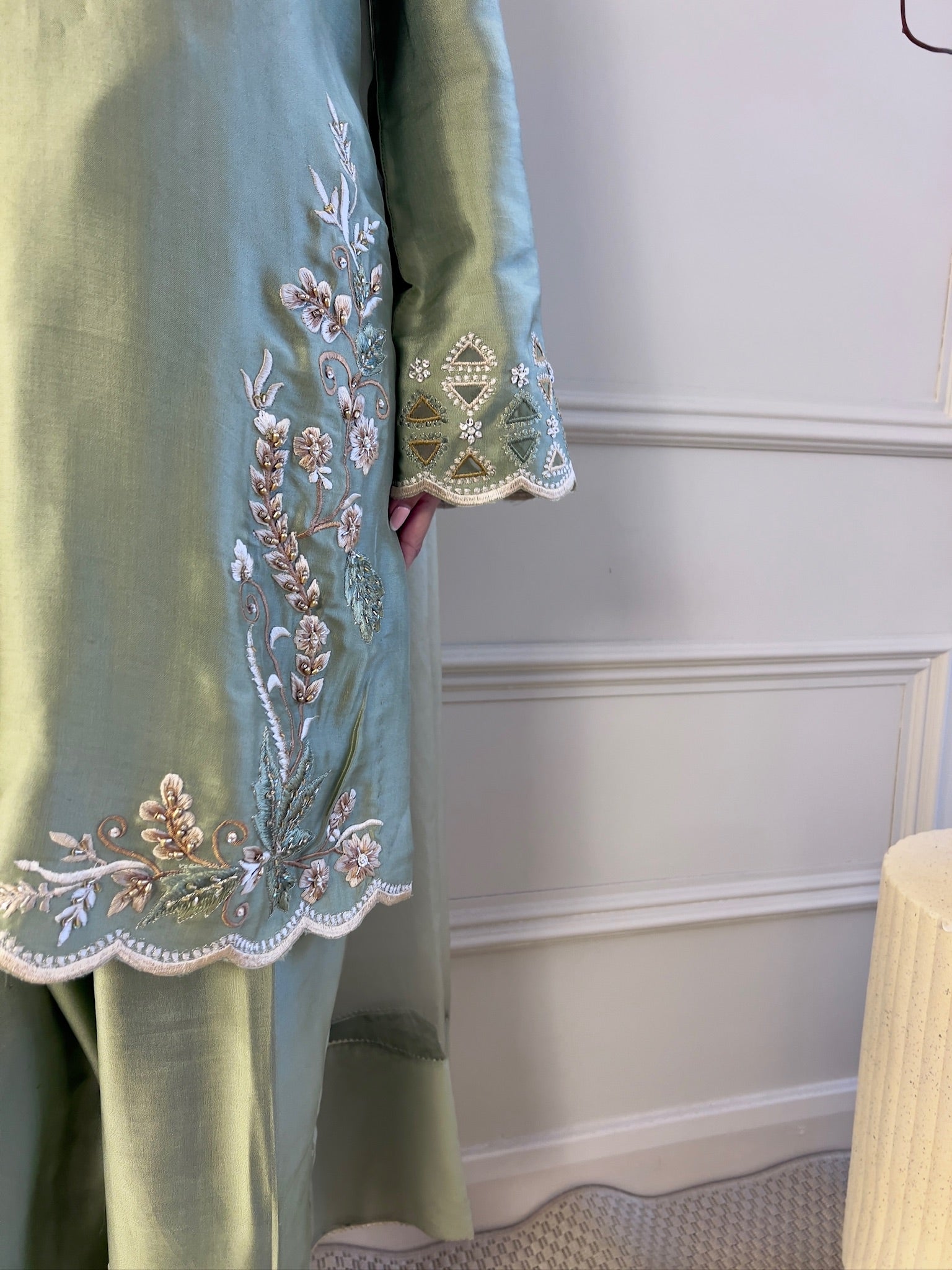 3 piece sheesh silk short kameez with hand thread embroidery and cut work detailed sleeves with sheesh silk tulip shalwar with embroidery details with organza dupatta stitched suit