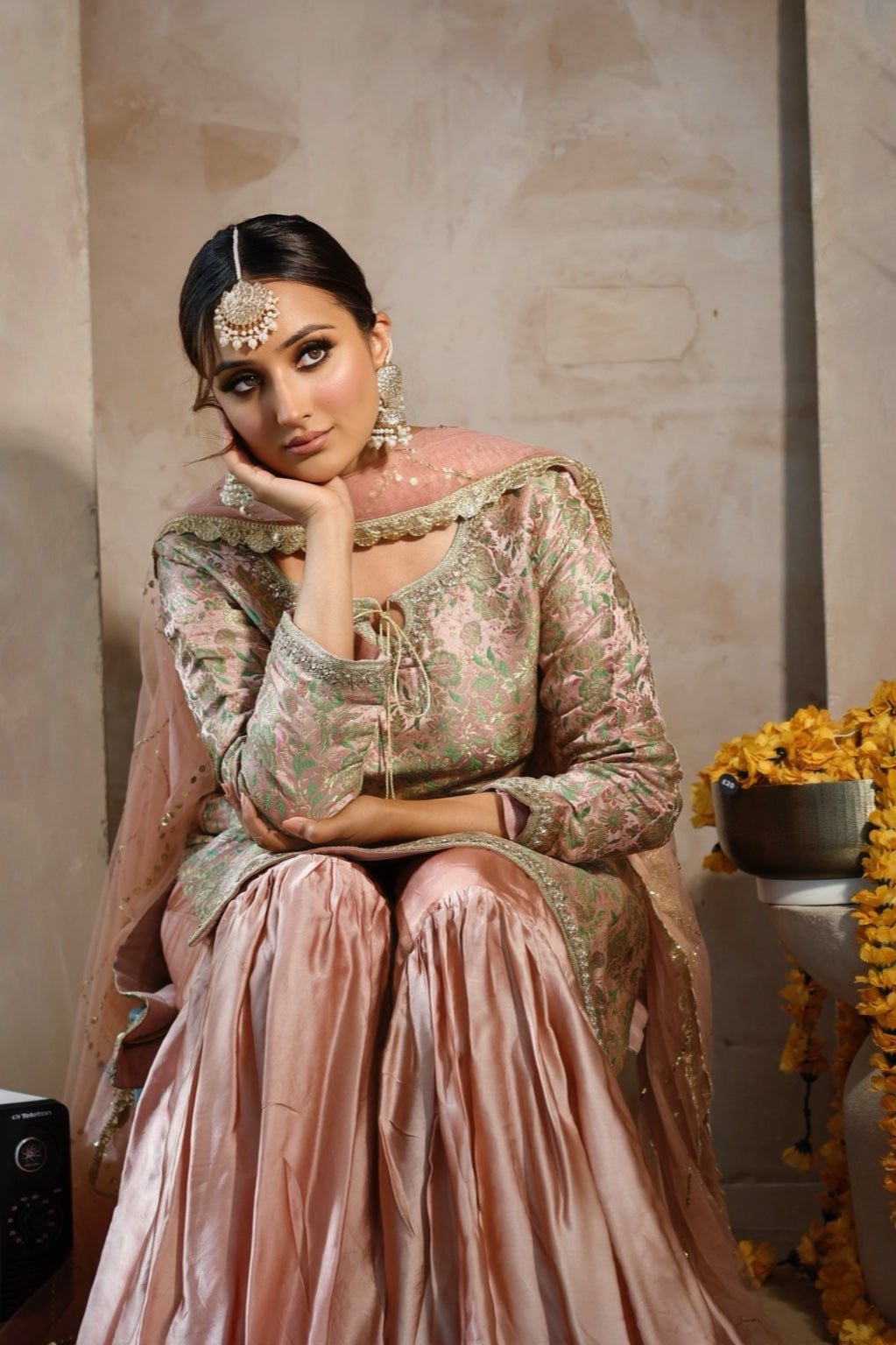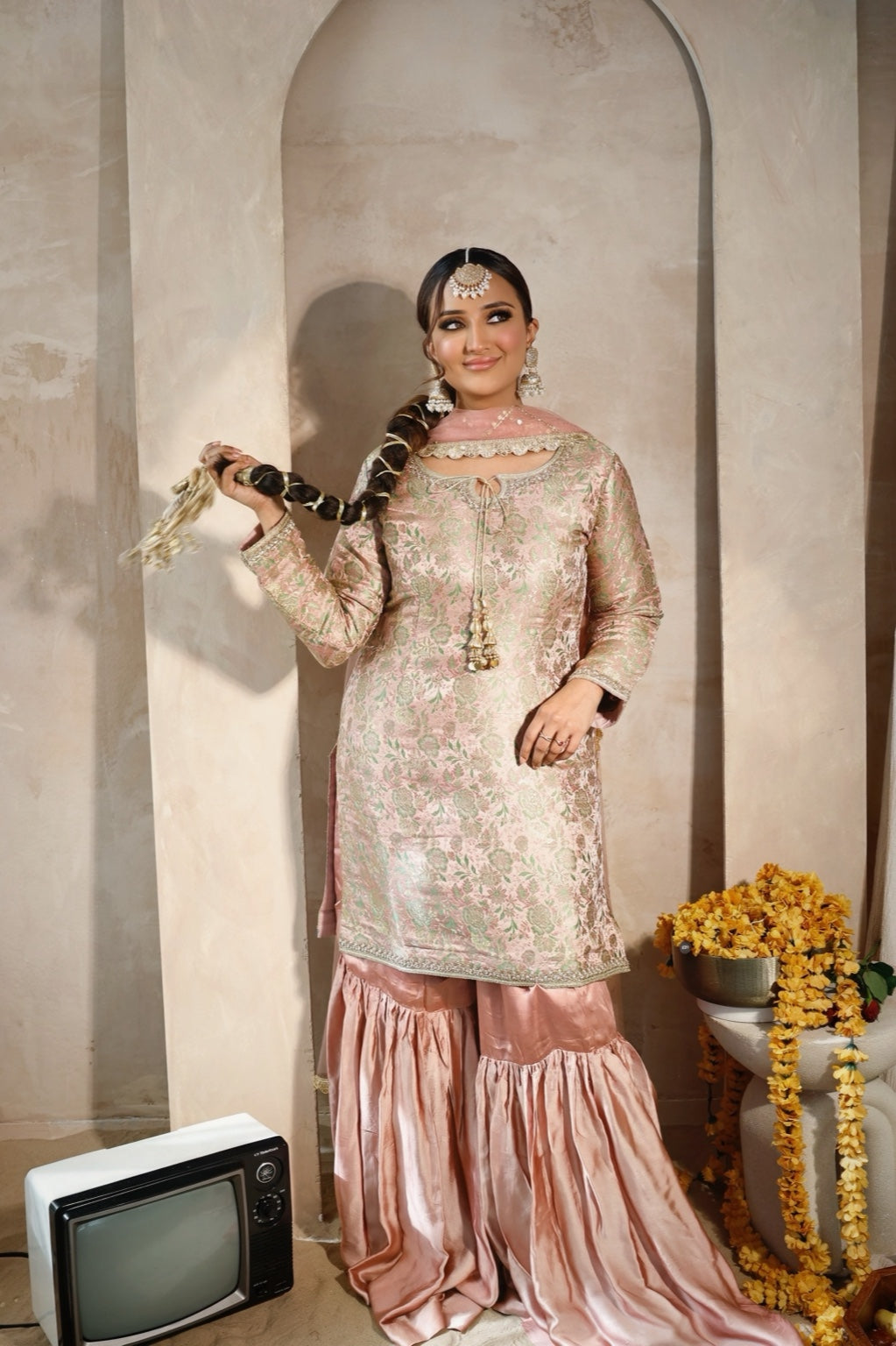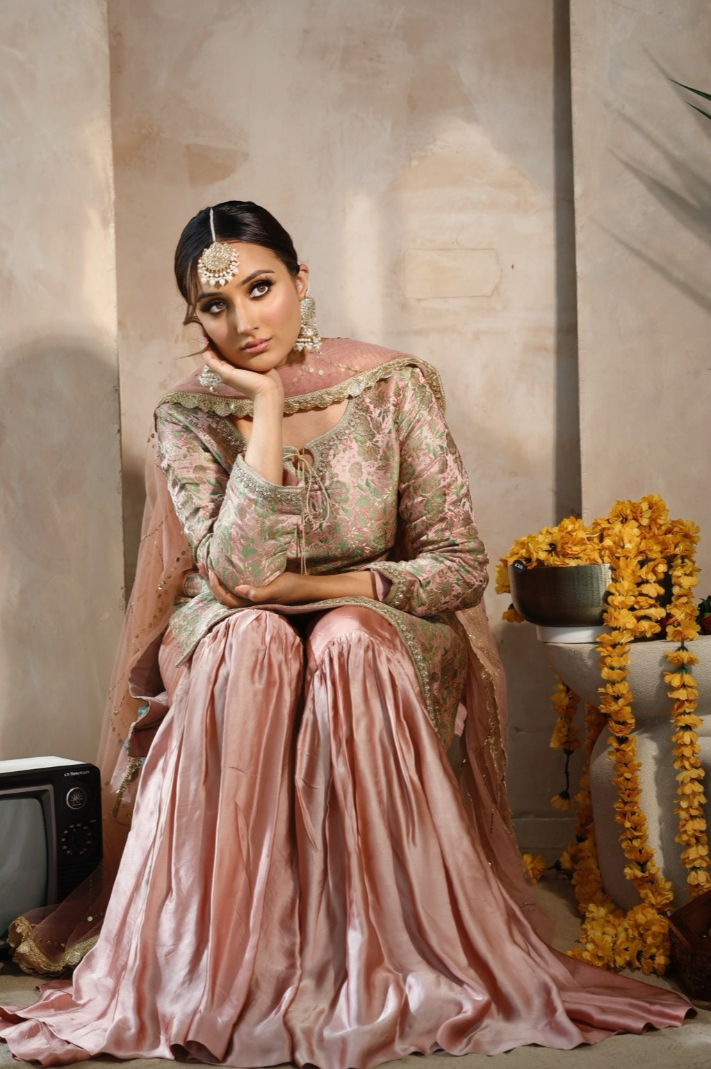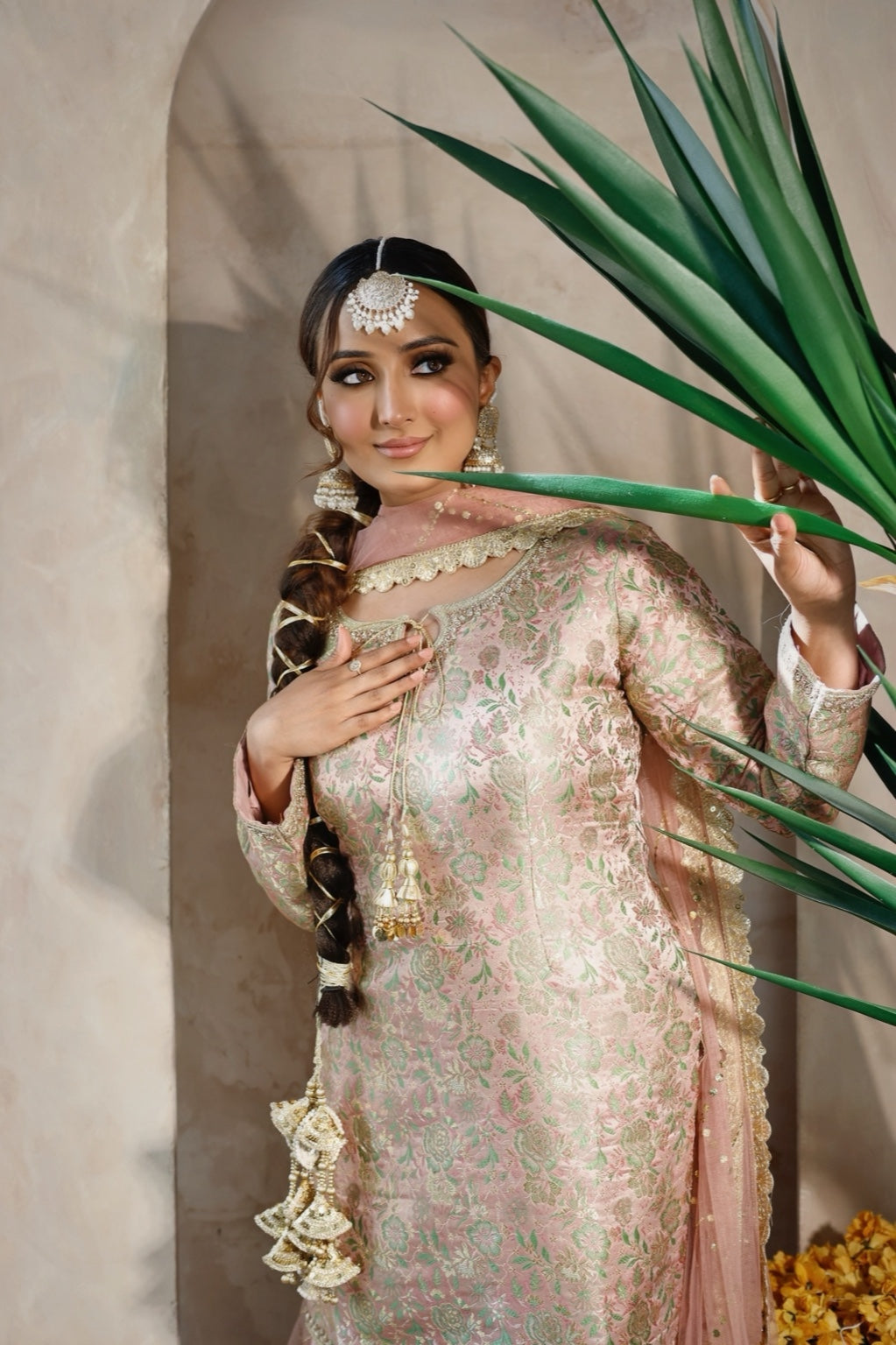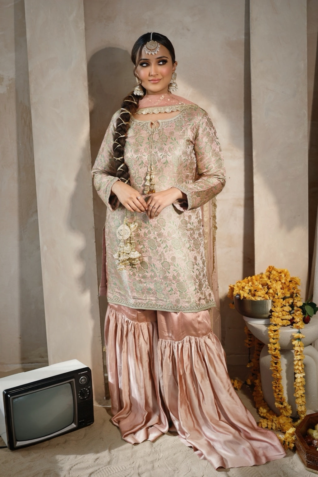 A graceful cream and pink Banarsi kameez paired with a flowing Russian silk gharara and a net dupatta adorned with Kamdani work. Featuring detailed sleeves and an intricately finished neckline, this outfit is perfect for weddings, dholkis, and festive events.