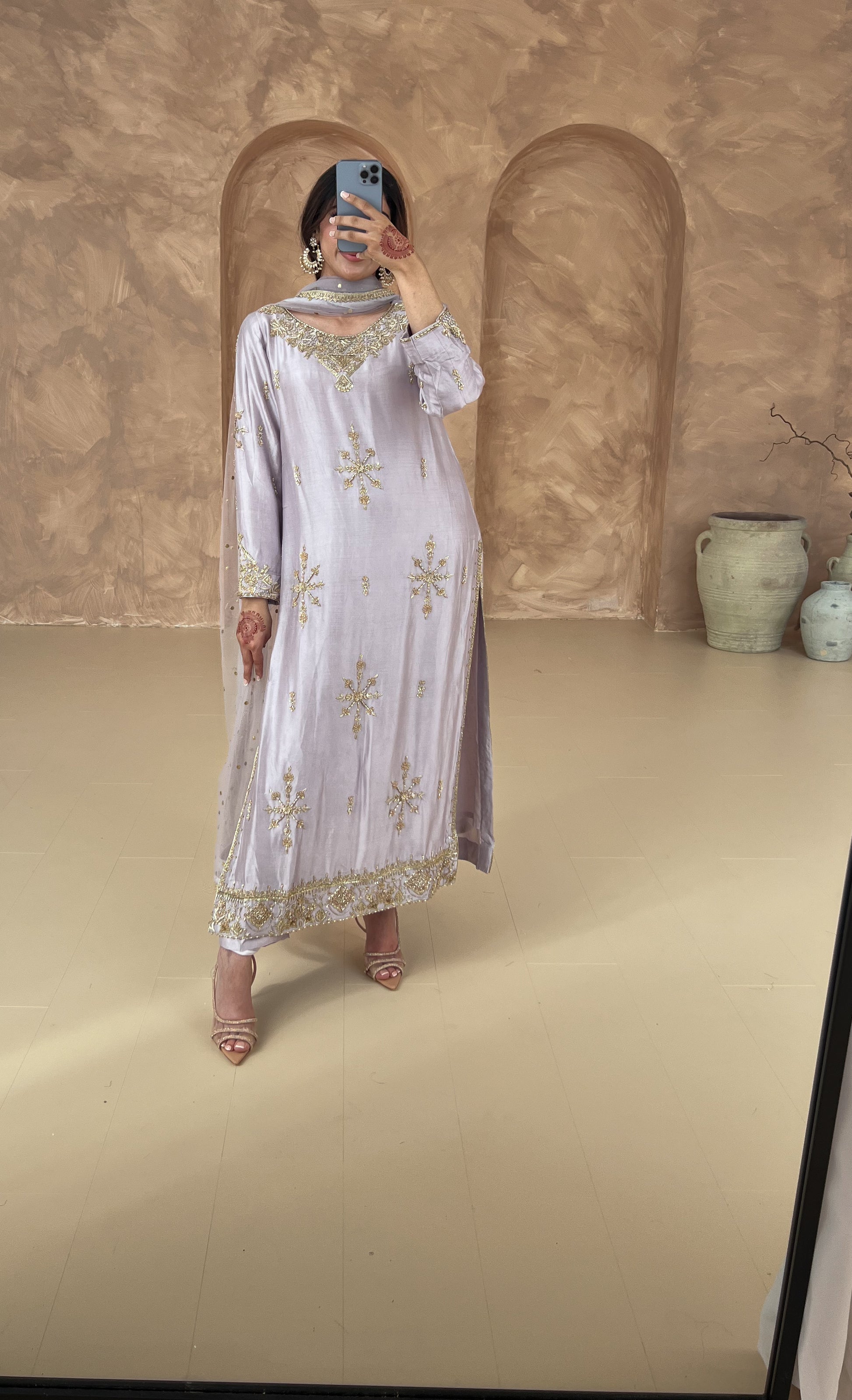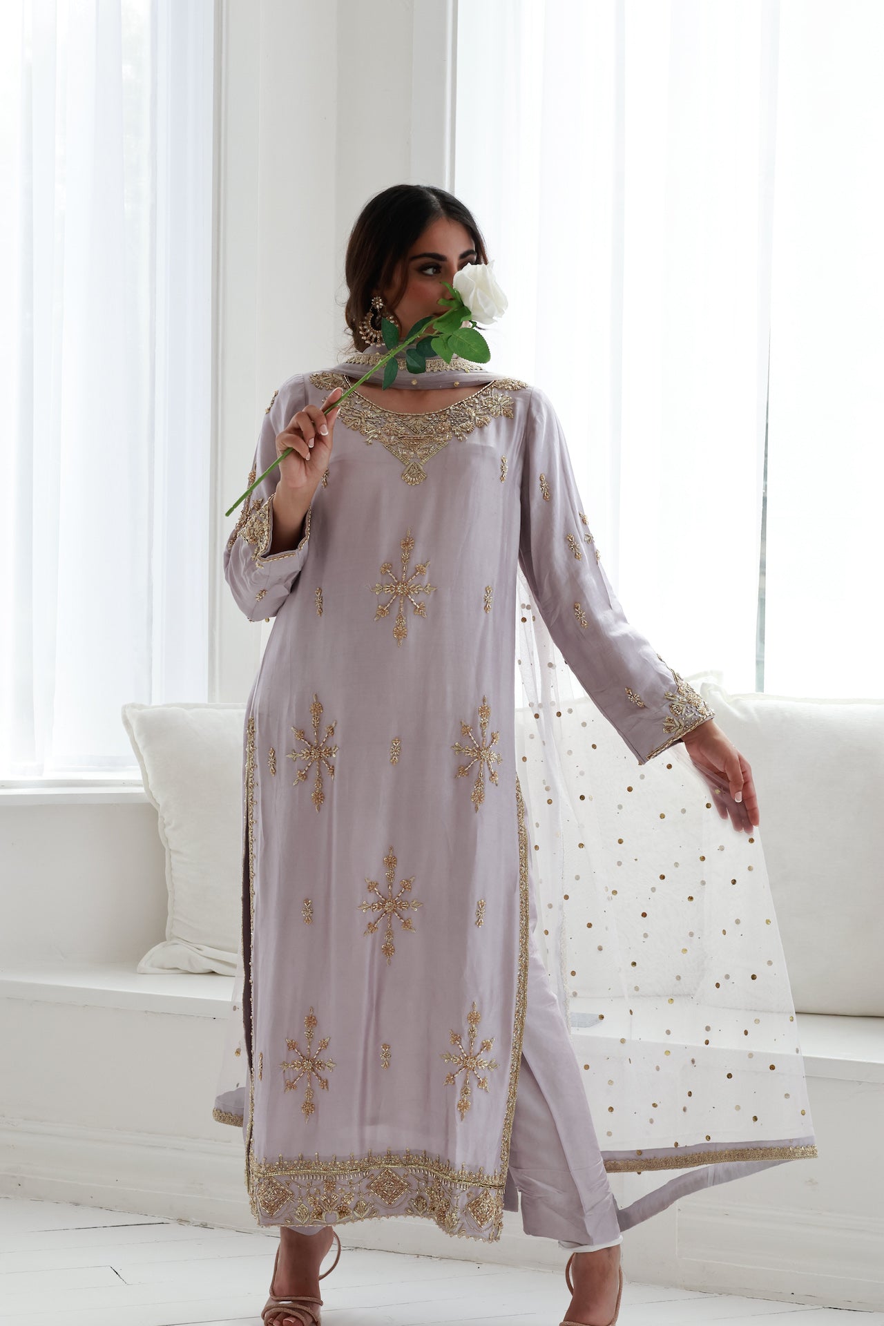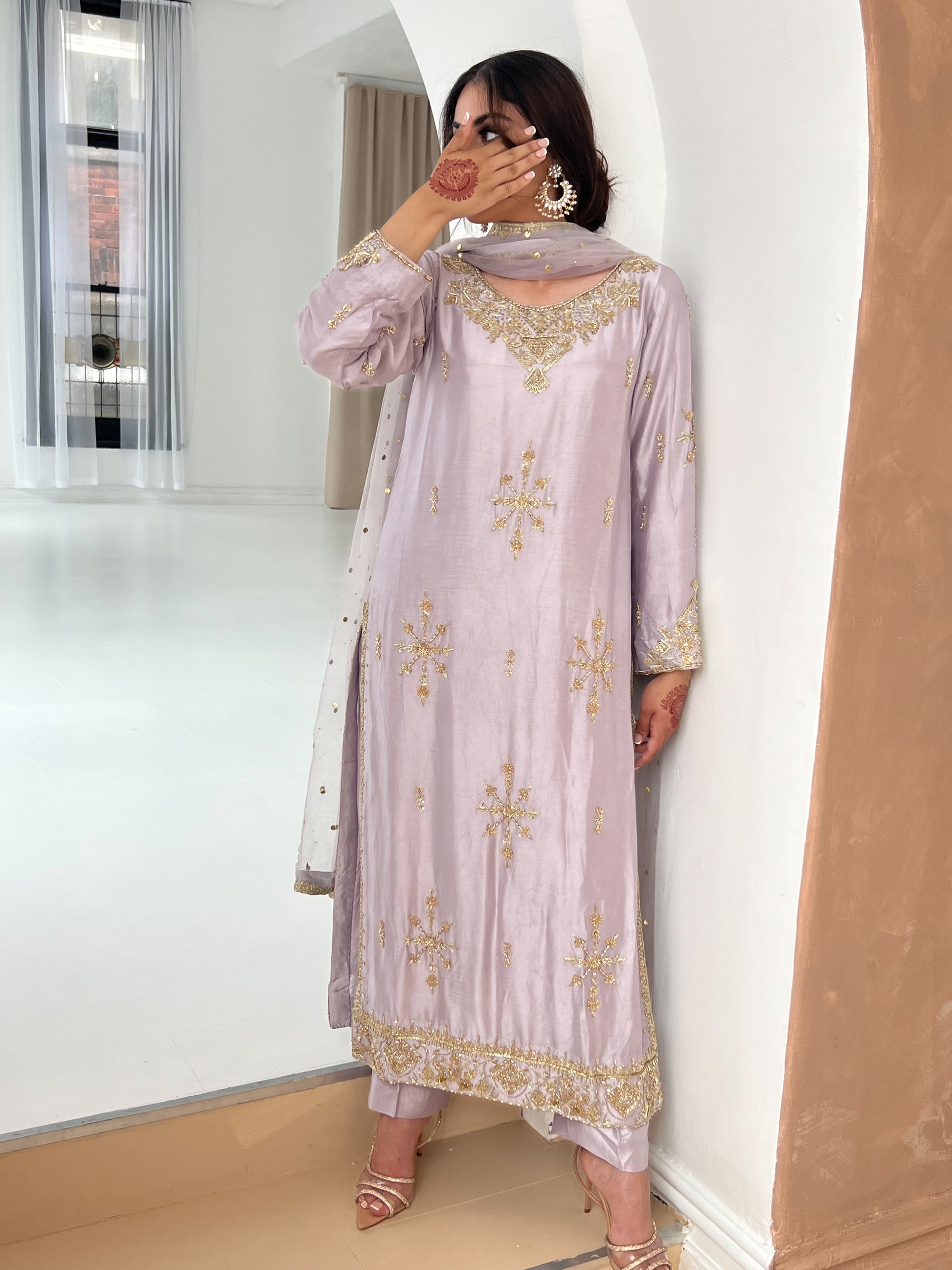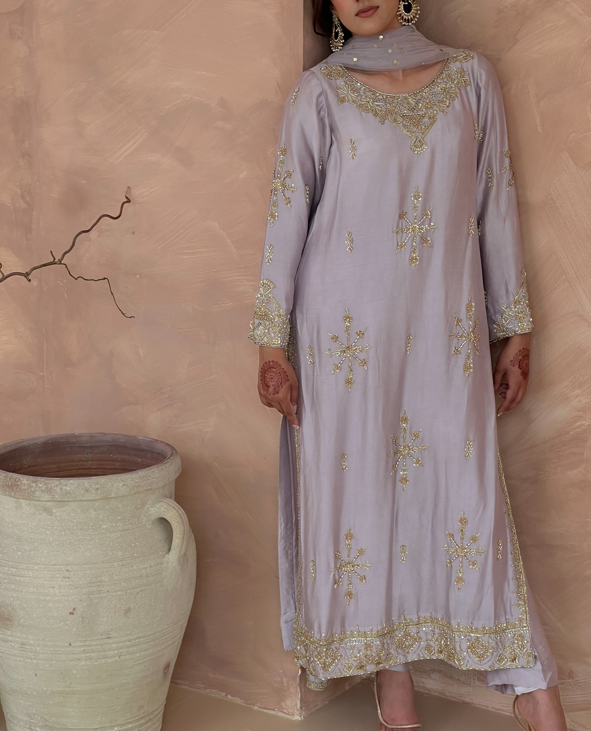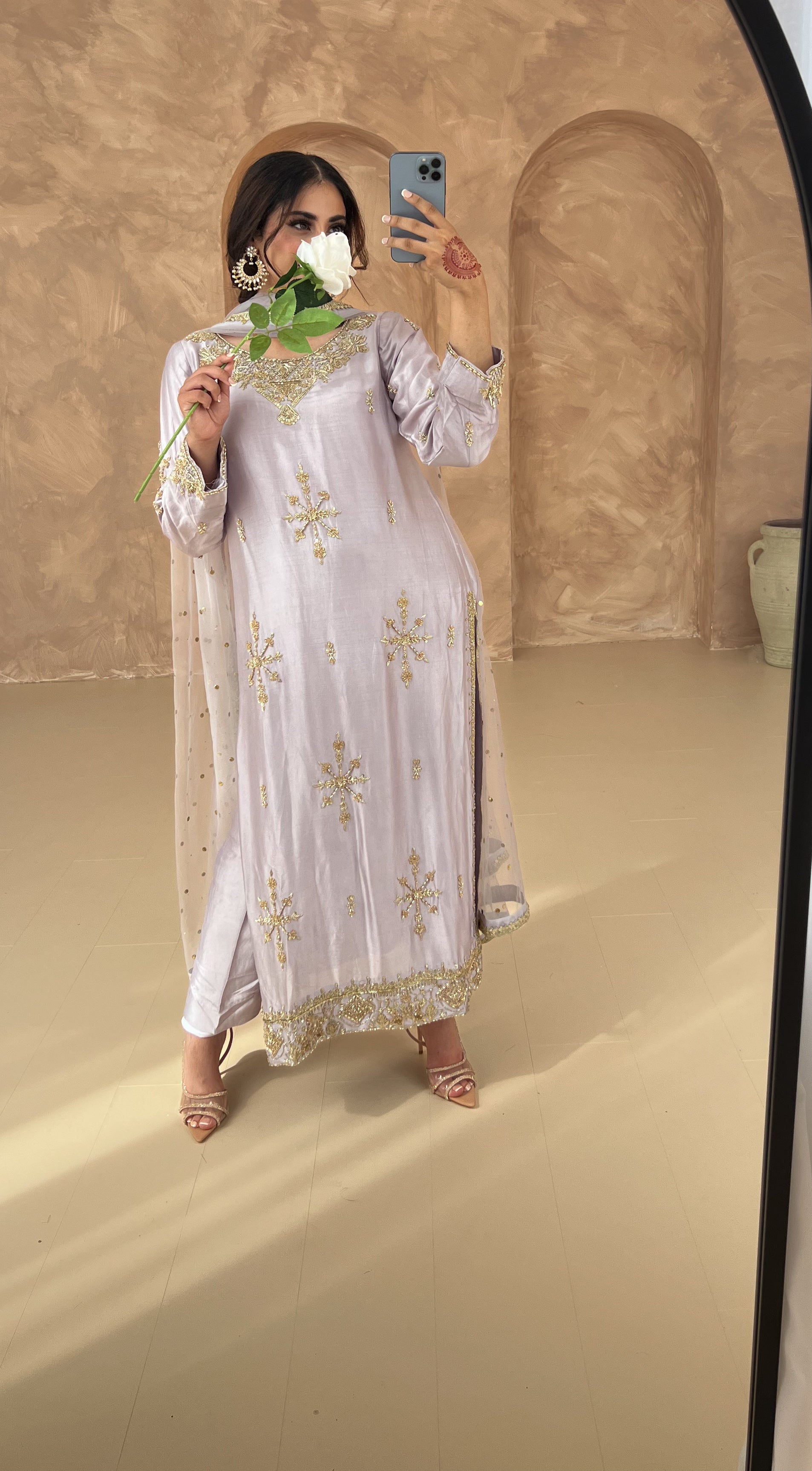 Introducing 'Nazo', a stunning ensemble featuring a long lavender kameez with dull gold embellishment. The kameez is crafted from premium sheesh silk fabric, offering a luxurious feel and a captivating appearance. It's paired with a tampered sheesh silk trouser, adding a touch of elegance to the overall look. The net dupatta with intricate lace trim and Kamdani scatter adds a delicate charm, completing the ensemble. This outfit is perfect for special occasions, offering a blend of comfort and style.