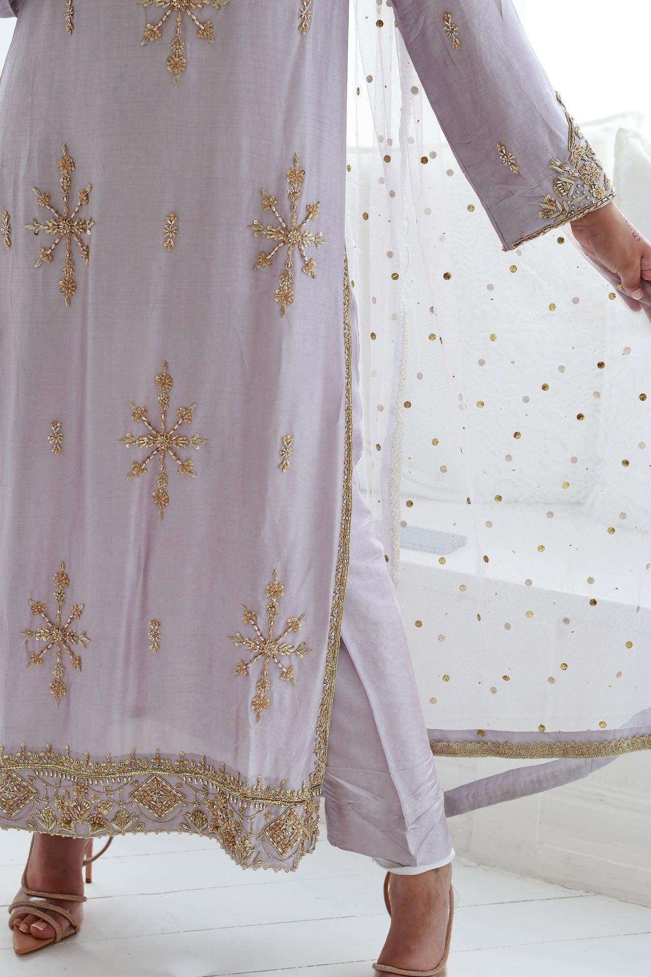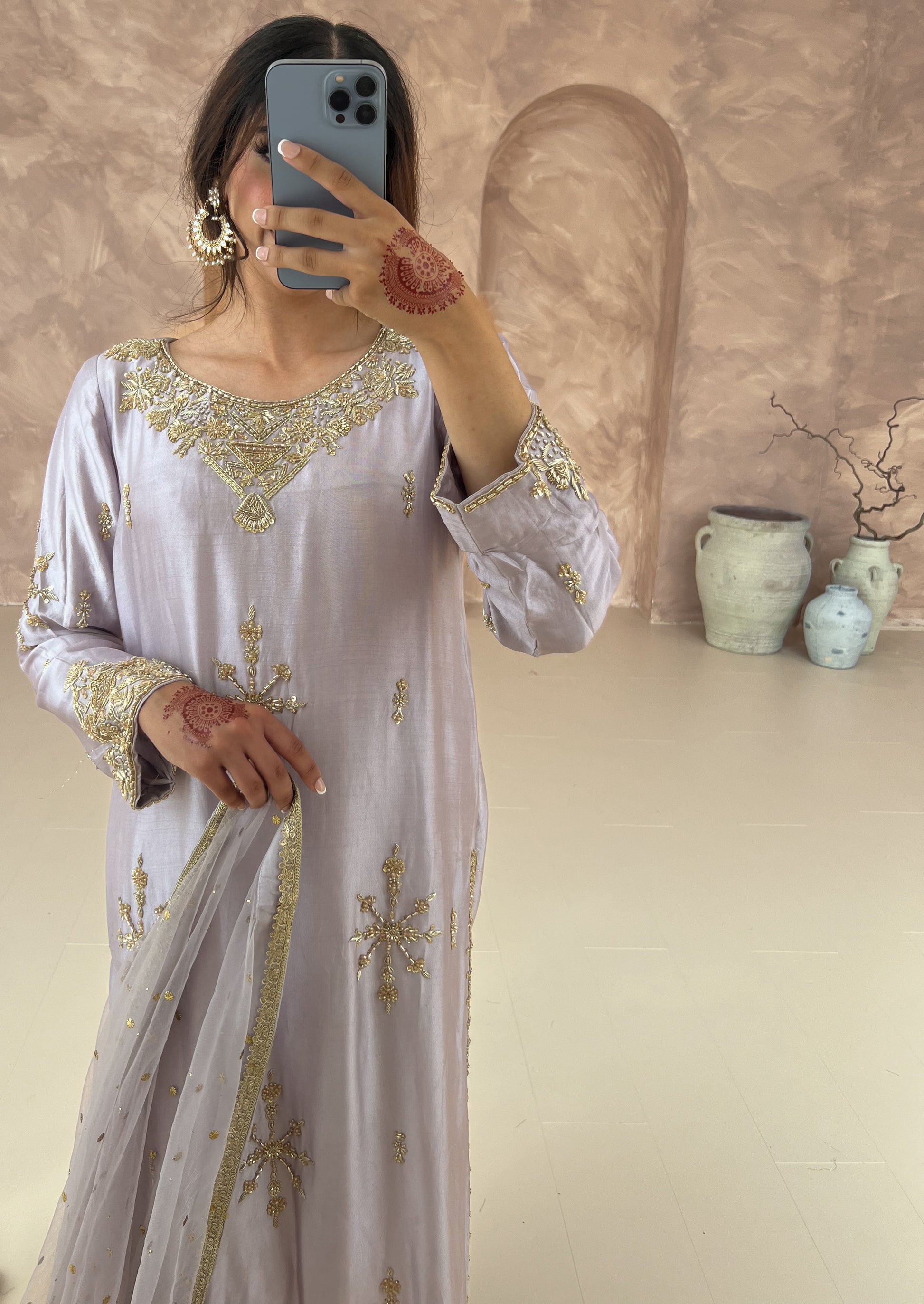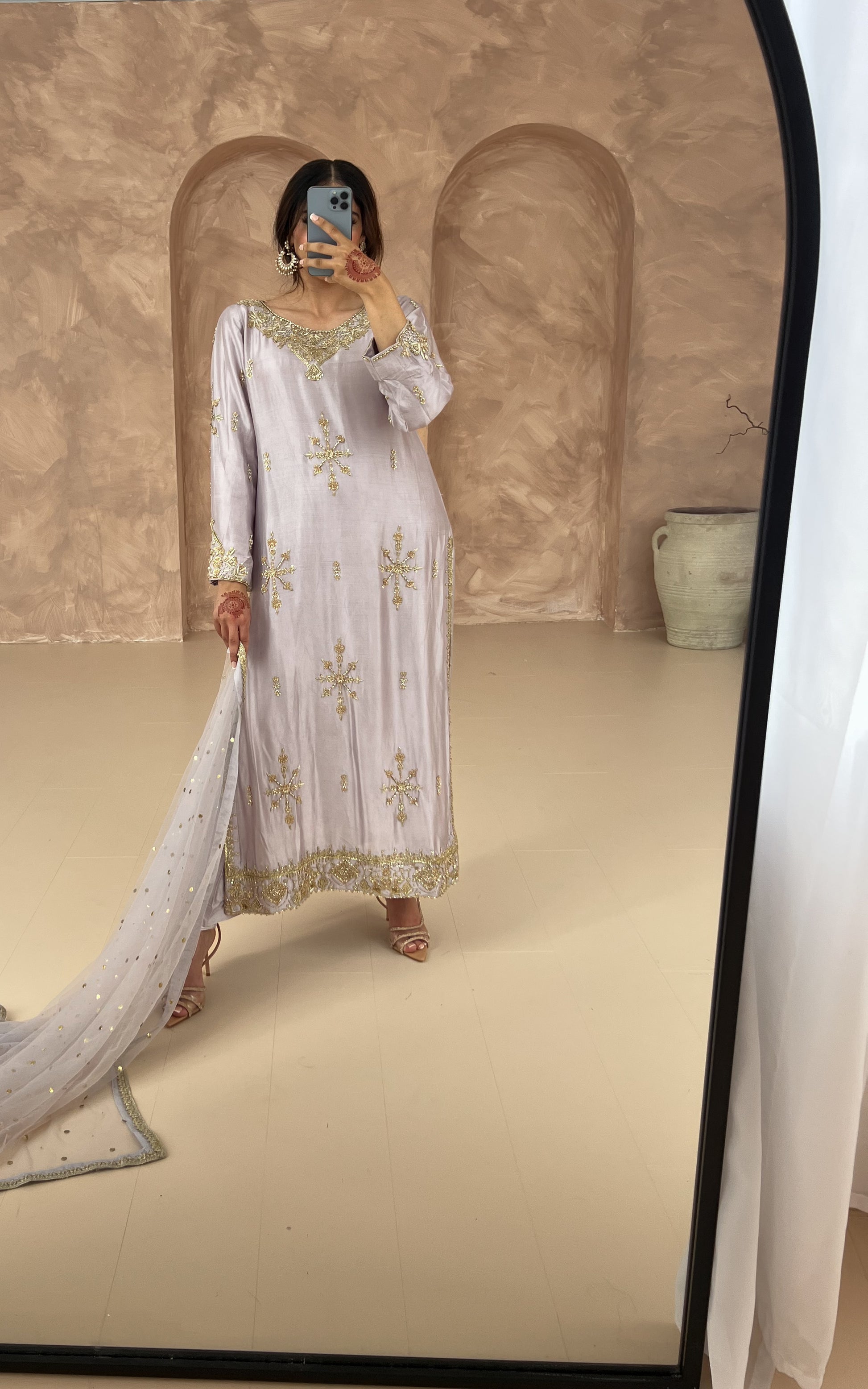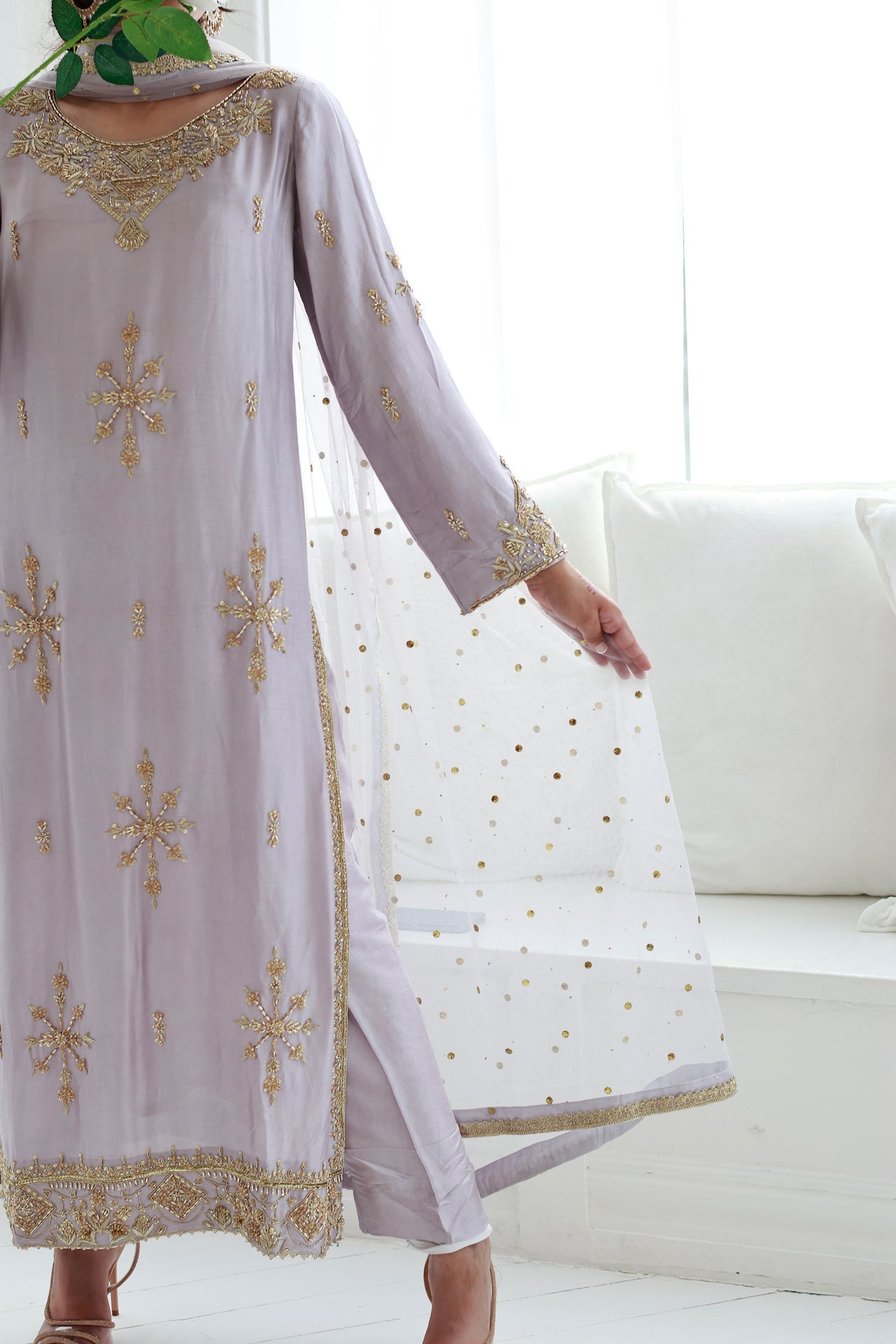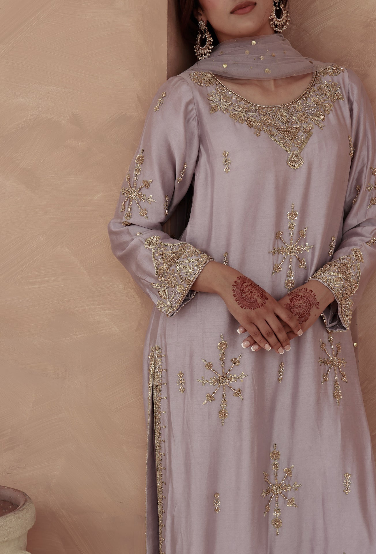 Introducing 'Nazo', a stunning ensemble featuring a long lavender kameez with dull gold embellishment. The kameez is crafted from premium sheesh silk fabric, offering a luxurious feel and a captivating appearance. It's paired with a tampered sheesh silk trouser, adding a touch of elegance to the overall look. The net dupatta with intricate lace trim and Kamdani scatter adds a delicate charm, completing the ensemble. This outfit is perfect for special occasions, offering a blend of comfort and style.
