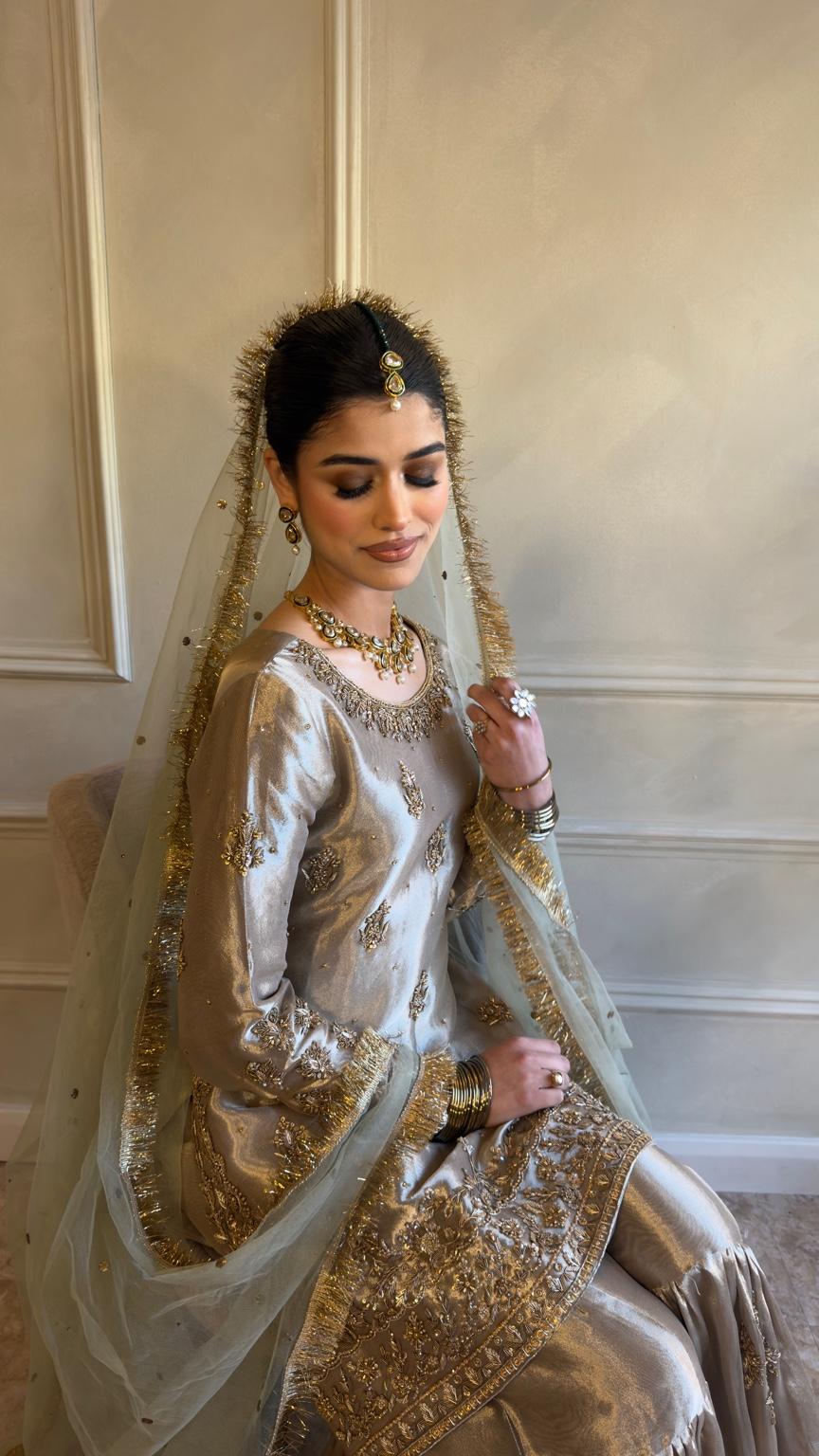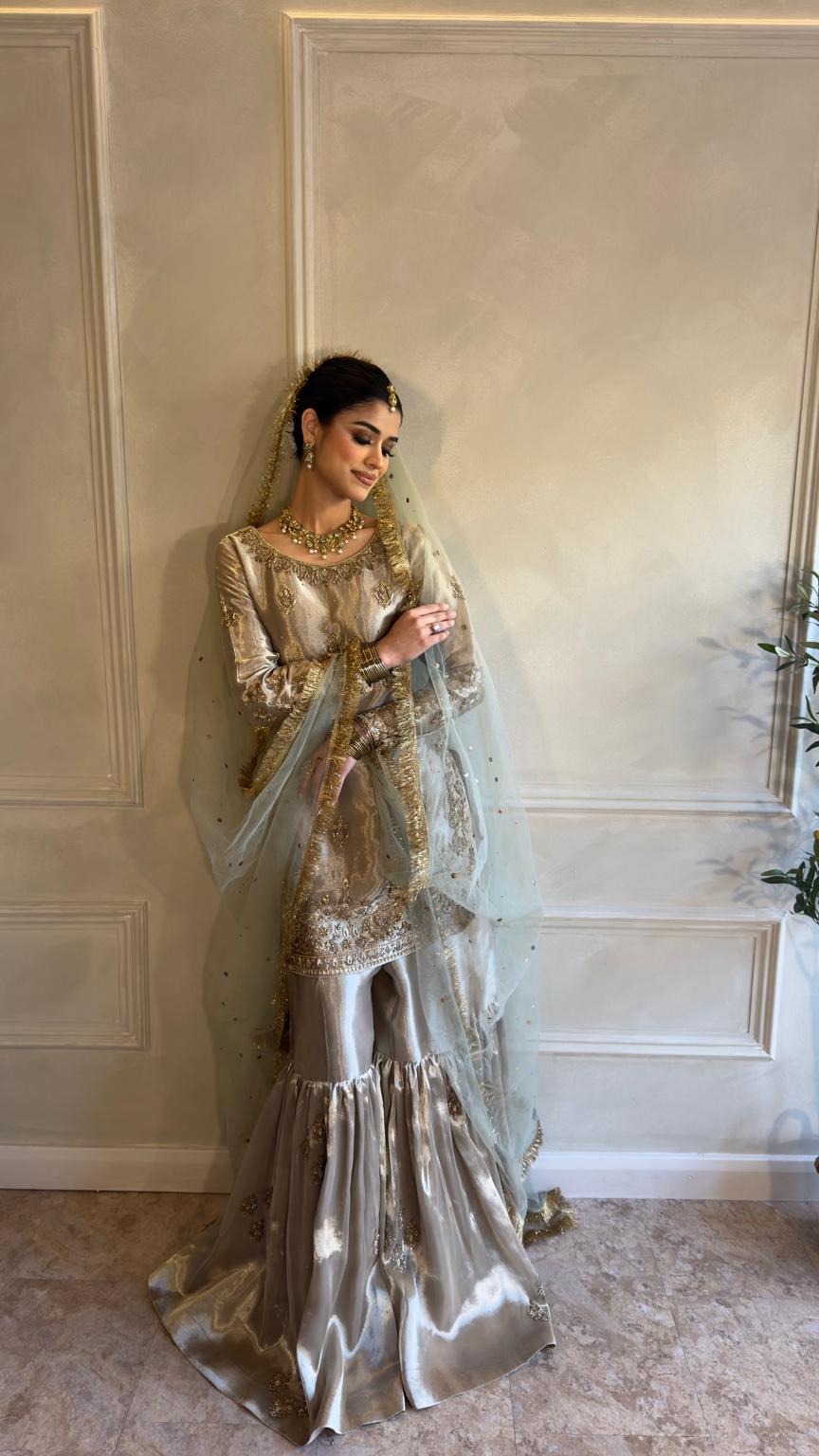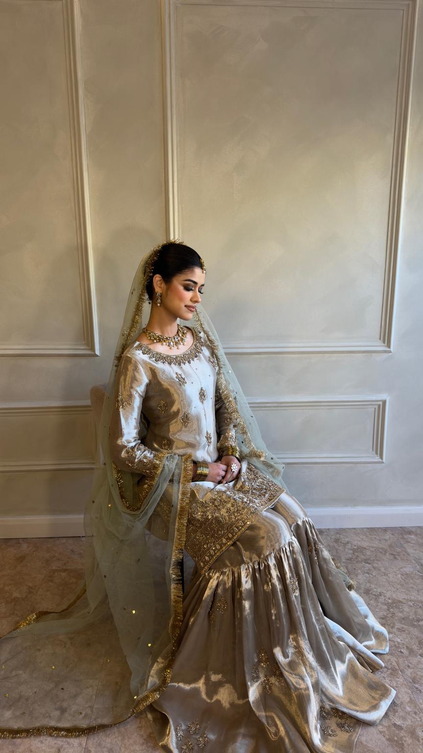 The ensemble is paired with a traditional flared gharara, finished with subtle embellishment that adds movement and ceremonial grace. A sheer net sage green dupatta with fine gold detailing completes the look, draping beautifully to frame the silhouette without overwhelming it.
