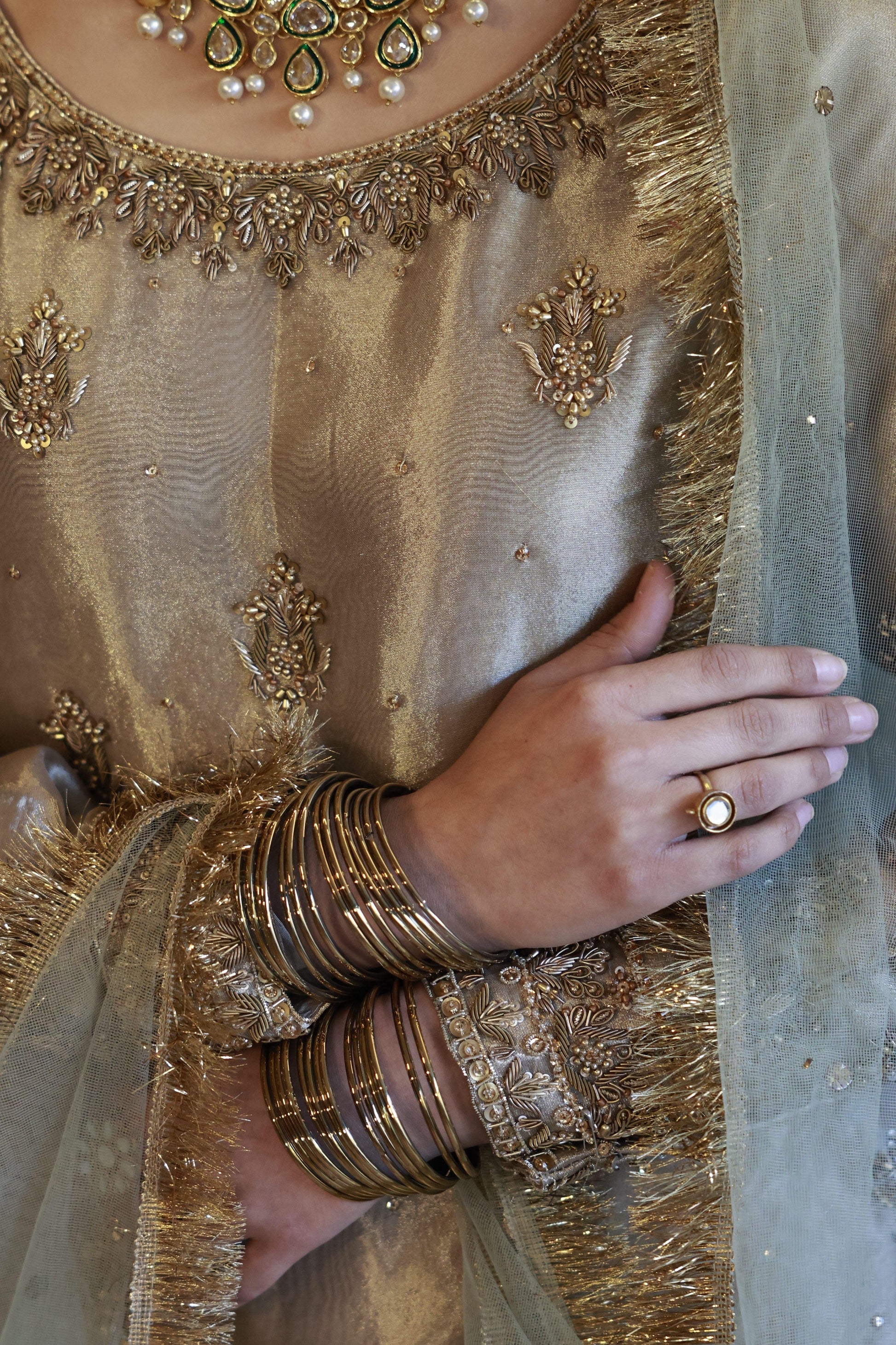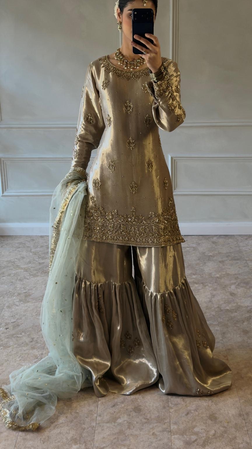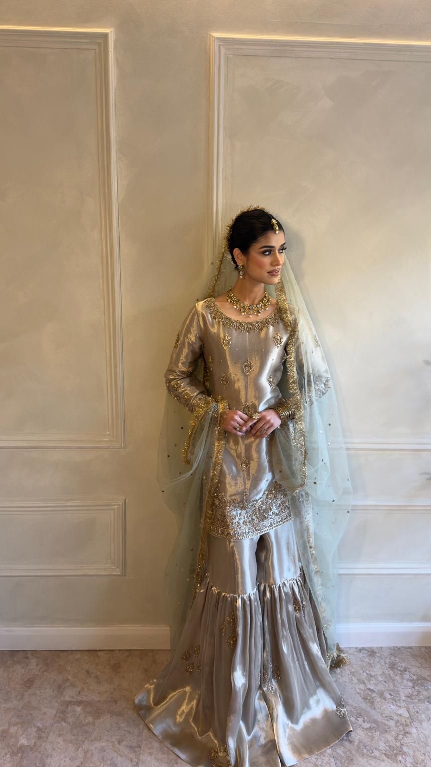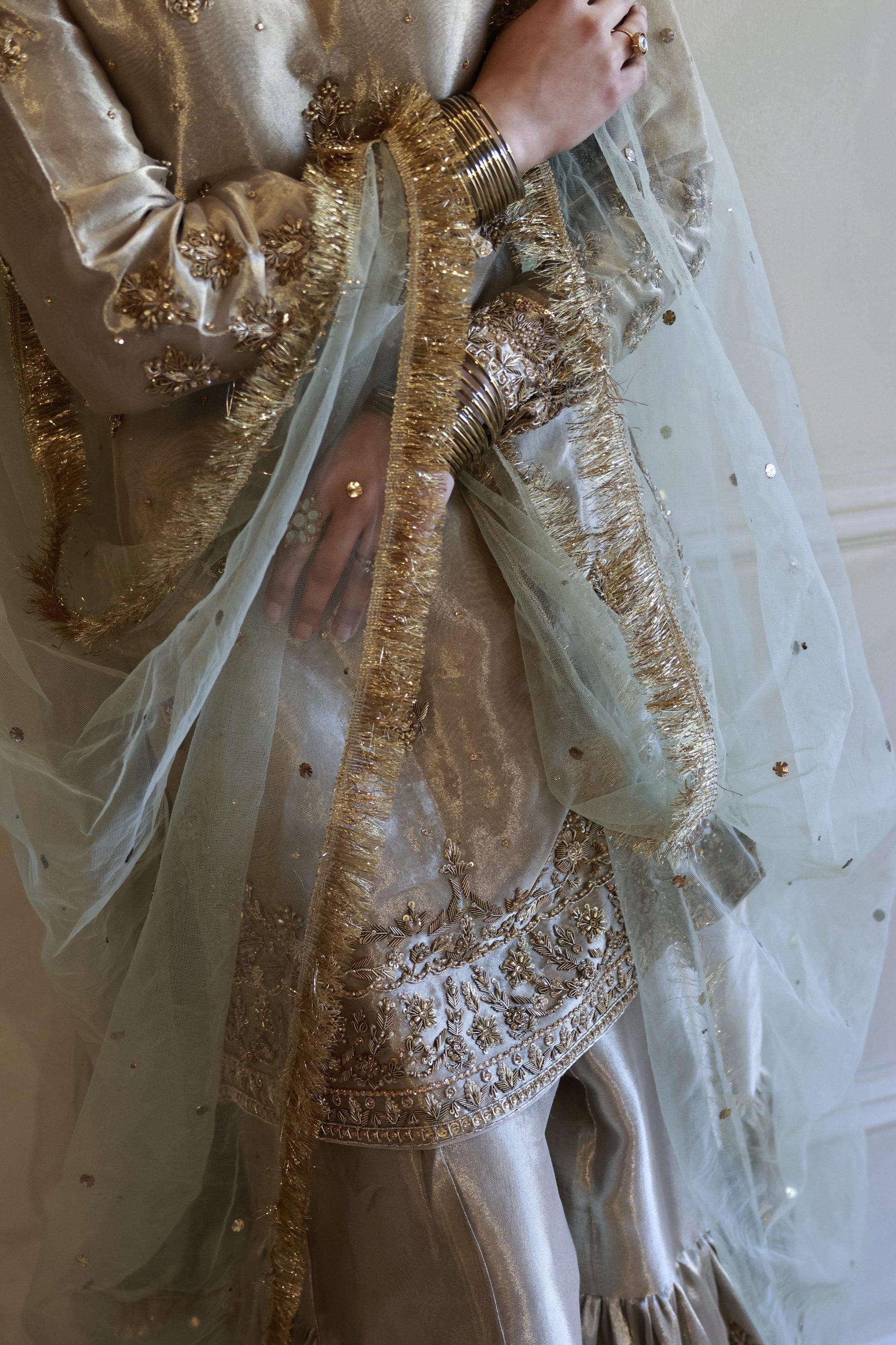 The ensemble is paired with a traditional flared gharara, finished with subtle embellishment that adds movement and ceremonial grace. A sheer net sage green dupatta with fine gold detailing completes the look, draping beautifully to frame the silhouette without overwhelming it.
