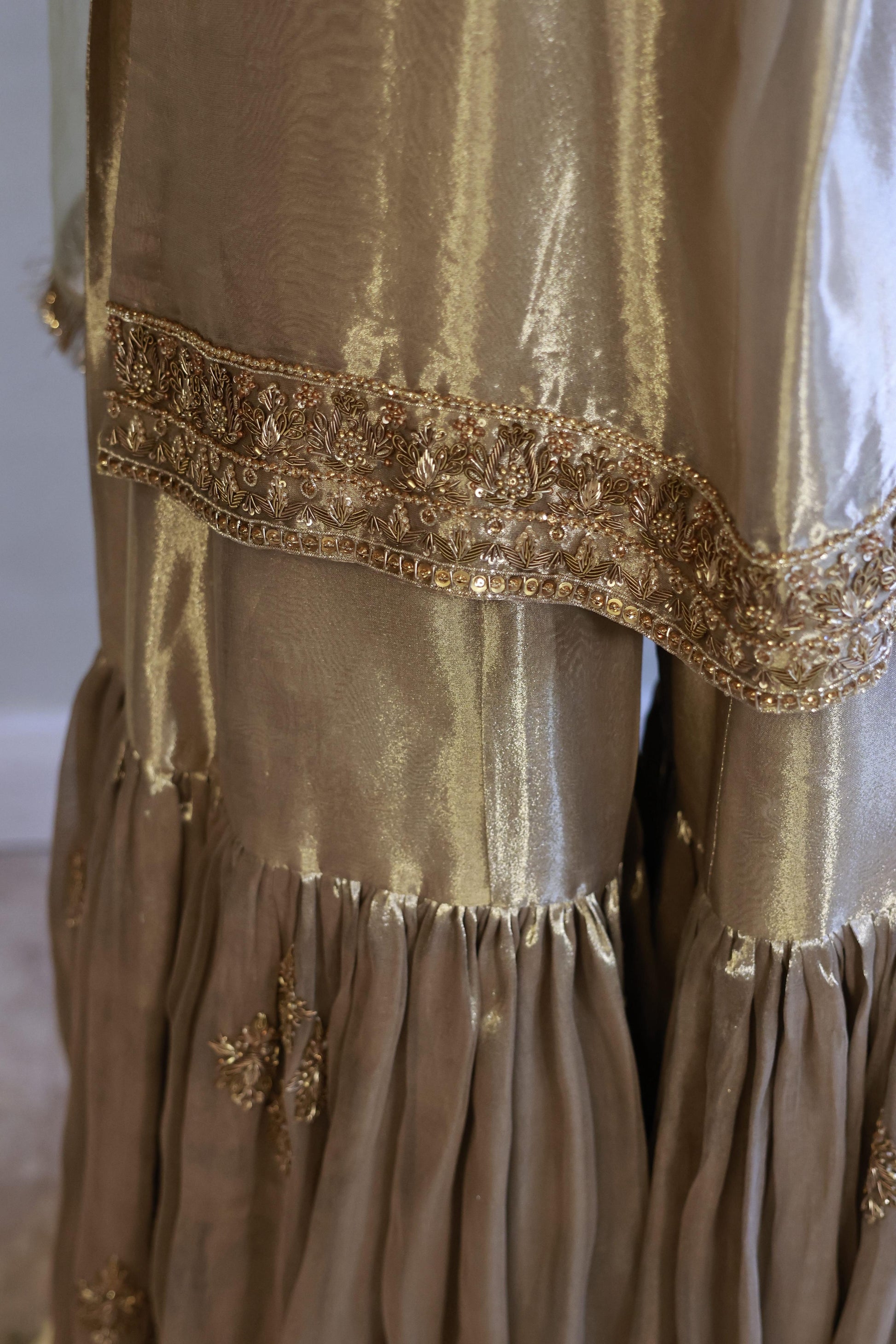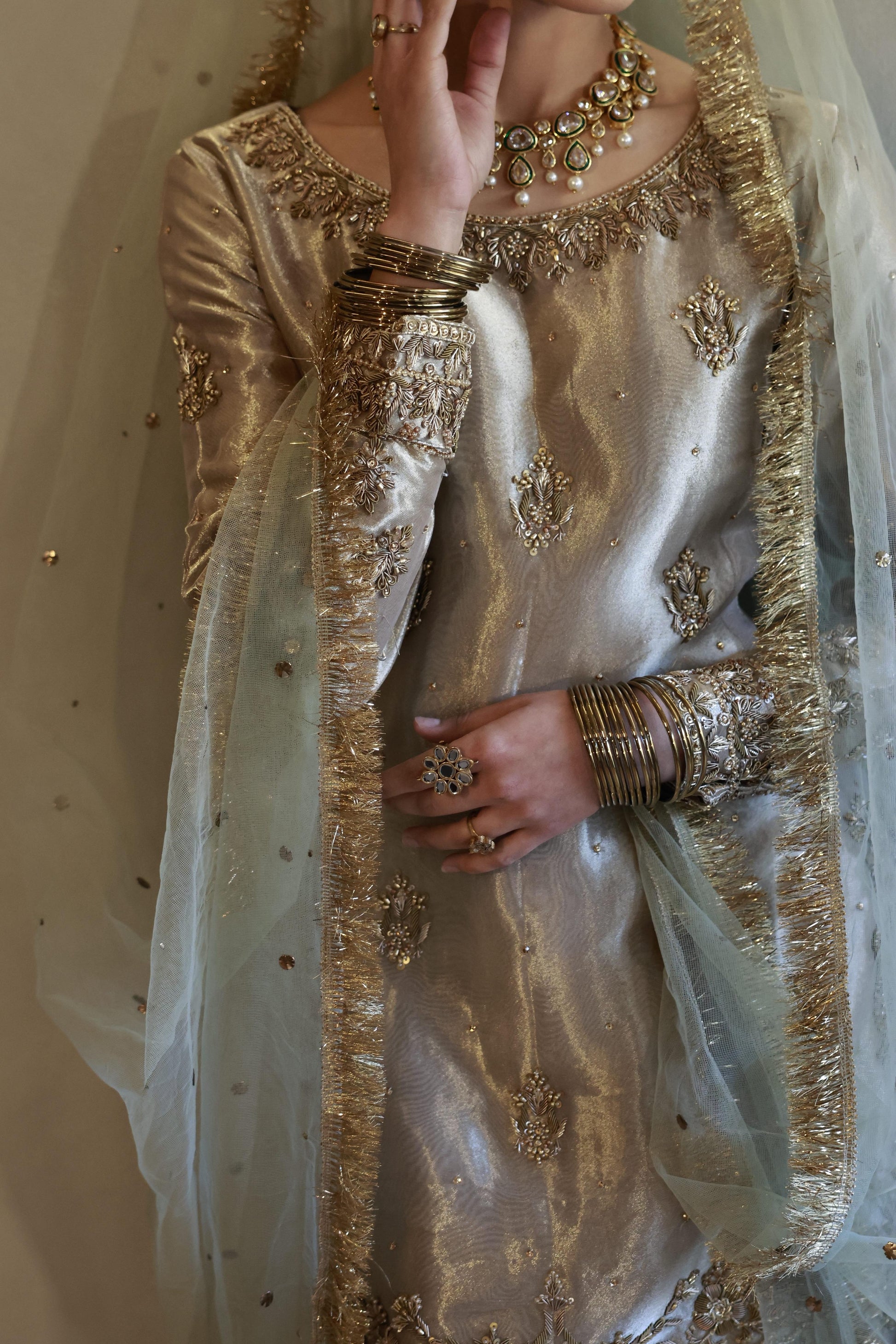 Ethereal and timeless, this champagne tissue nikkah ensemble is designed for the bride who prefers quiet luxury over excess. Crafted in a luminous tissue silk-blend fabric, the straight kameez is adorned with delicate gold embroidery, featuring softly placed motifs across the body and a richly detailed embroidered hem that anchors the look with elegance.