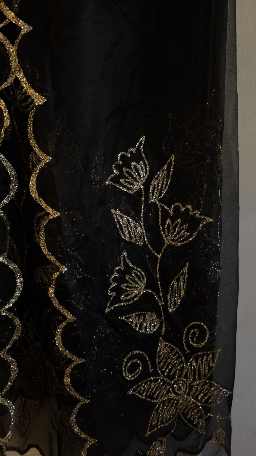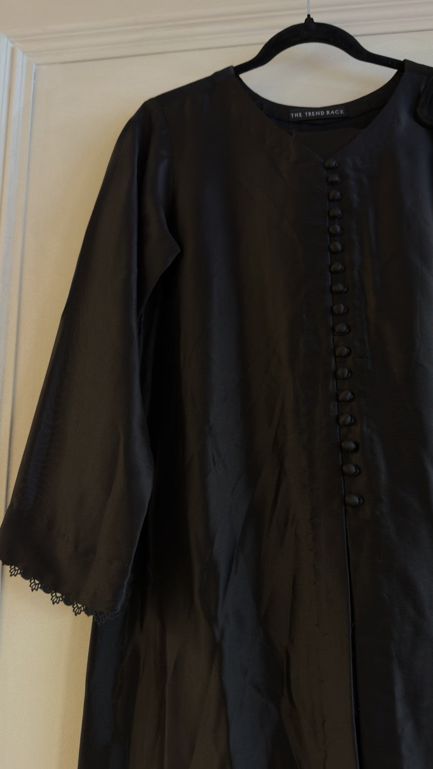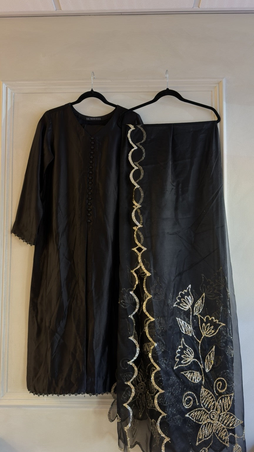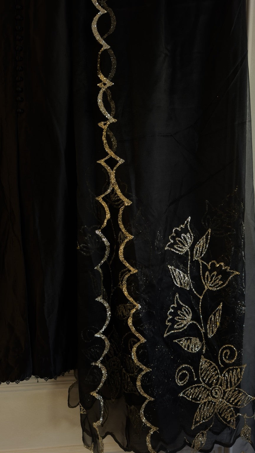 Sheesha Silk black long kameez featuring buttons, accompanied by trousers and a signature dupatta adorned with gold detailing.