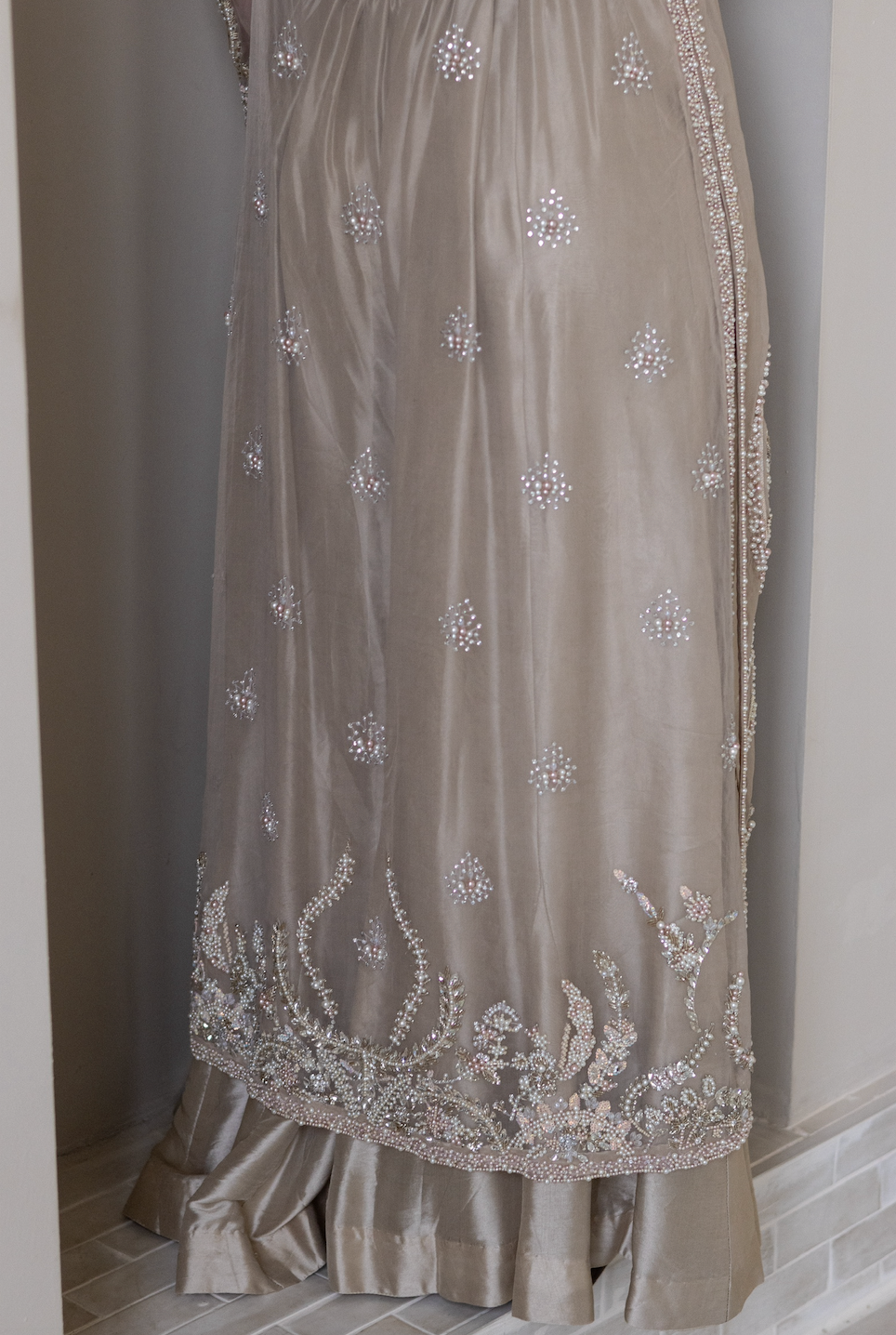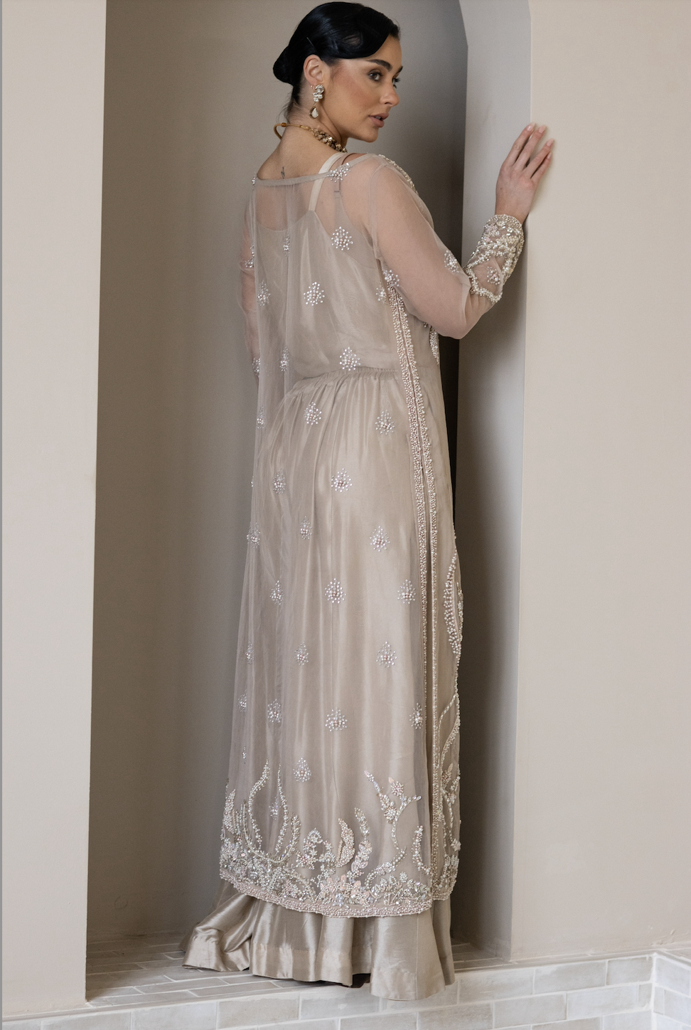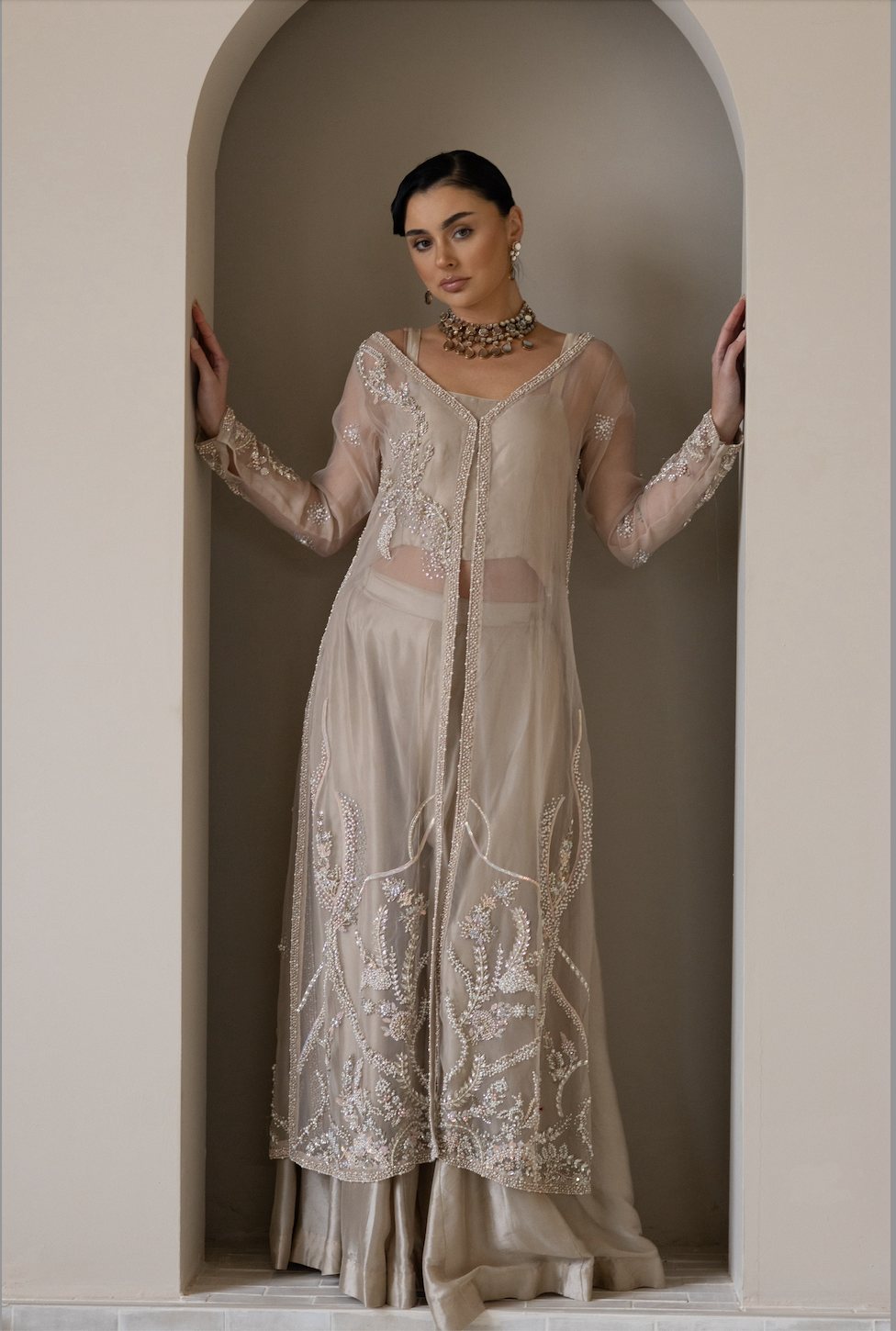 Paired with luxurious sheesh silk sharara, creating sophistication. To complete the look, the set includes a plain organza dupatta, providing an effortless balance of grace and simplicity.