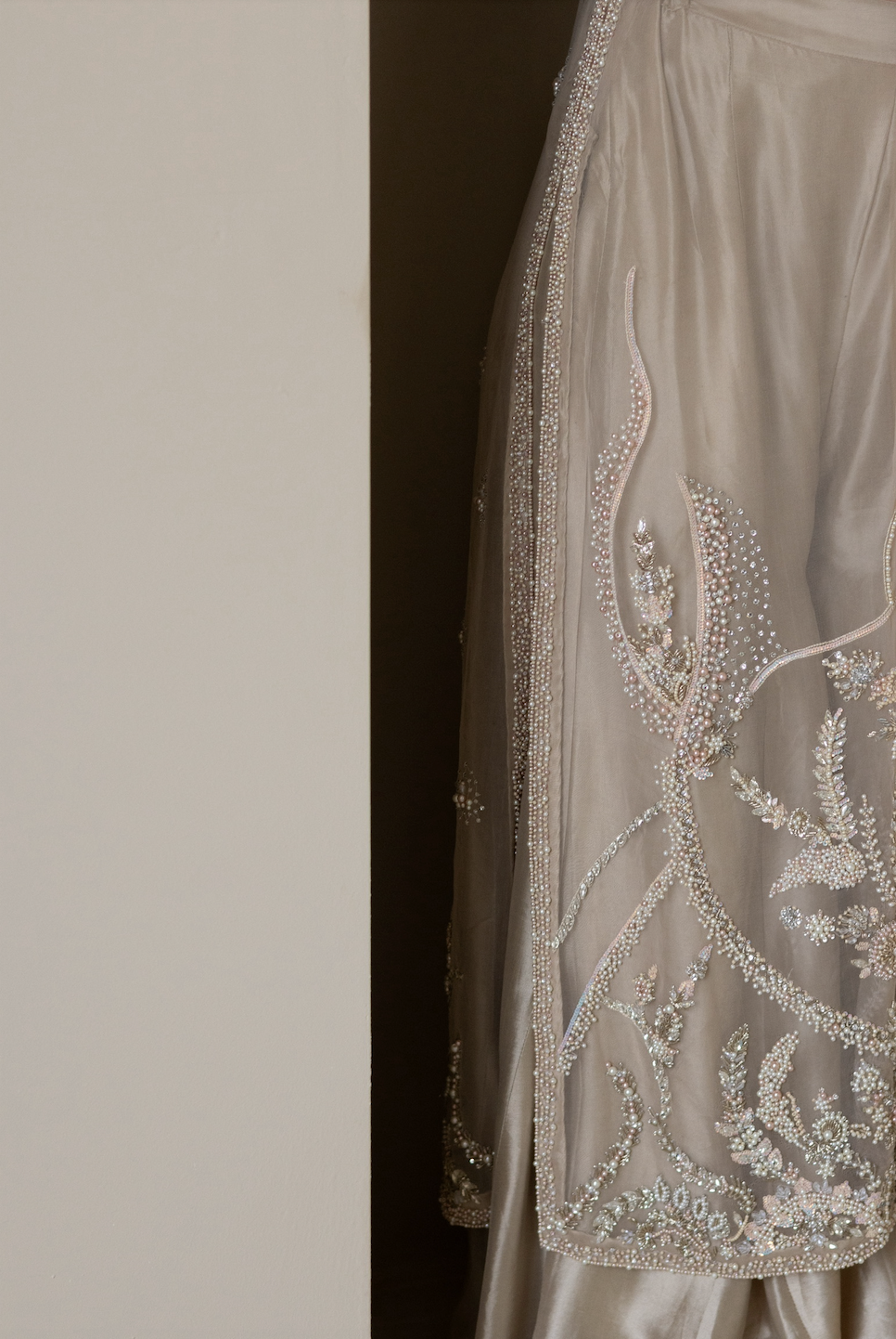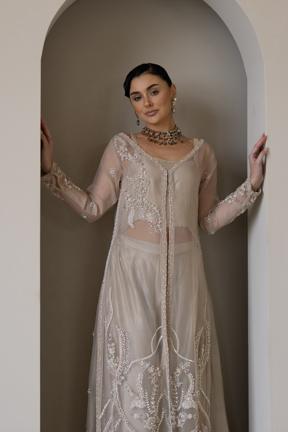 Experience the perfect fusion of modern elegance and timeless charm with Pealry. The soft ivory nude organza jacket features exquisite hand-crafted modern embellishments, adding a contemporary twist to the classic silhouette. The delicate detailing enhances the overall design, creating a refined yet bold statement piece.