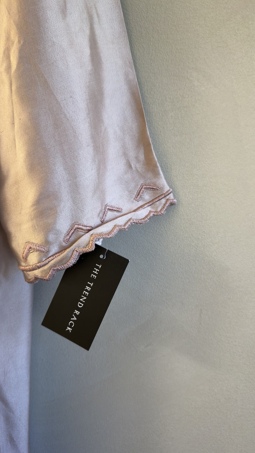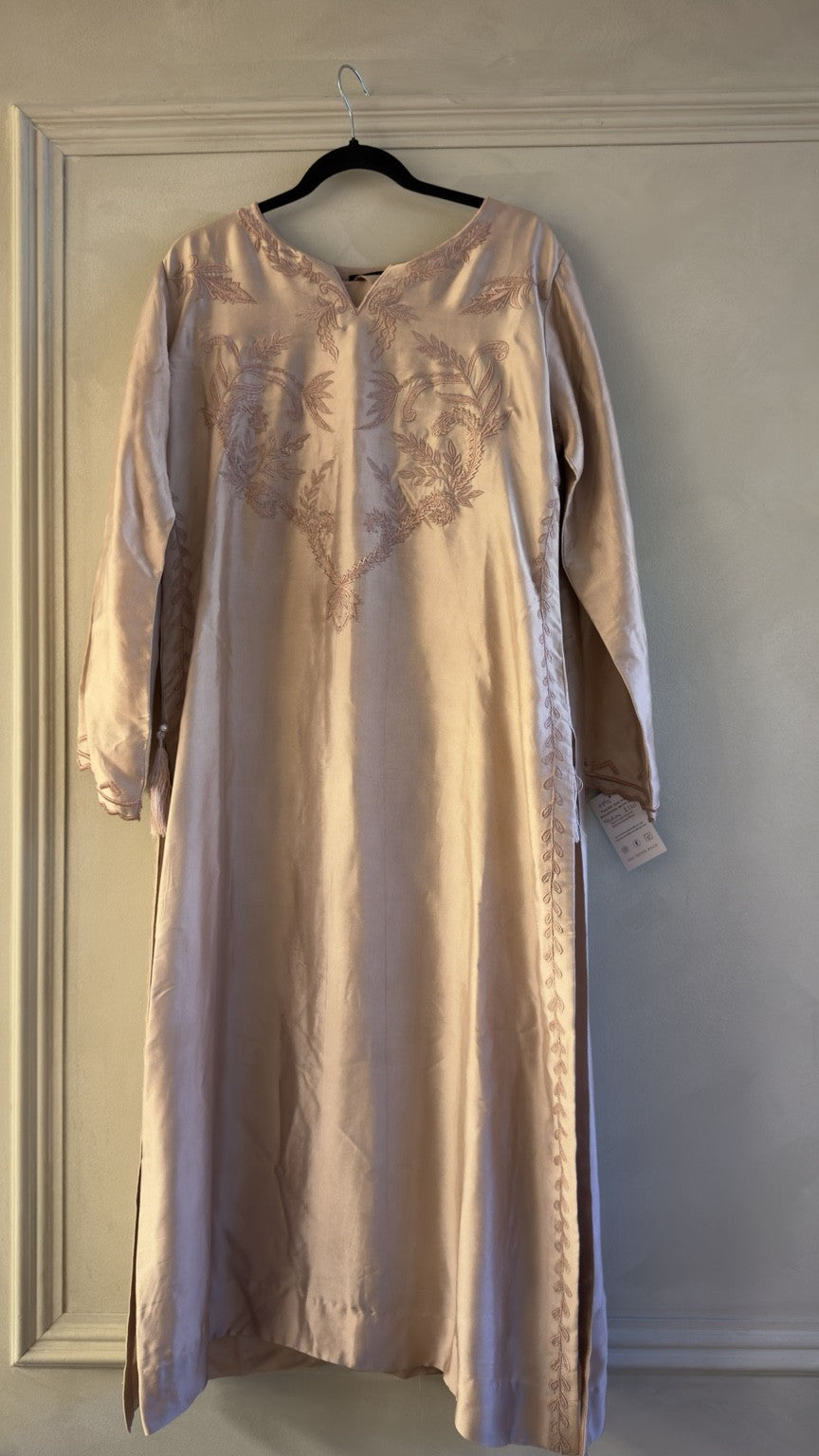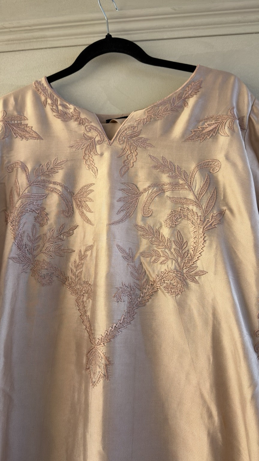 The PP10 features intricate hand-thread work embroidery on the neckline, side seam, and sleeves, showcasing advanced craftsmanship. The kameez measures 47 inches in length, providing an elegant silhouette. Accompanied by a straight plain sheesh silk trouser and khadi silk plain dupatta, this ensemble offers a sophisticated aesthetic suitable for various occasions.