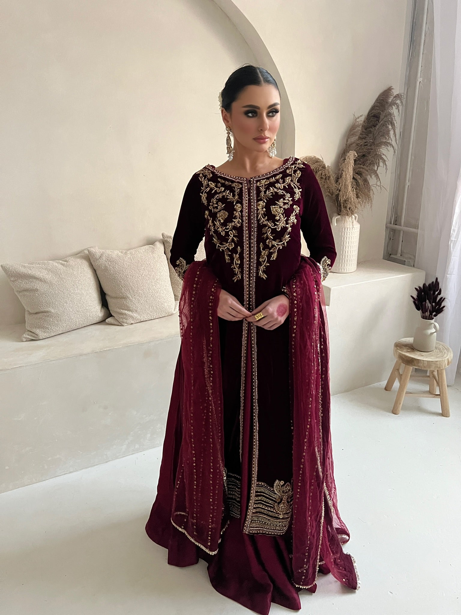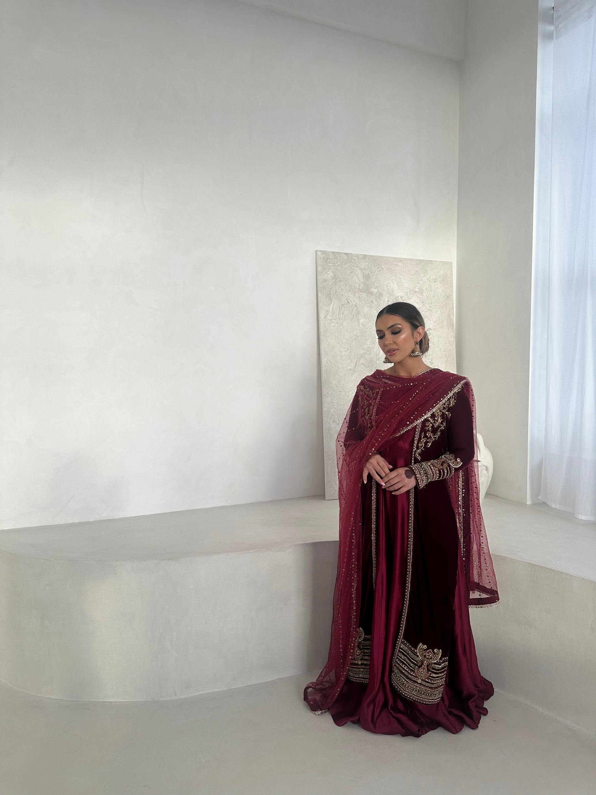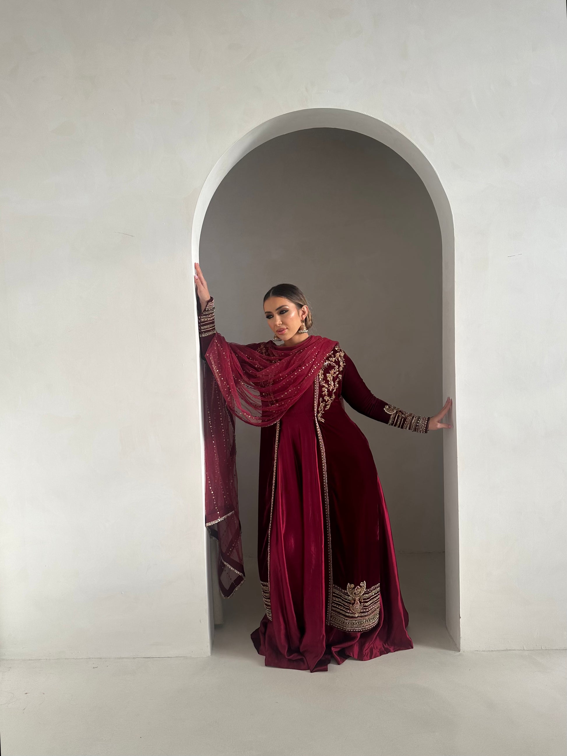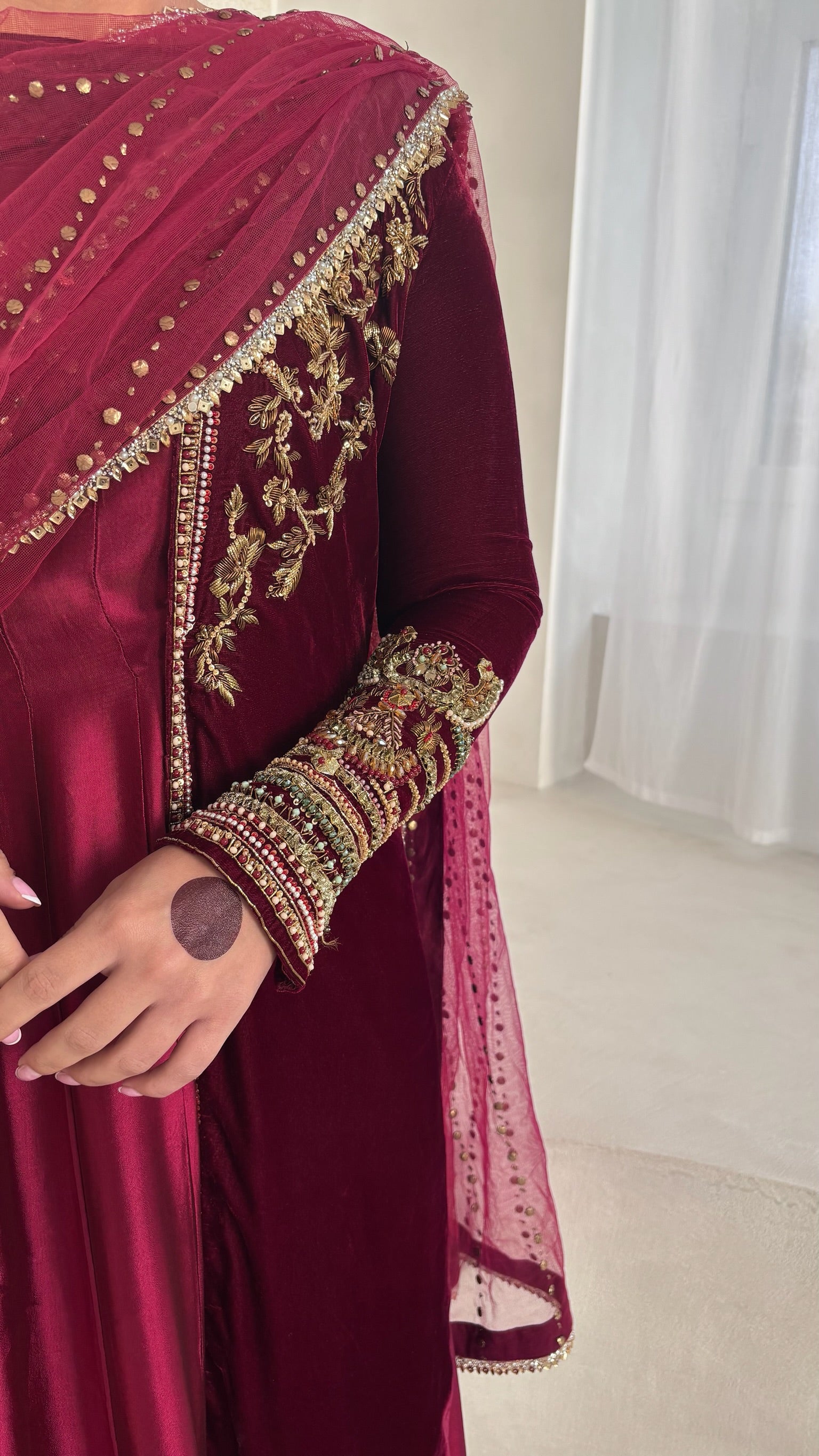 Maroon velvet jacket with hand signature embellishment, embroidered with a mix of gota, nakshi, kora and dabka