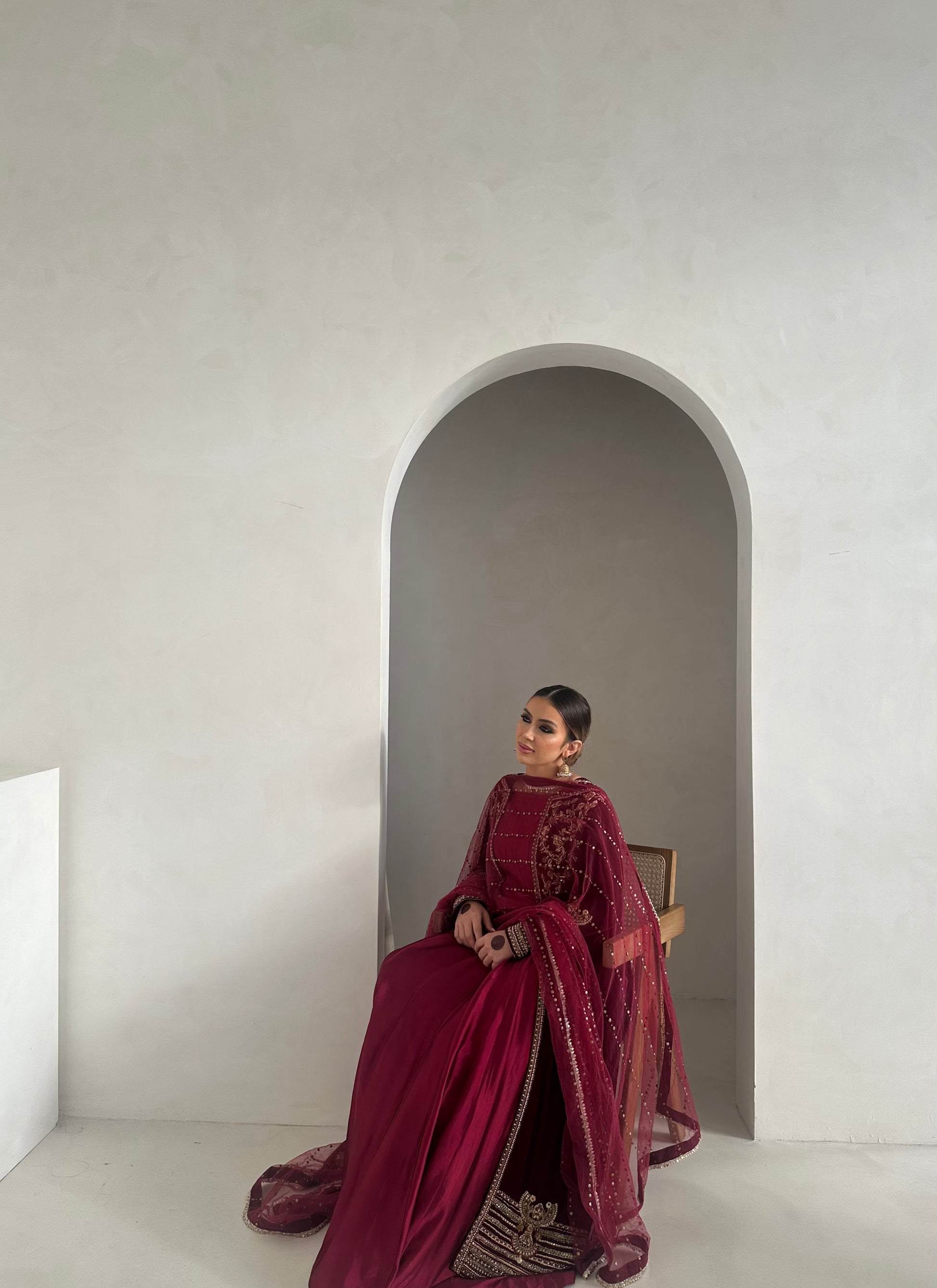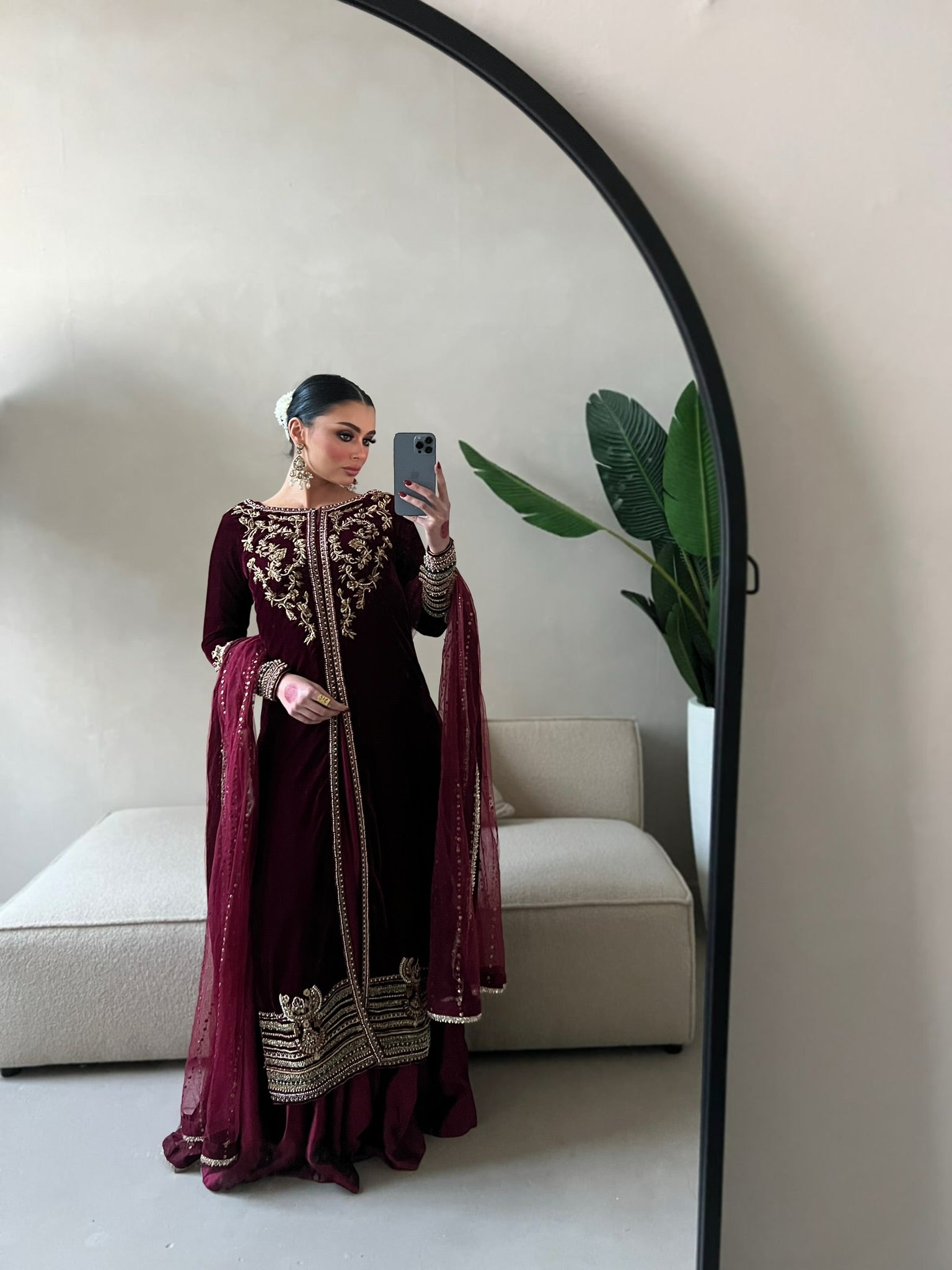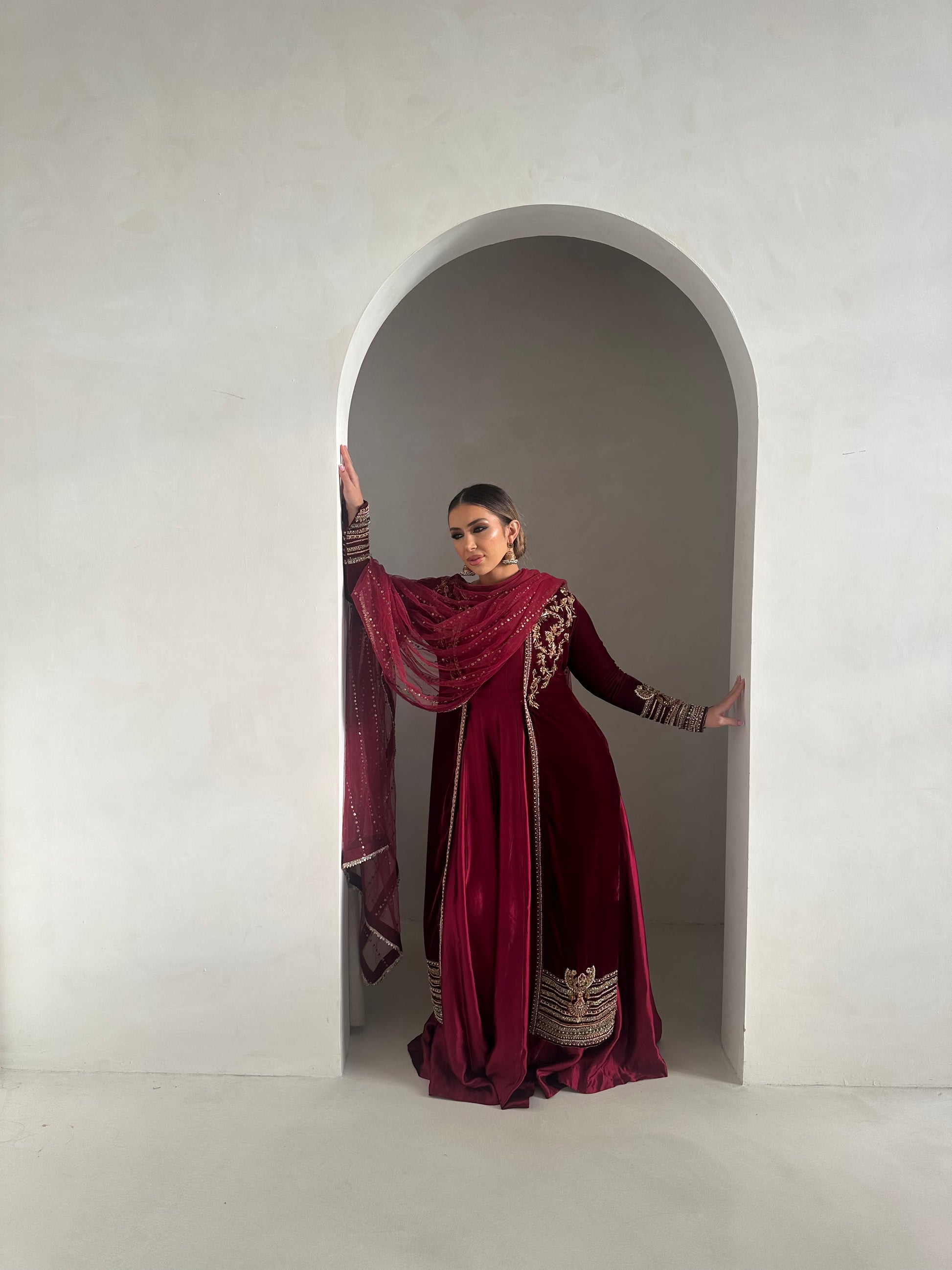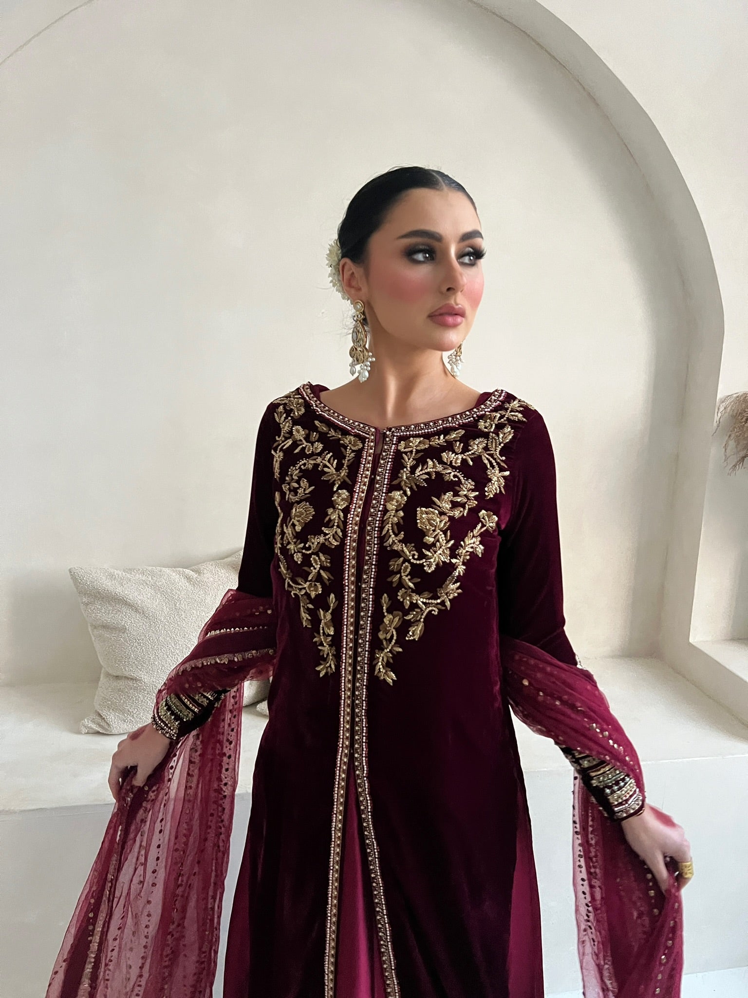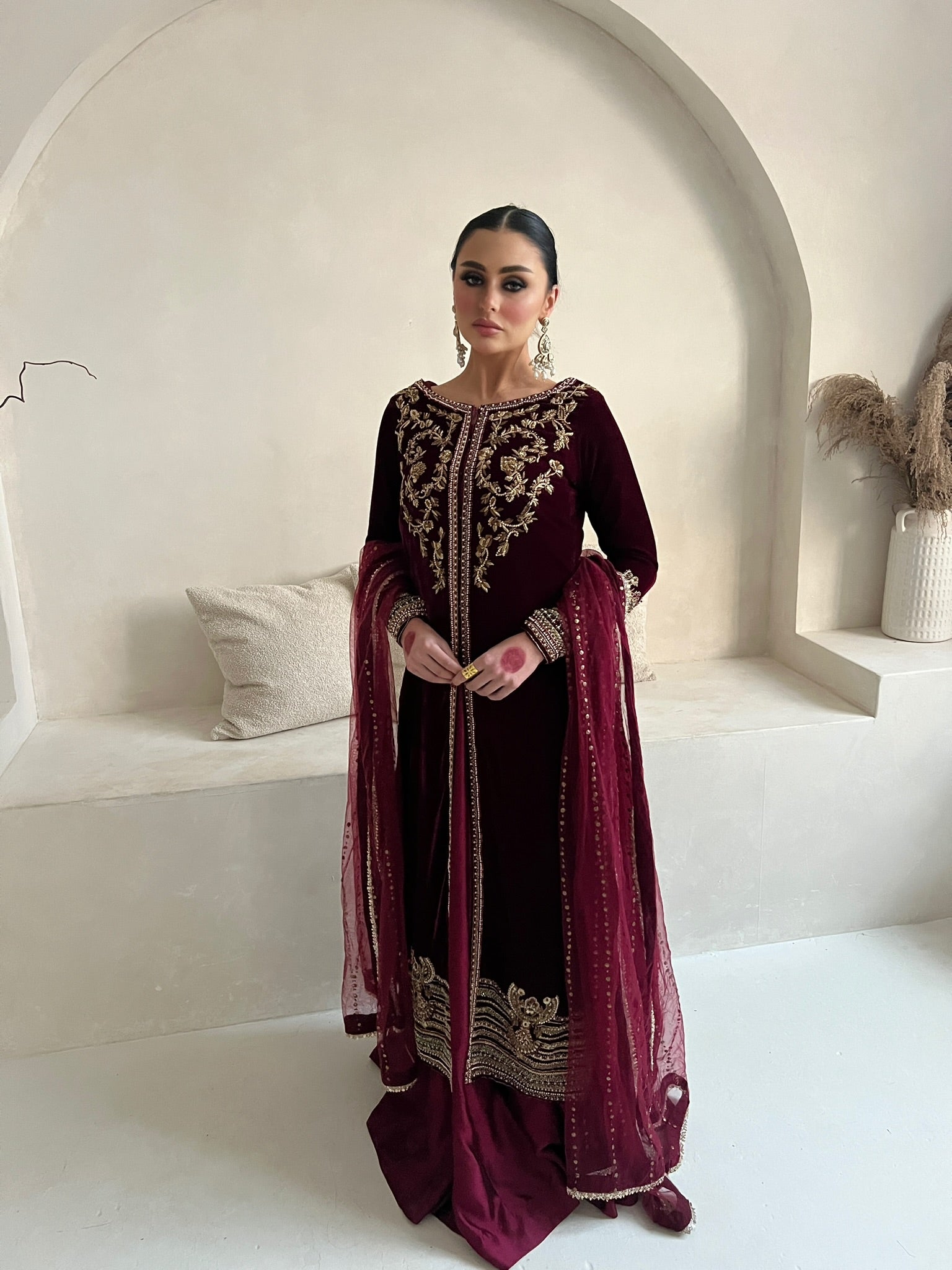 Maroon velvet jacket with hand signature embellishment, embroidered with a mix of gota, nakshi, kora and dabka