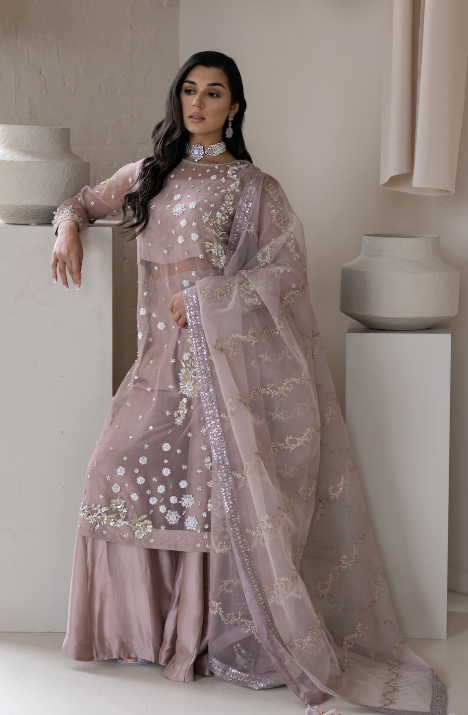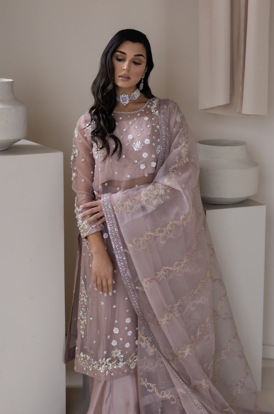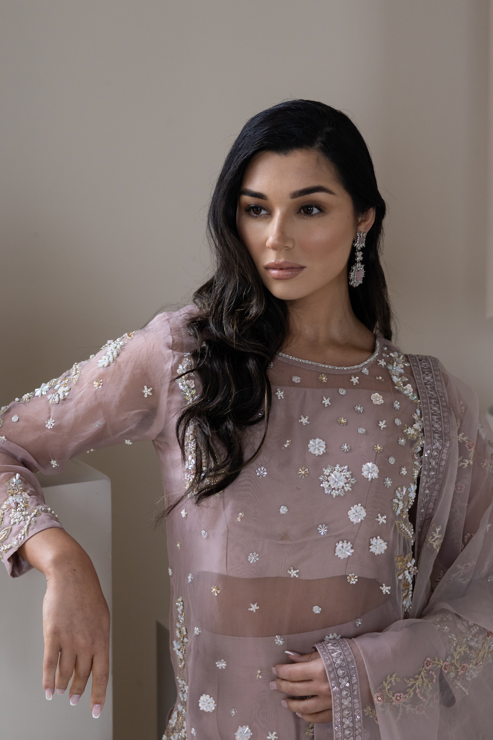 Exude elegance in our Rose, featuring intricate embellishments that elevate its delicate design. Paired with luxurious sheesh silk sharara pants, this design is completed with a stunning organza dupatta, beautifully embroidered with floral motifs for a graceful finish.