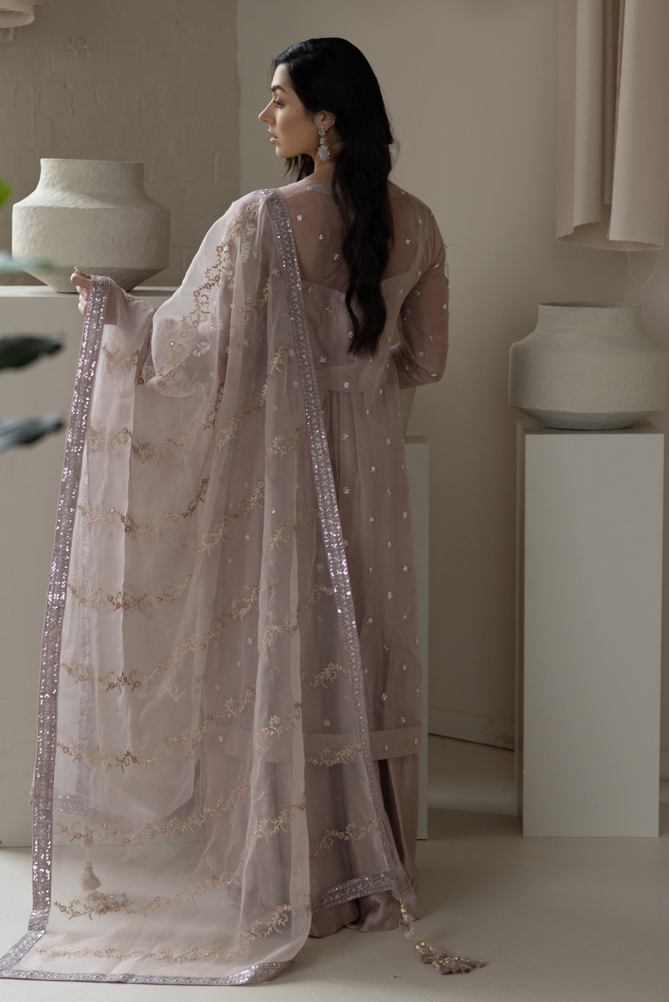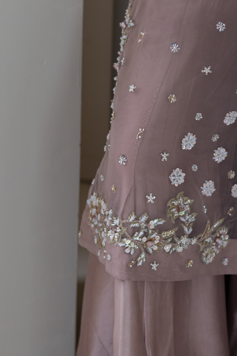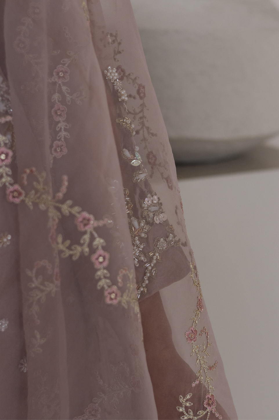 Exude elegance in our Rose, featuring intricate embellishments that elevate its delicate design. Paired with luxurious sheesh silk sharara pants, this design is completed with a stunning organza dupatta, beautifully embroidered with floral motifs for a graceful finish.
