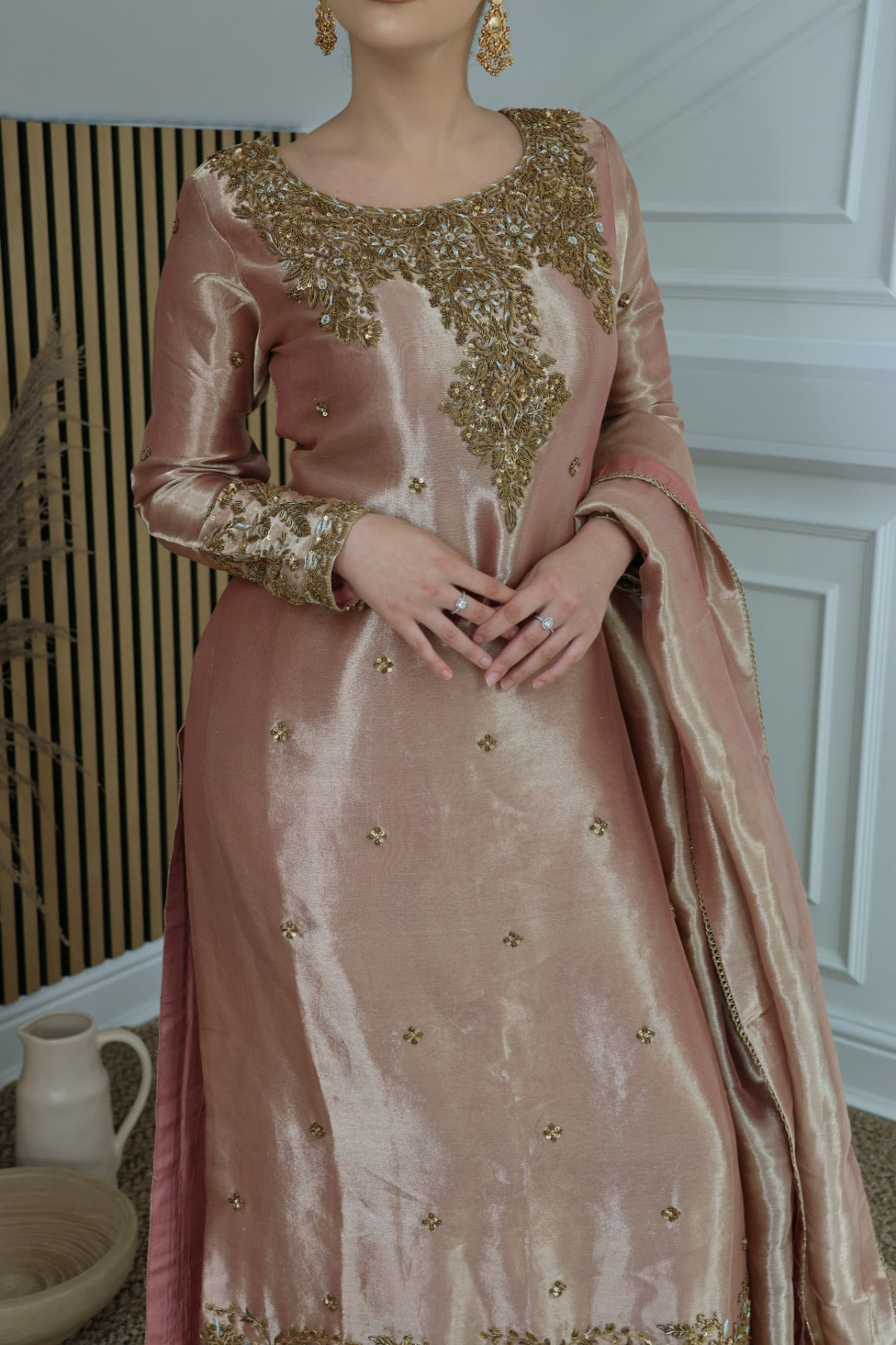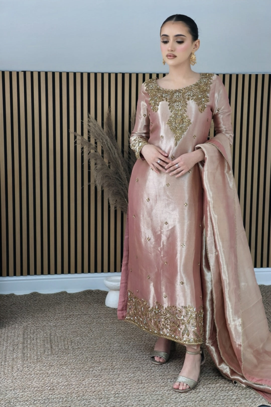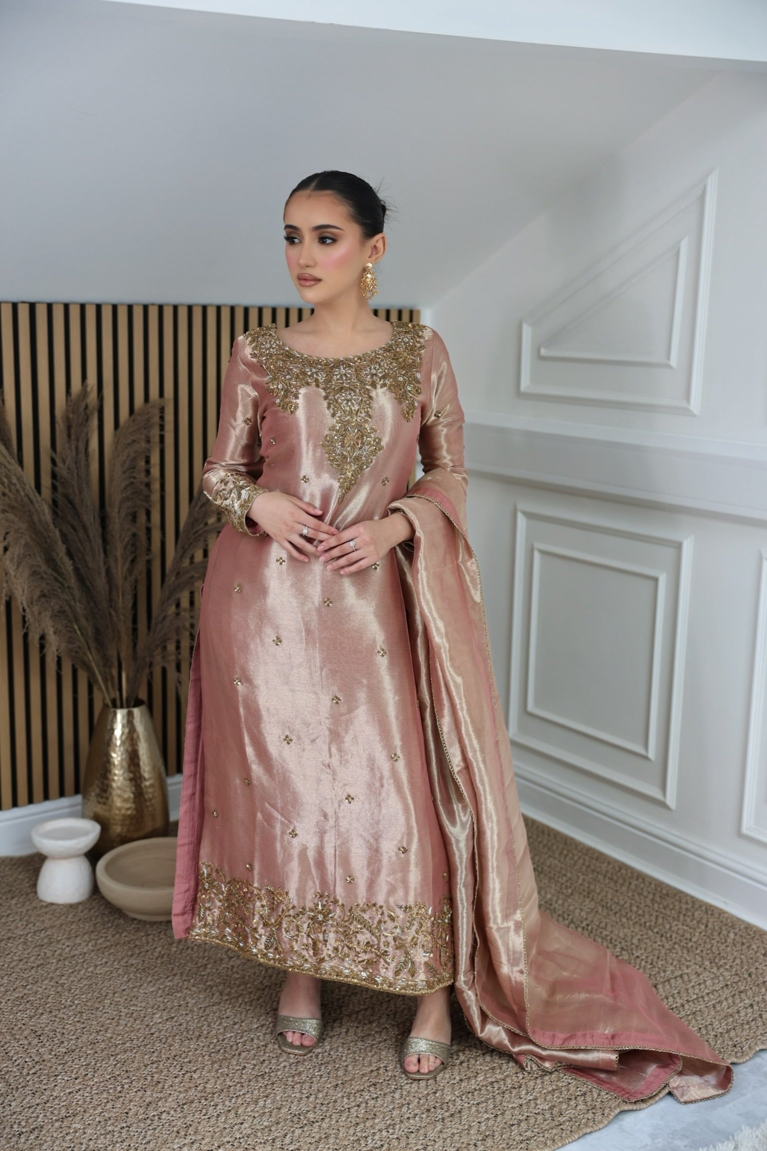 Rose gold tissue A-line kameez with hand-embellished neckline, accompanied by a tissue dupatta featuring trim lace and straight tissue trousers.