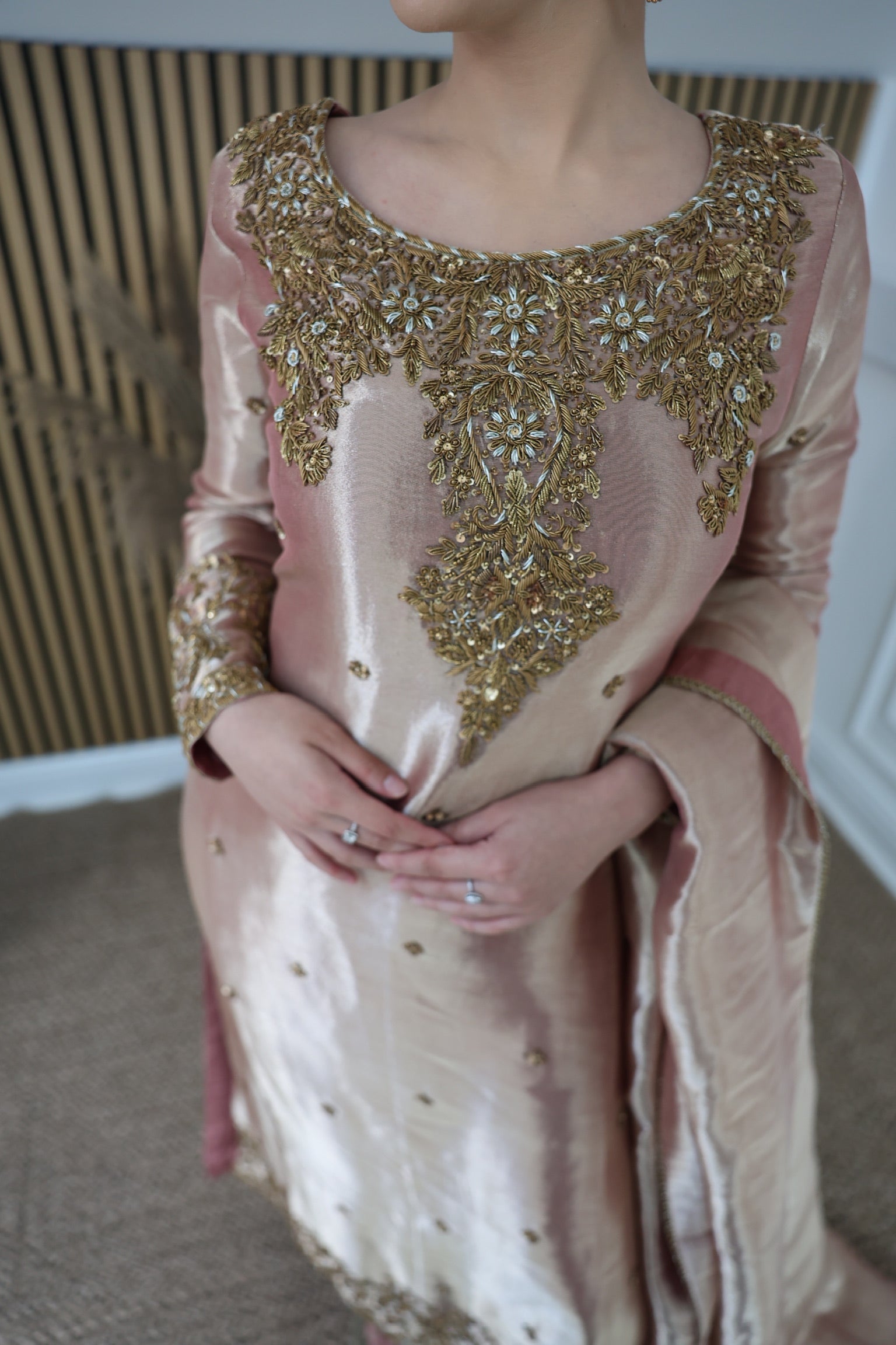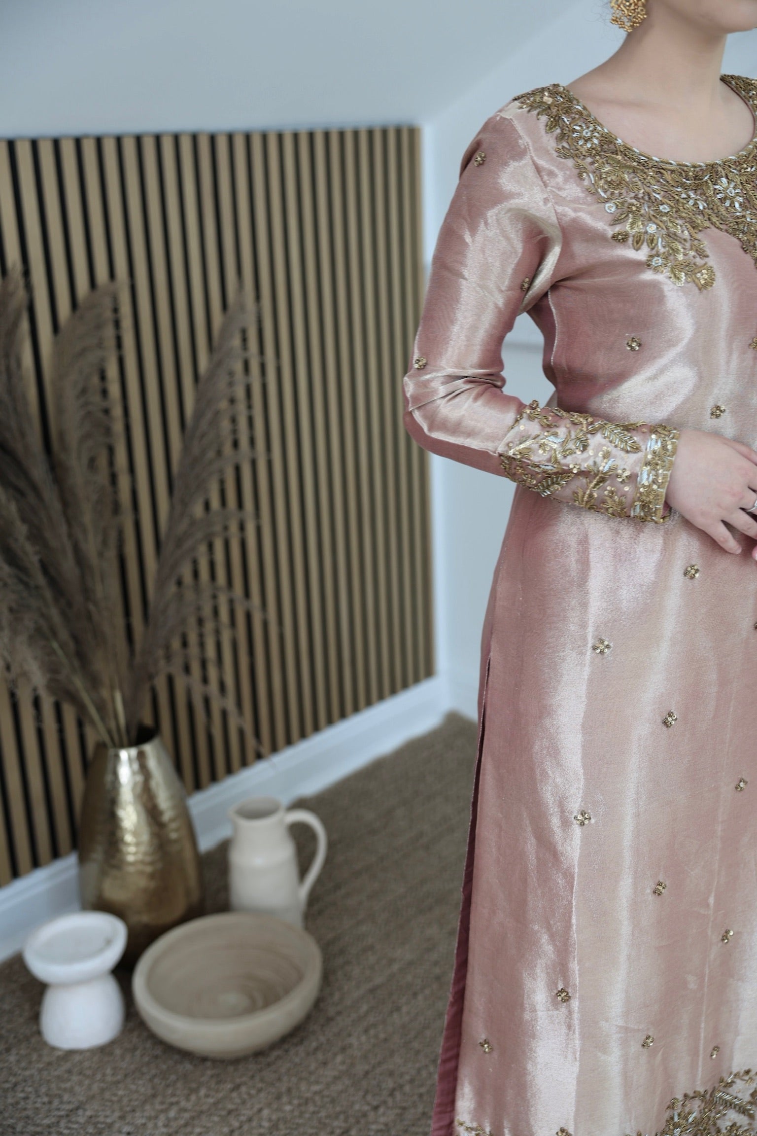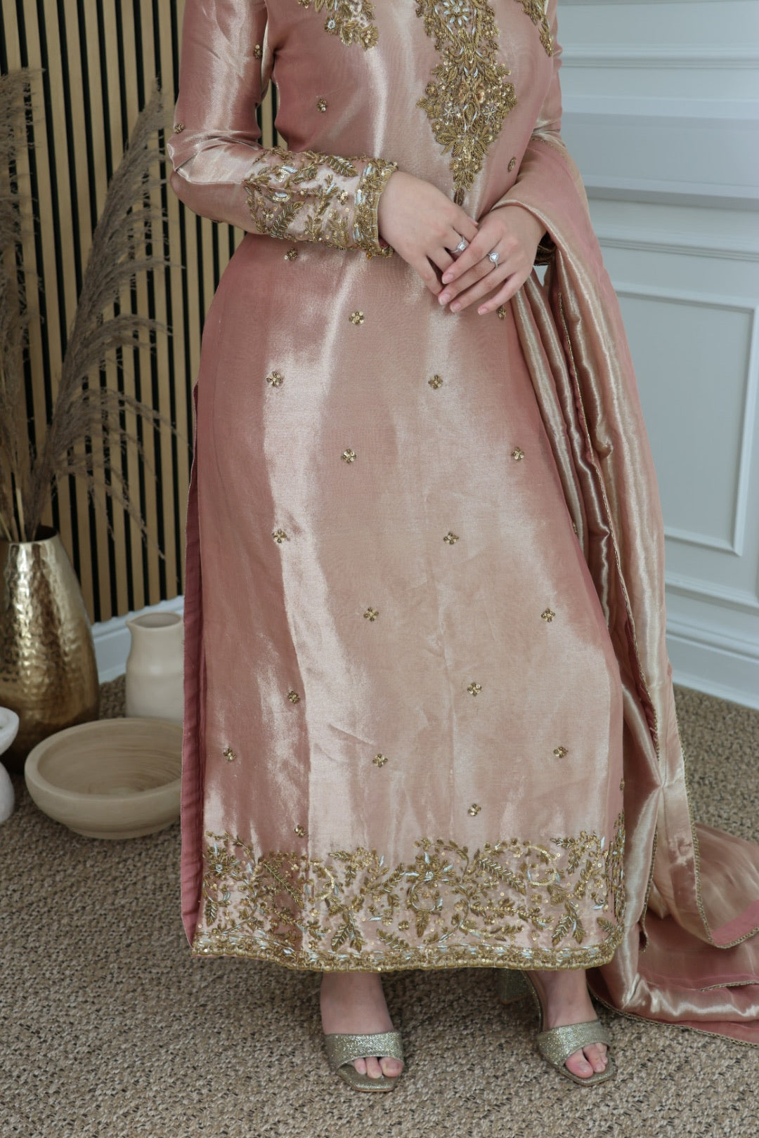 Rose gold tissue A-line kameez with hand-embellished neckline, accompanied by a tissue dupatta featuring trim lace and straight tissue trousers.