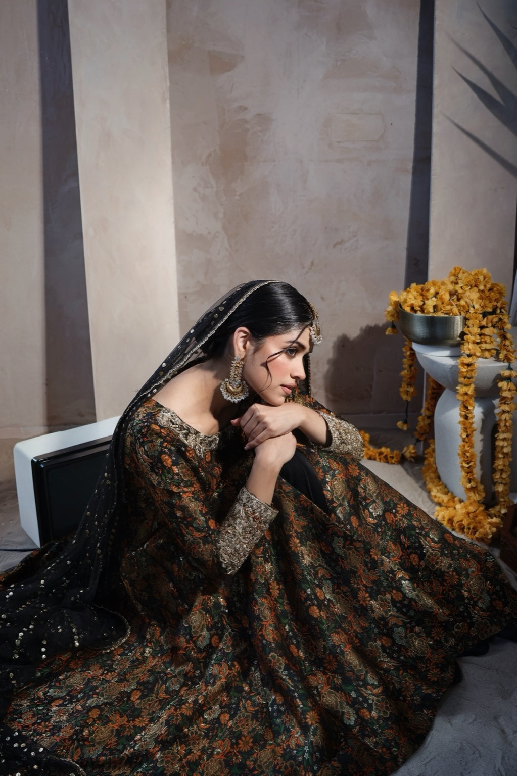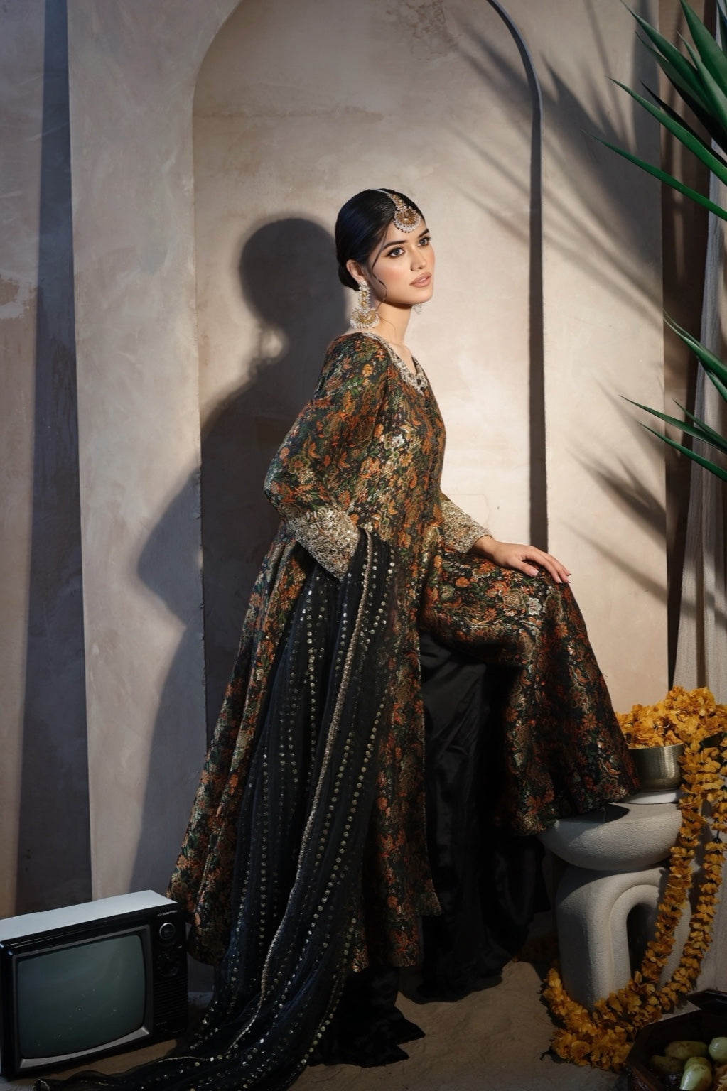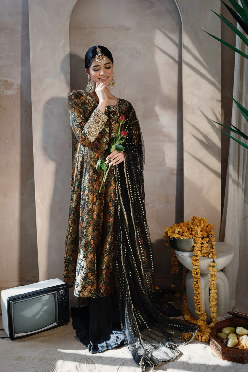 A timeless black Banarsi panel (kaliyan) dress featuring a detailed neckline and sleeves, paired with a Russian silk flared panel sharara for graceful volume. The look is completed with a net dupatta adorned with Kamdani work, creating the perfect blend of classic charm and modern sophistication.