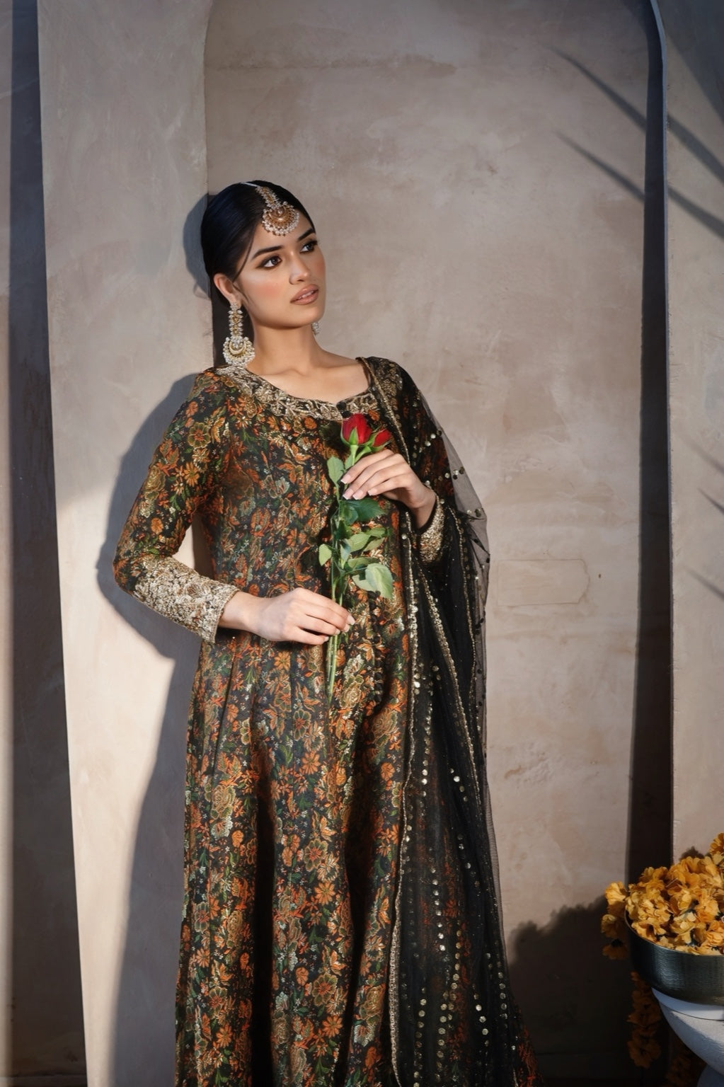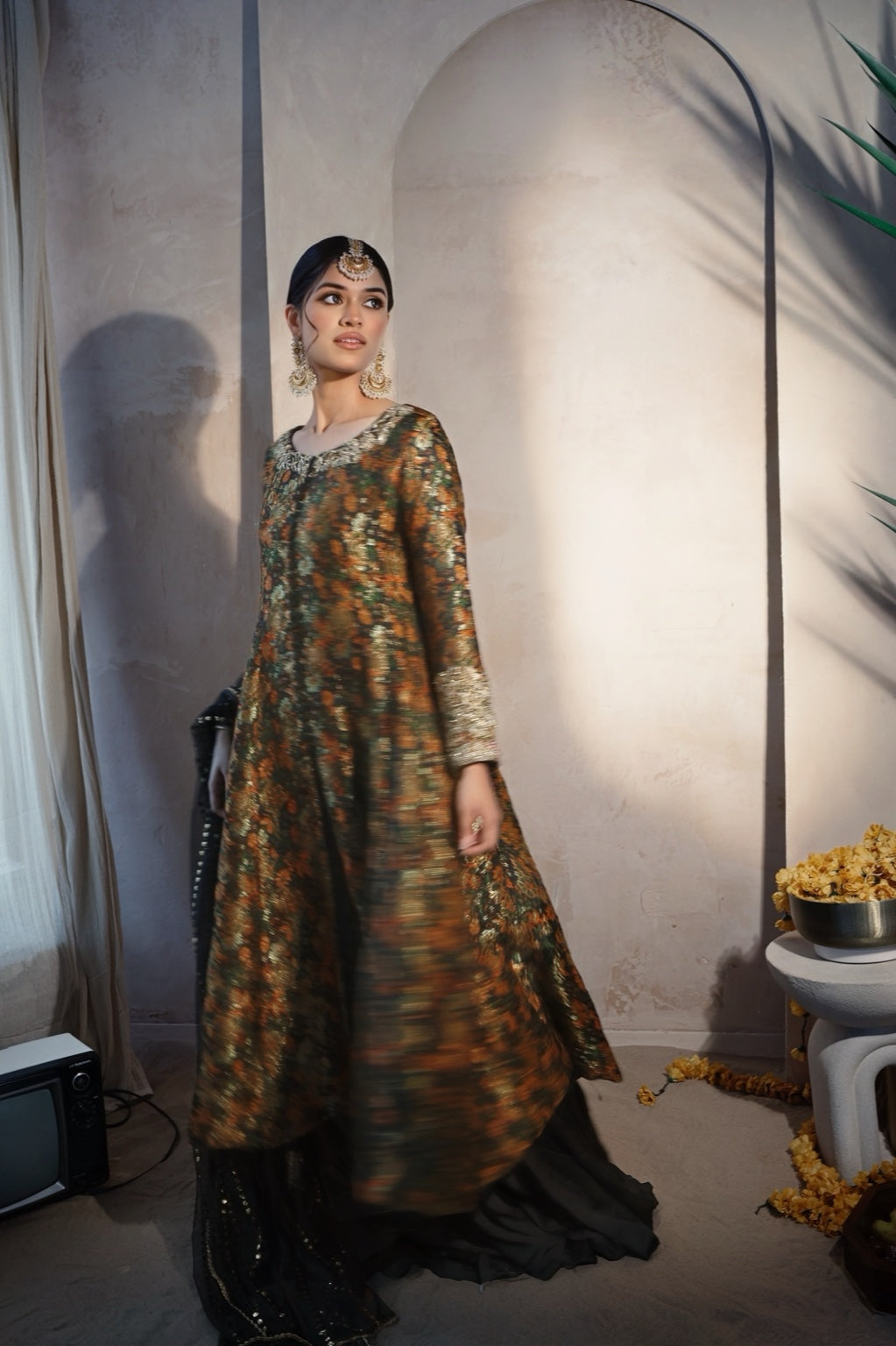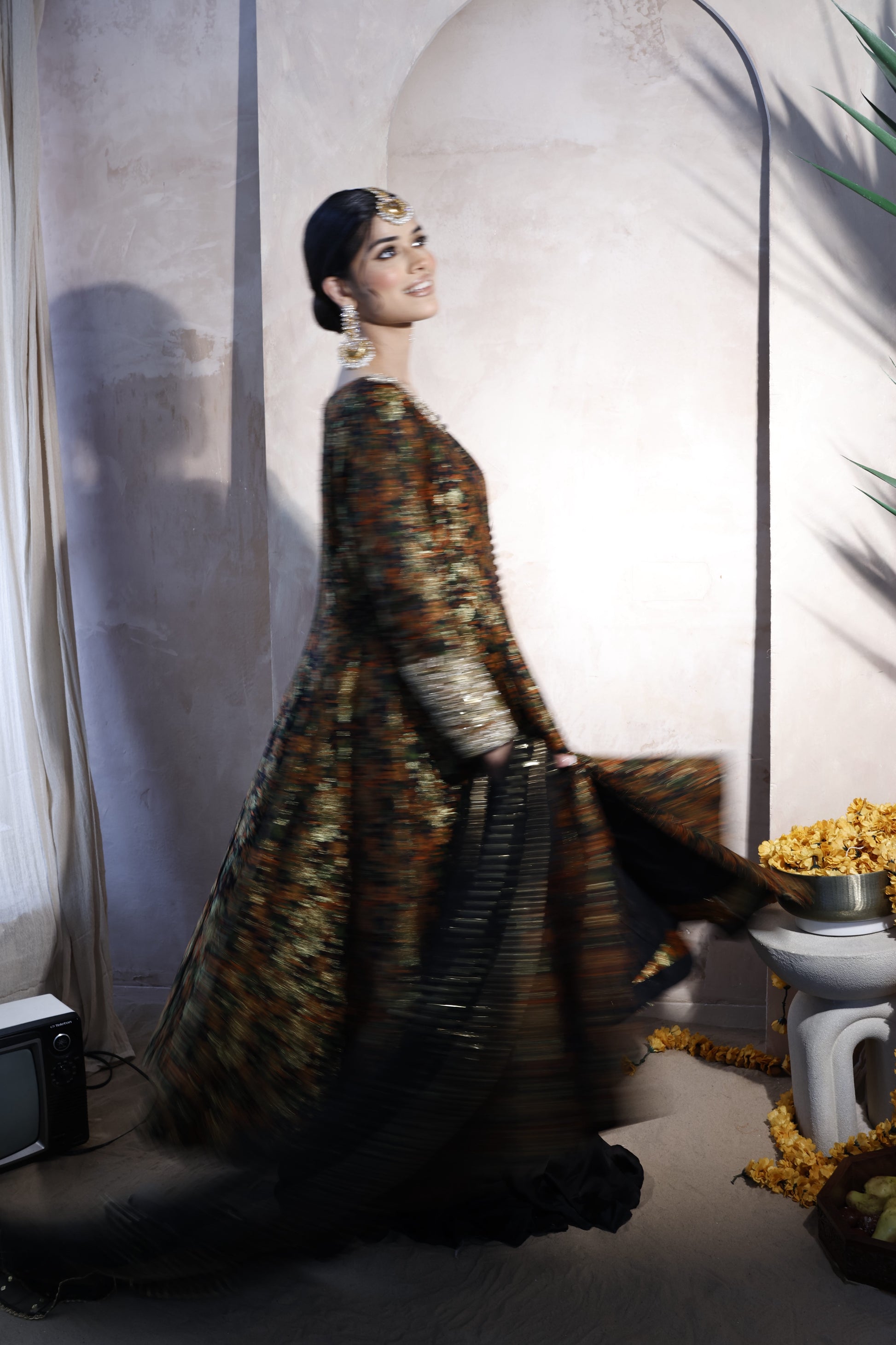 A timeless black Banarsi panel (kaliyan) dress featuring a detailed neckline and sleeves, paired with a Russian silk flared panel sharara for graceful volume. The look is completed with a net dupatta adorned with Kamdani work, creating the perfect blend of classic charm and modern sophistication.