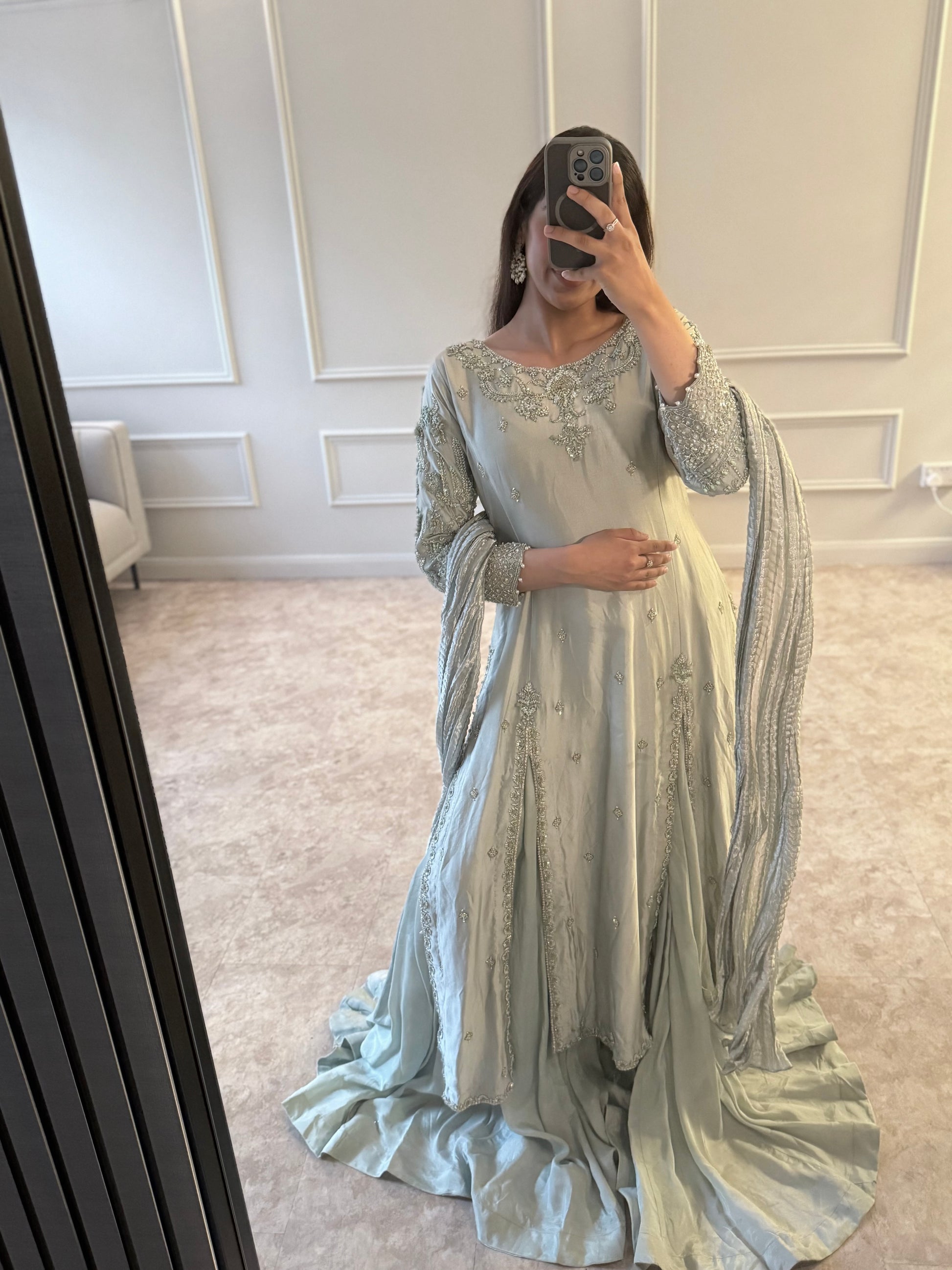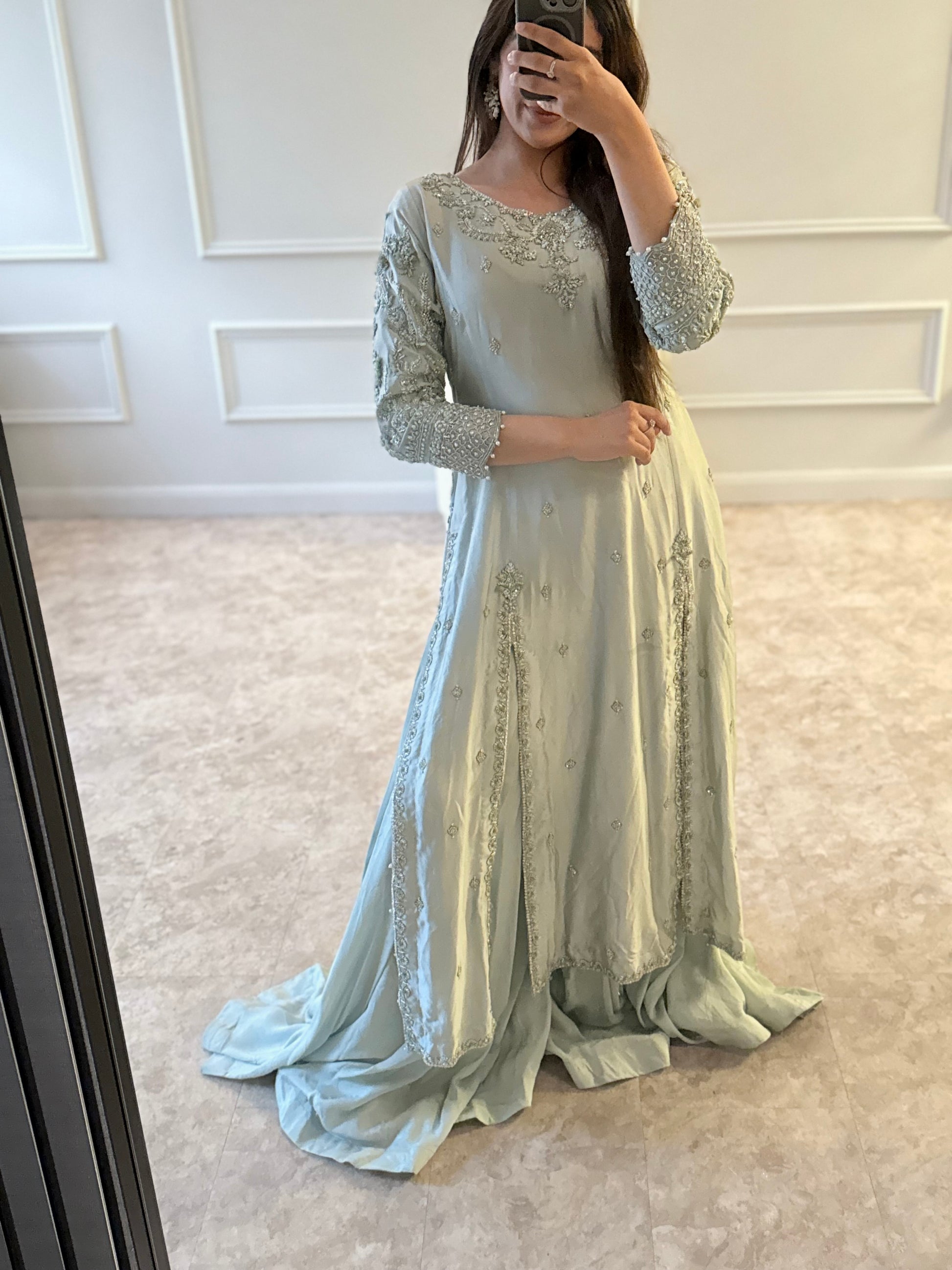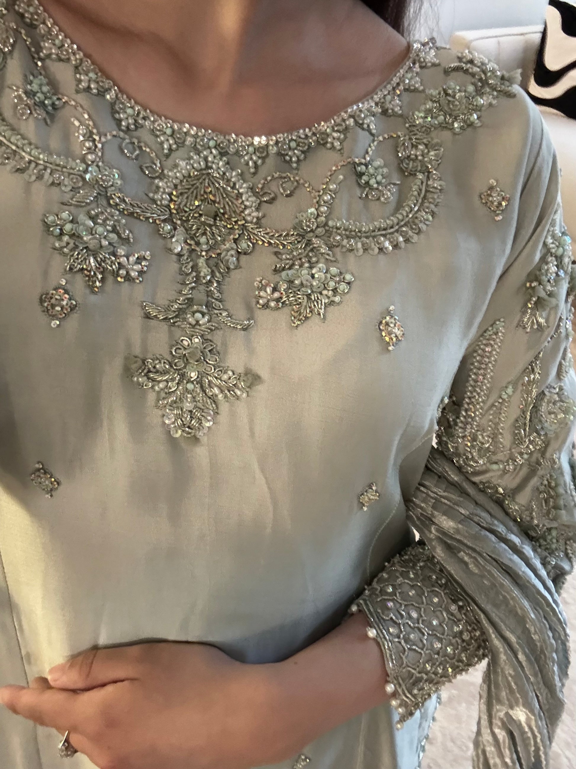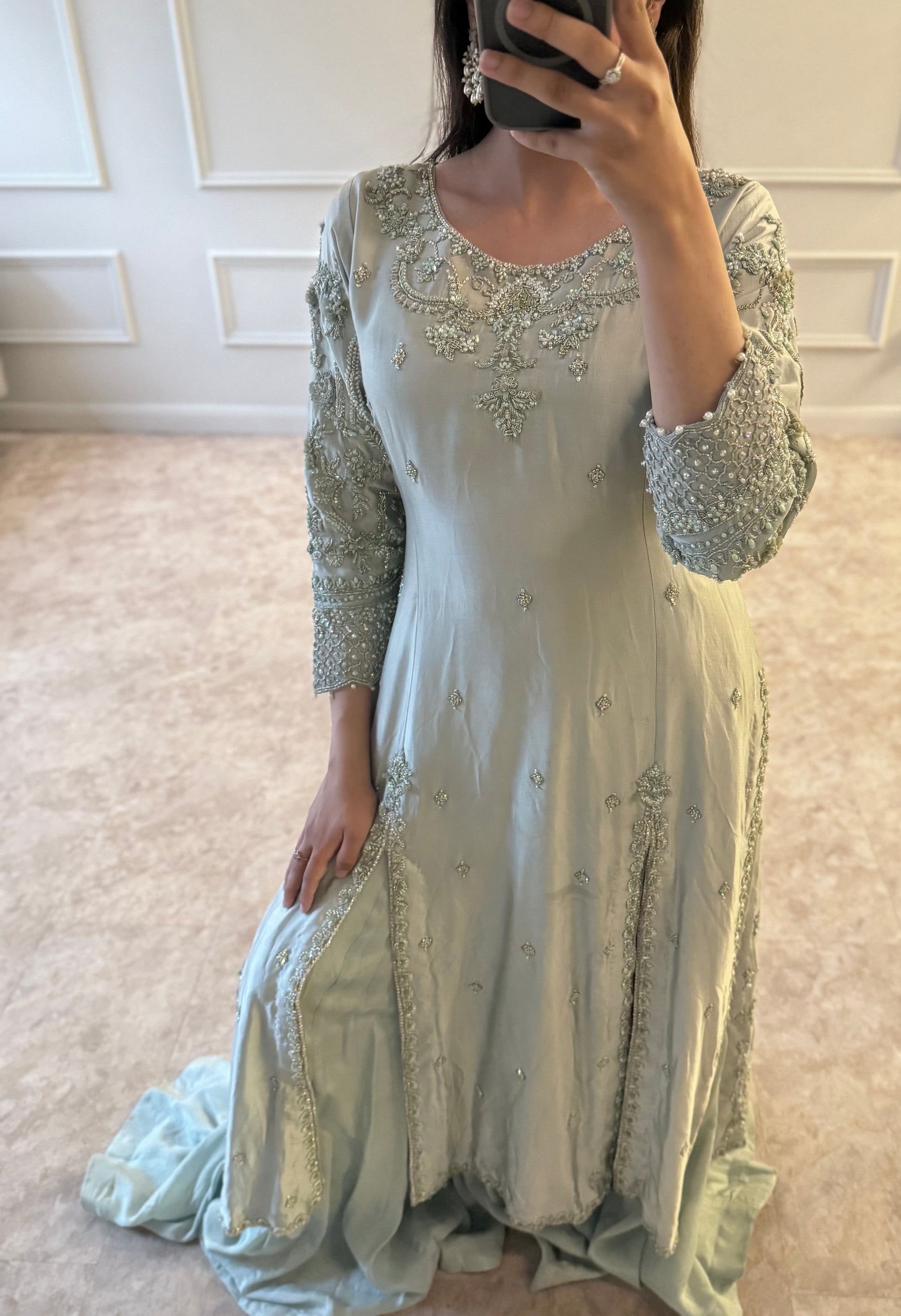 Grace meets glamour in this exquisitely crafted dusky blue long kameez dress with unique cutline , made from premium sheesh silk that drapes like a dream. Designed for the modern muse, the silhouette is adorned with contemporary hand embellishments, adding a subtle sparkle to every step.